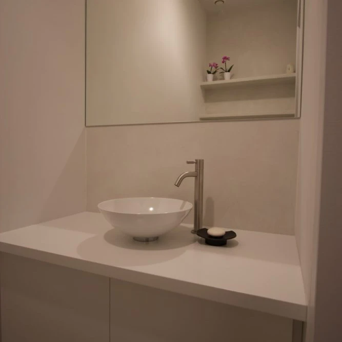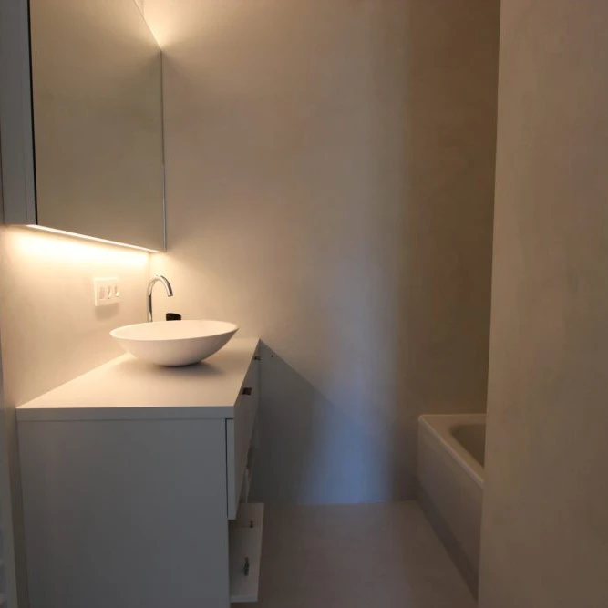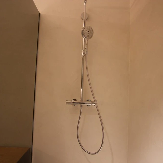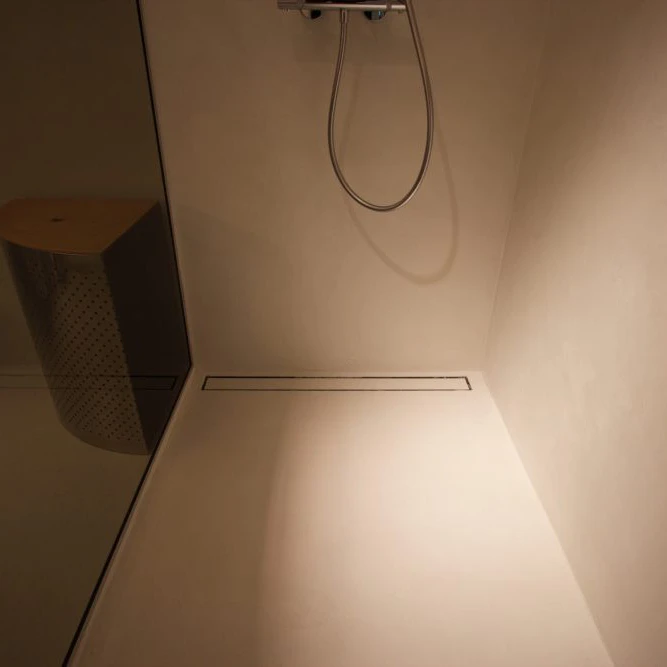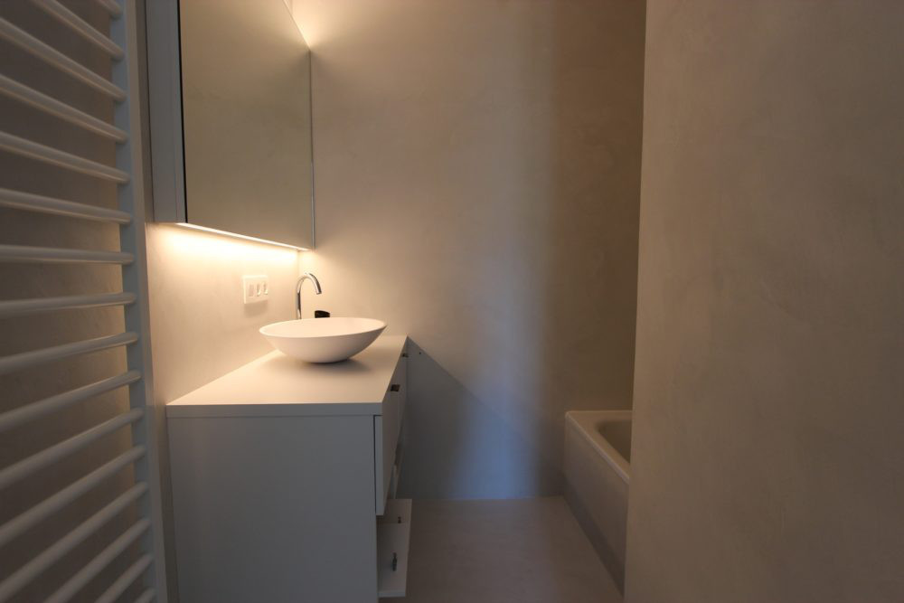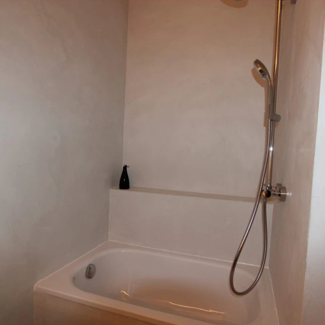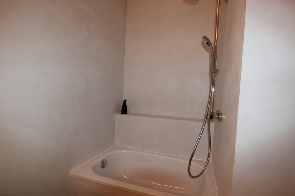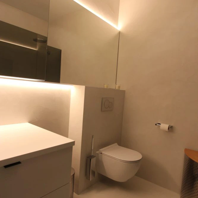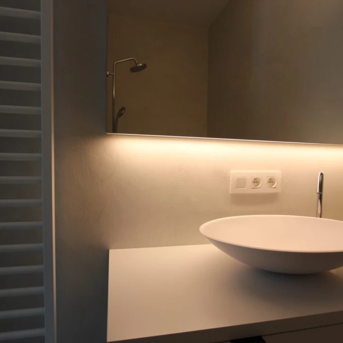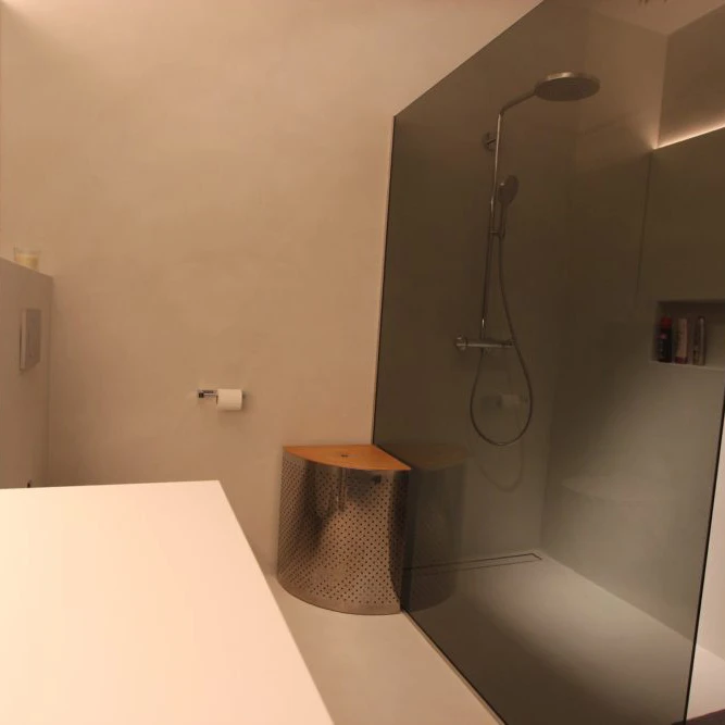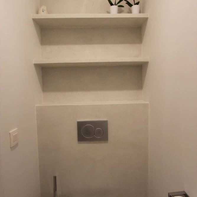 Door gebruik te maken van een heel lichte tint mortex krijgt de ruimte een unieke uitstraling.