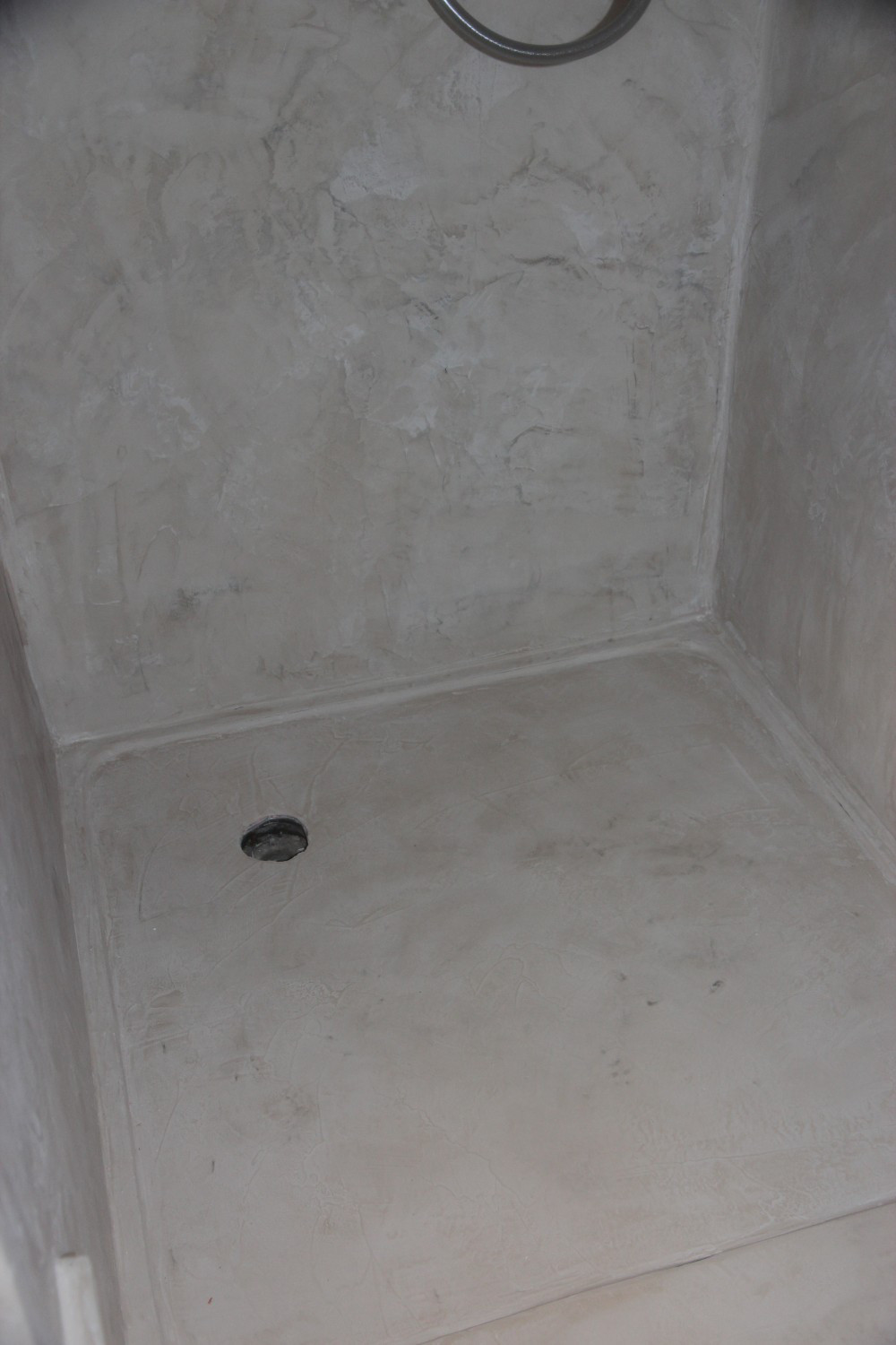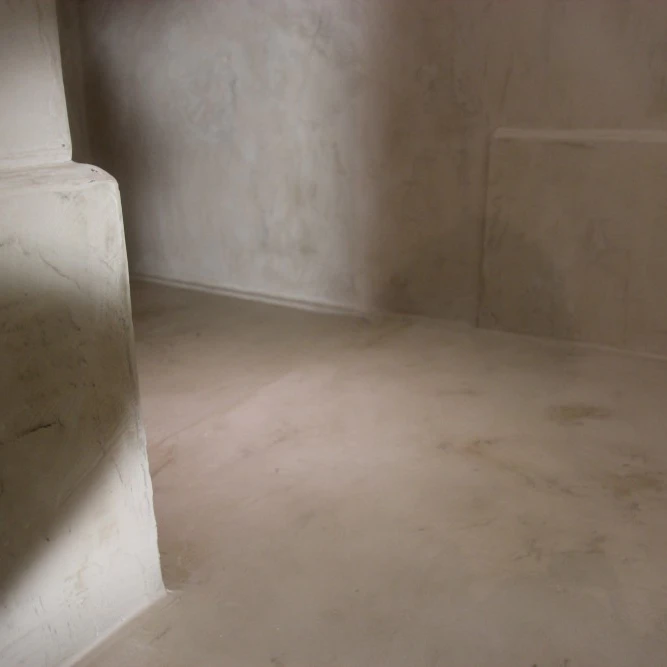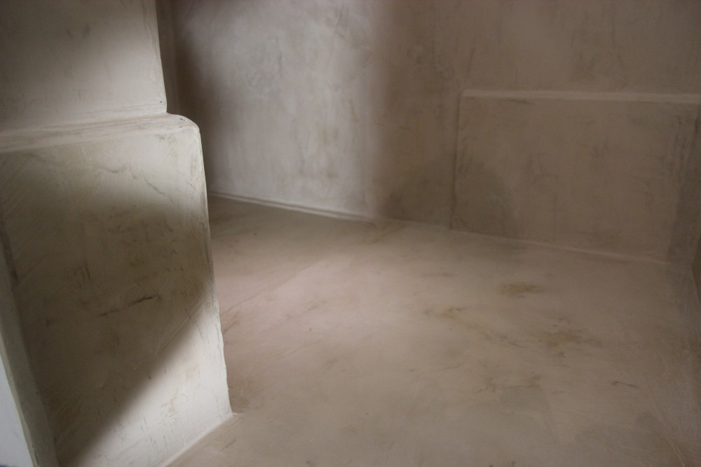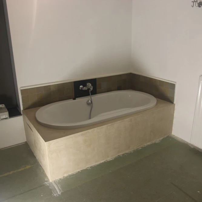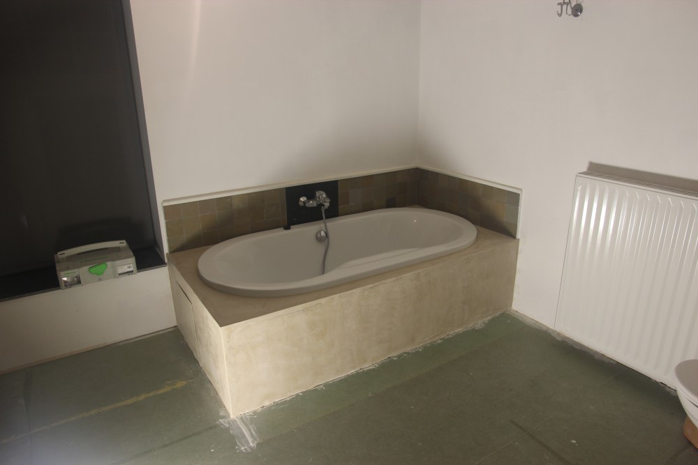 De zelliges tegels aan de wand van het bad werden behouden. De plinten werden eveneens uitgewerkt in Mortex.