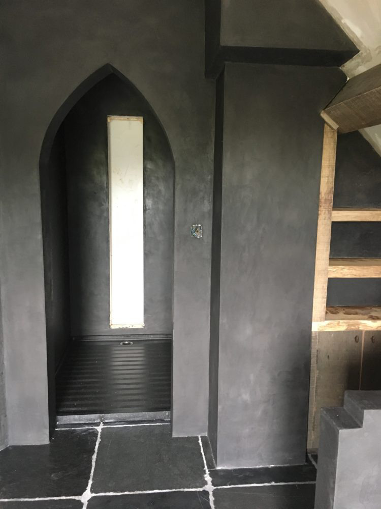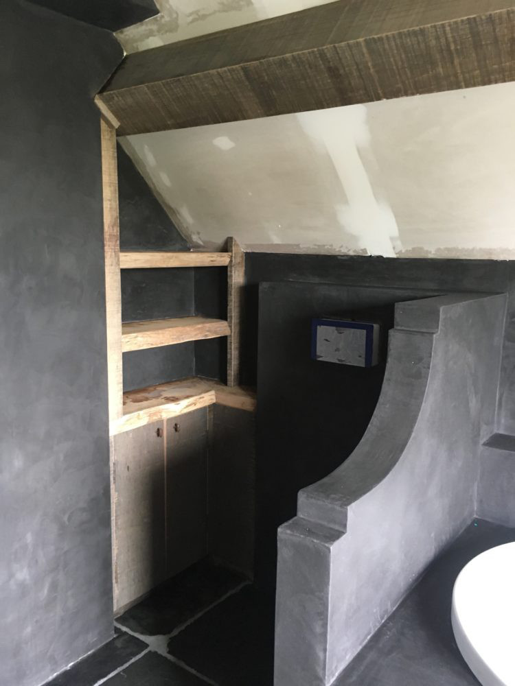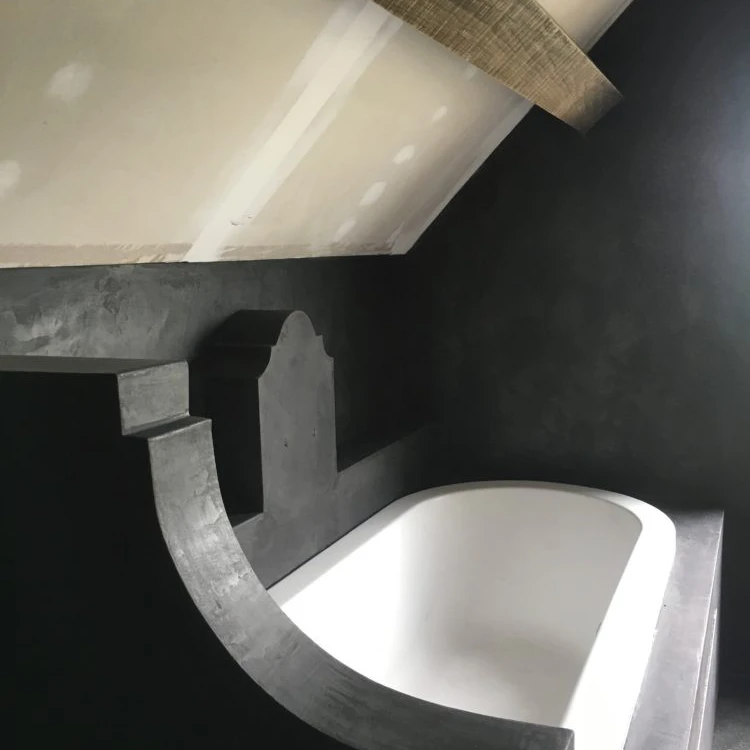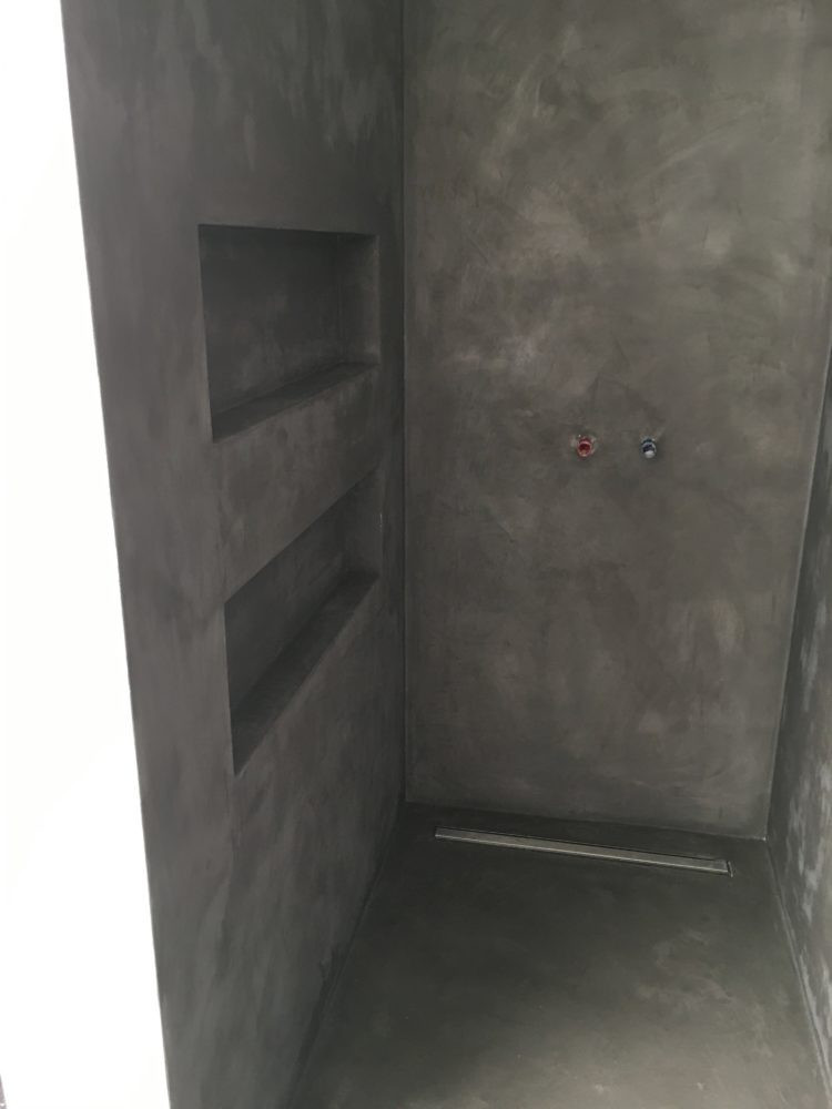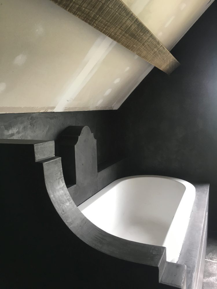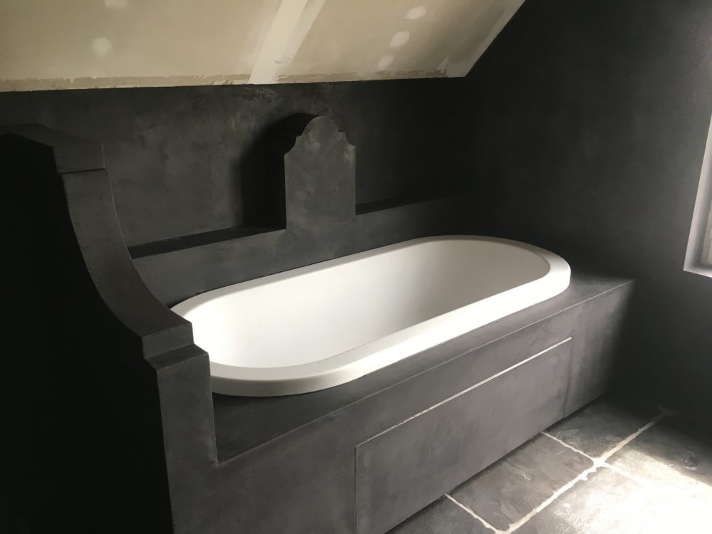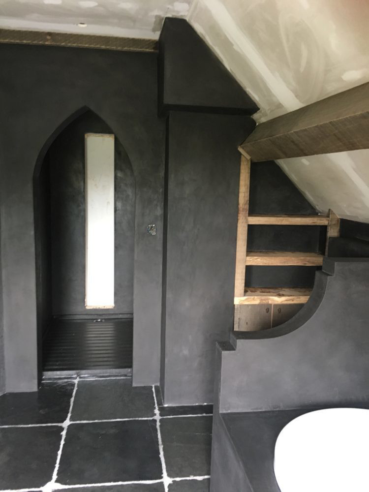Een prachtige badkamer, gerealiseerd in zwarte mortex.De vormgeving zorgt voor een erg chique tintje.