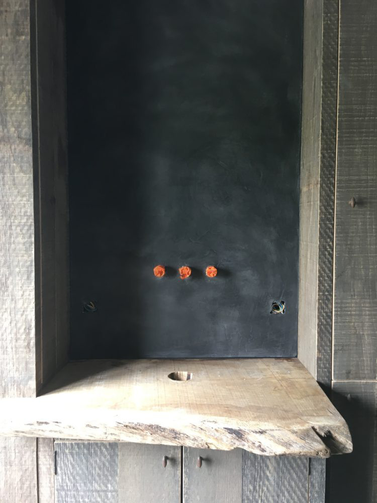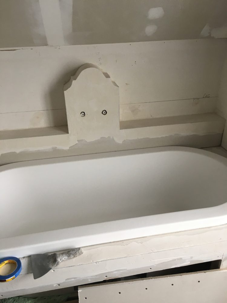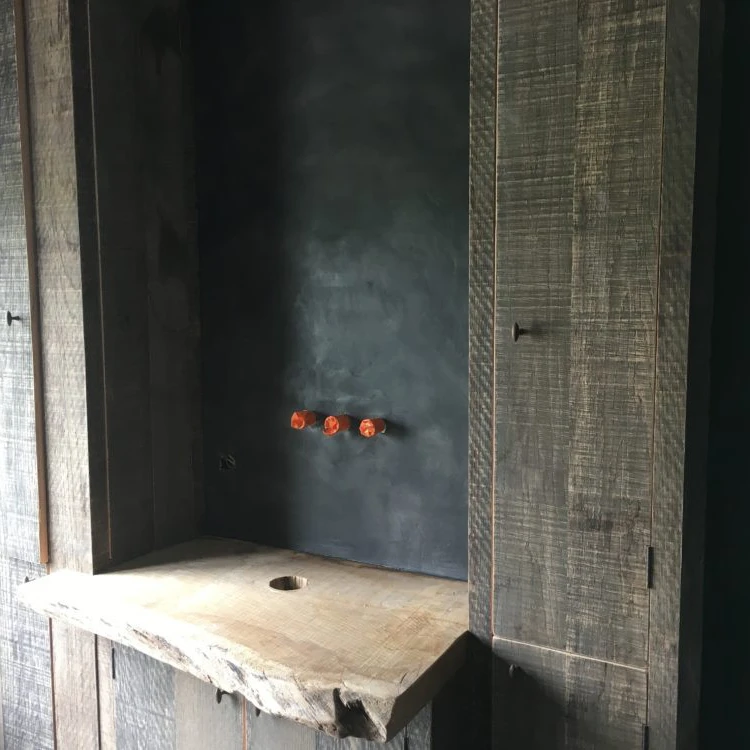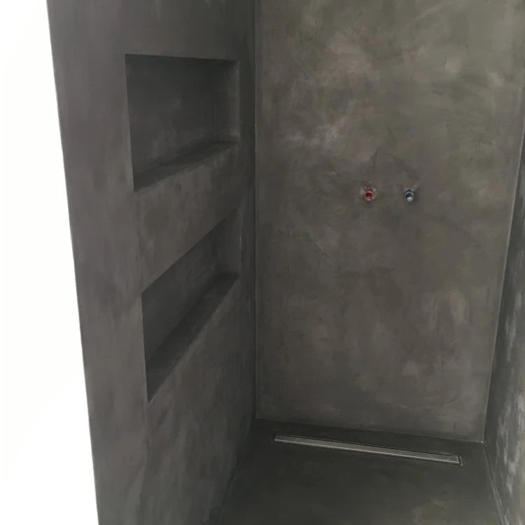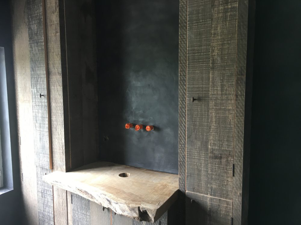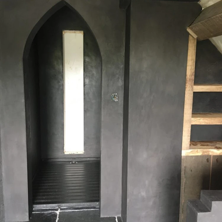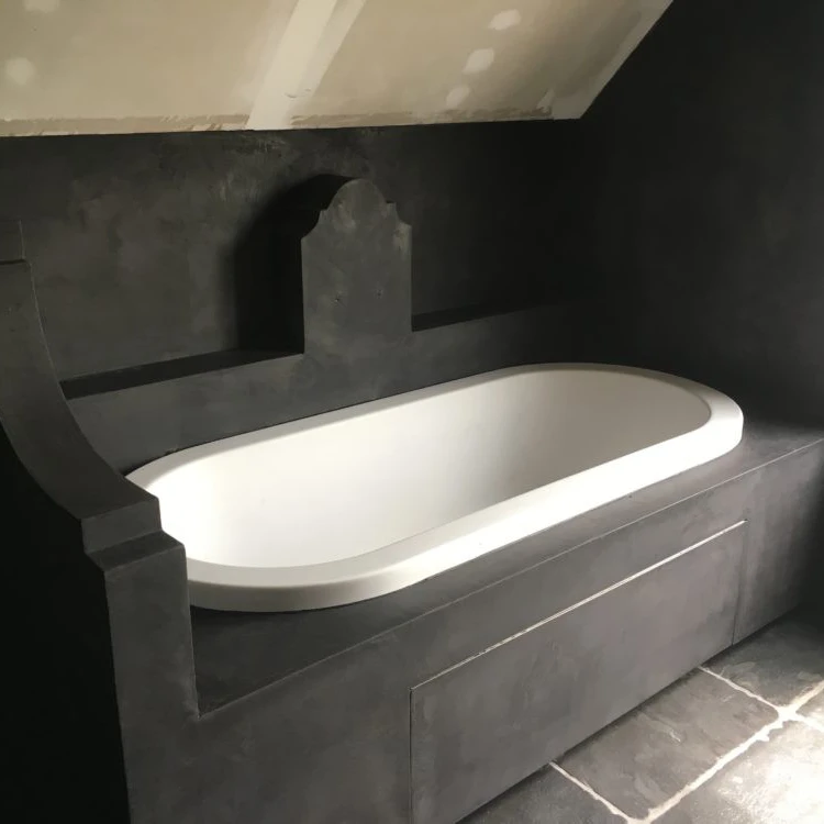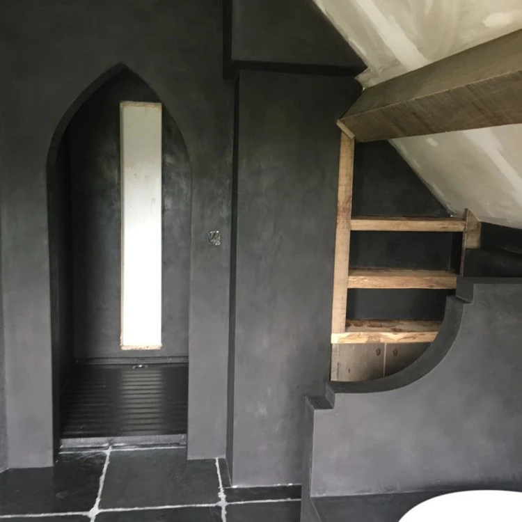 Een prachtige badkamer, gerealiseerd in zwarte mortex.De vormgeving zorgt voor een erg chique tintje.