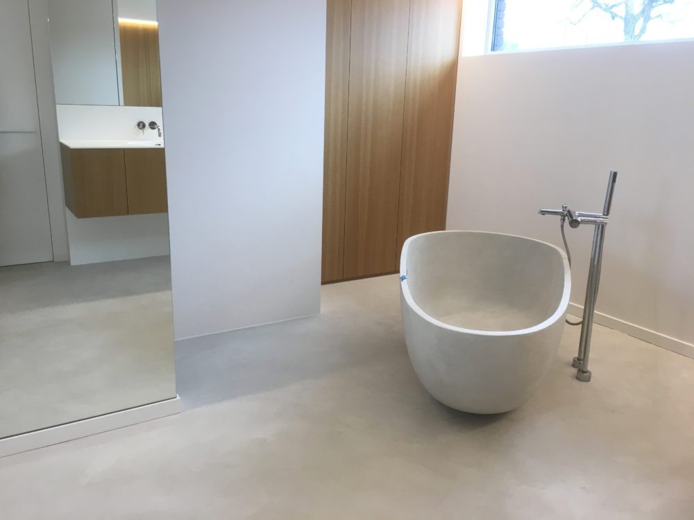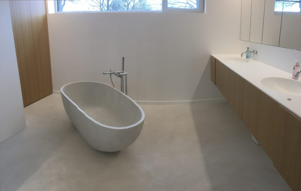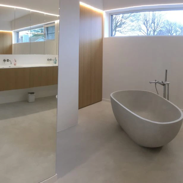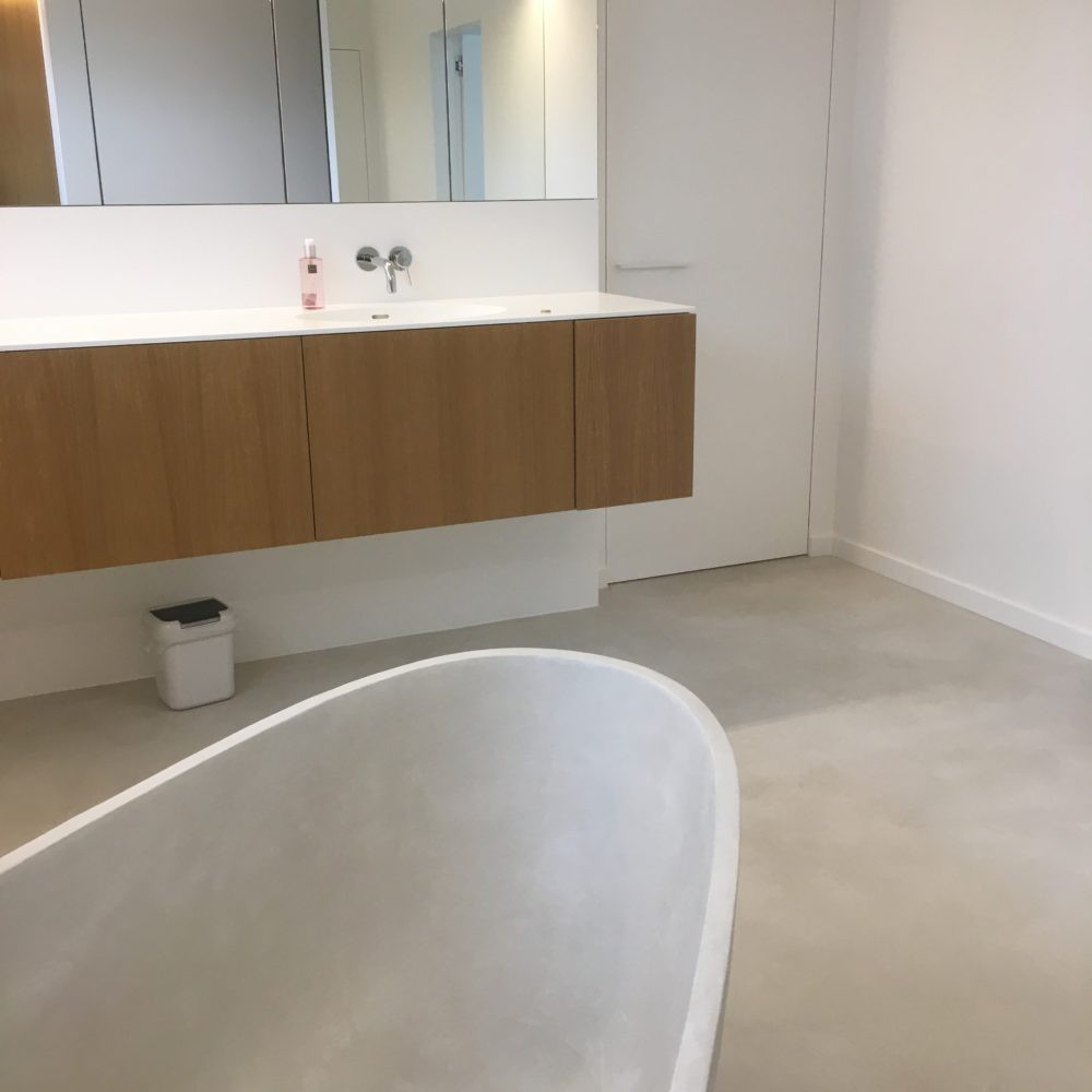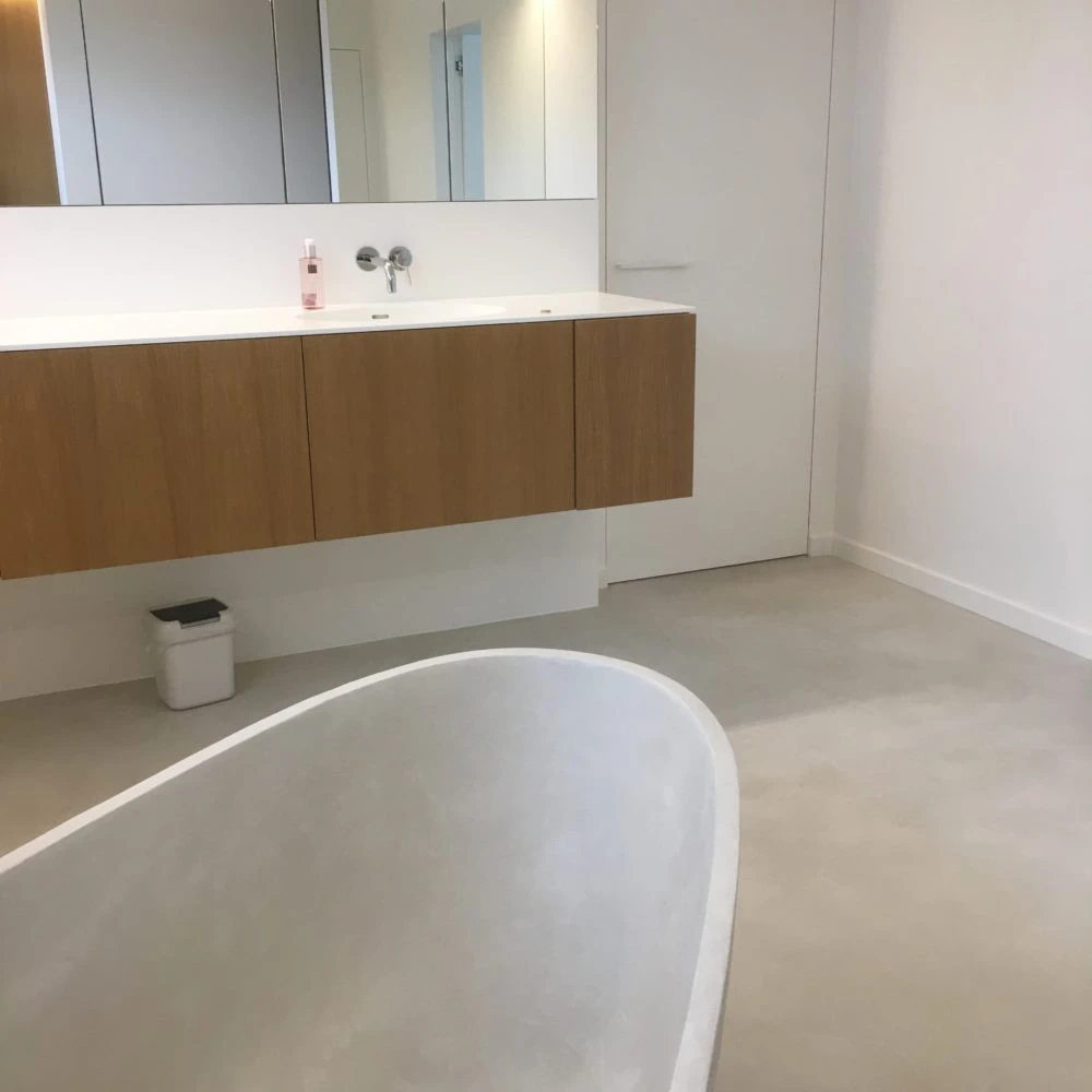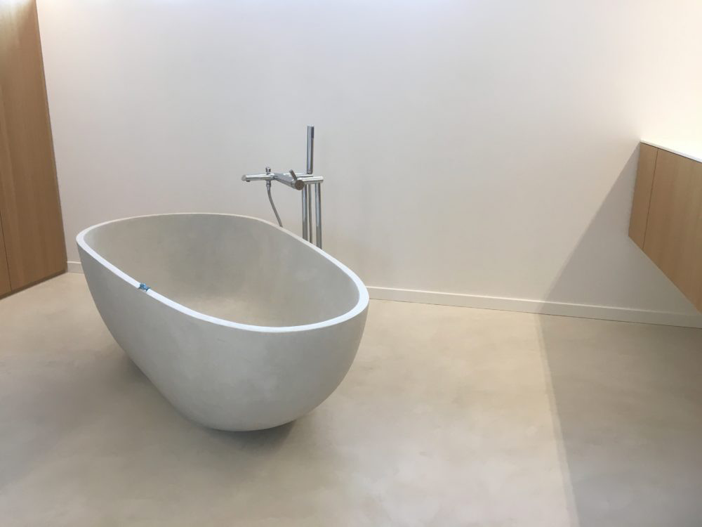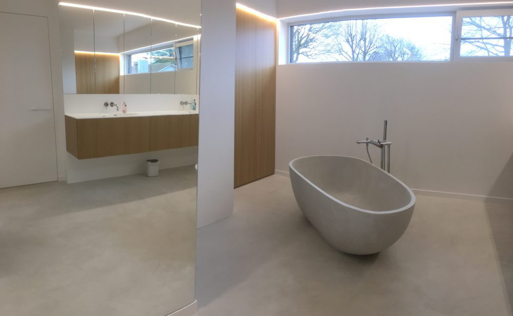 Hier werd het bestaande bad omgetoverd tot een echte eyecatcher door het volledig uit te werken met mortex.Het bad is sierlijk, straalt klasse uit maar valt ook op door het in het midden van de ruimte te plaatsen.