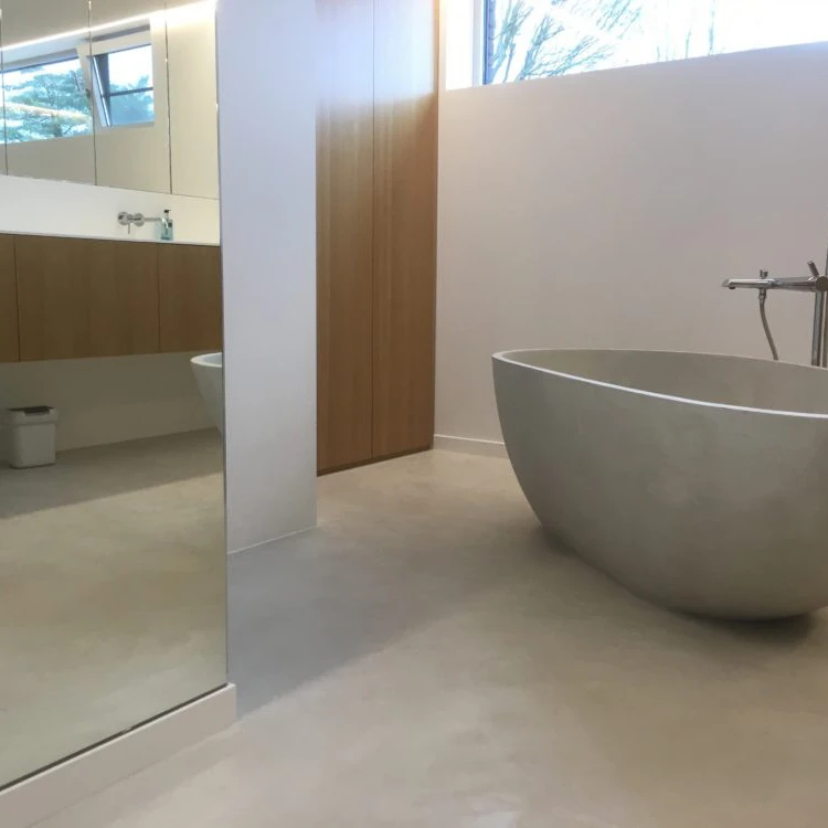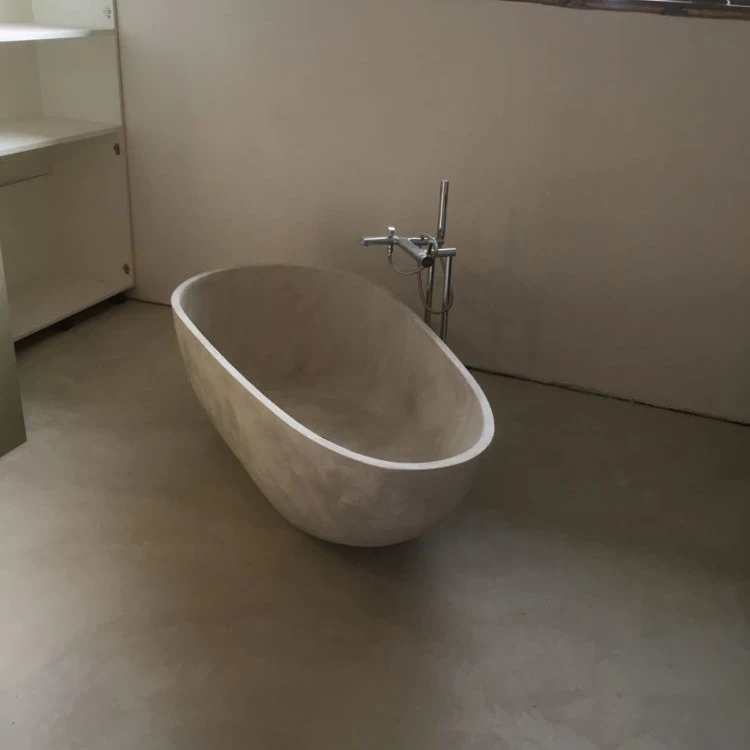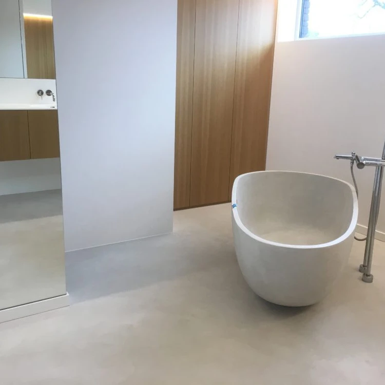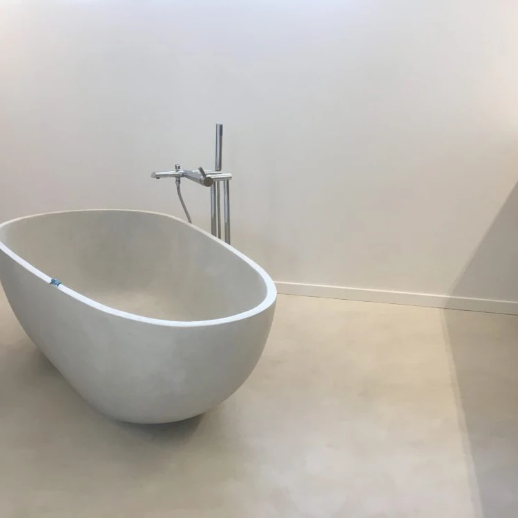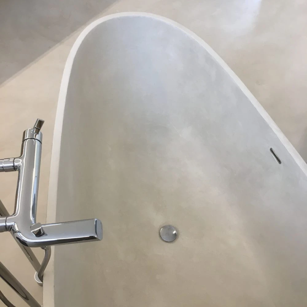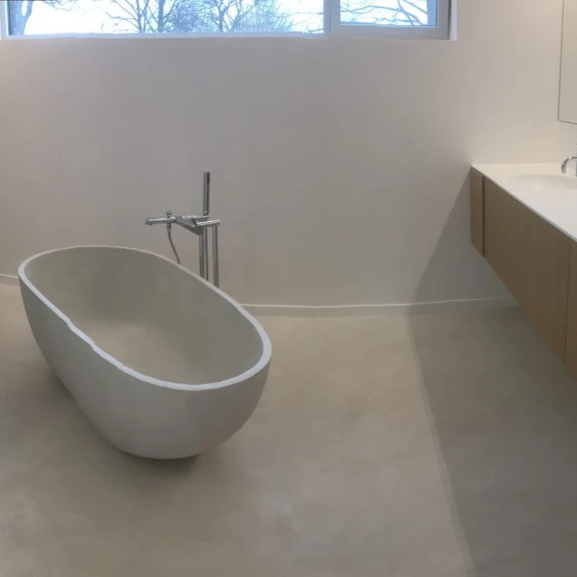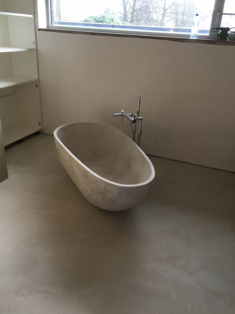 Hier werd het bestaande bad omgetoverd tot een echte eyecatcher door het volledig uit te werken met mortex.Het bad is sierlijk, straalt klasse uit maar valt ook op door het in het midden van de ruimte te plaatsen.