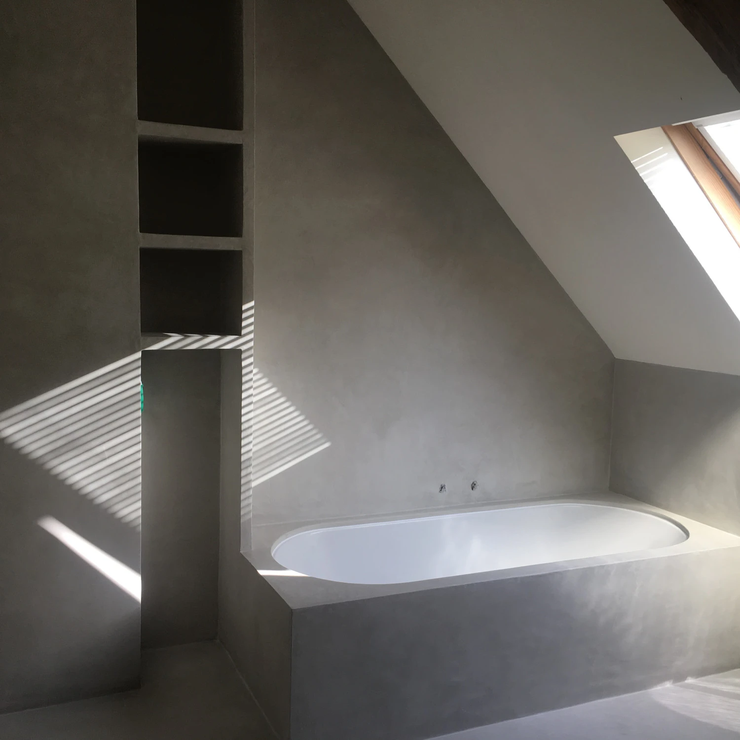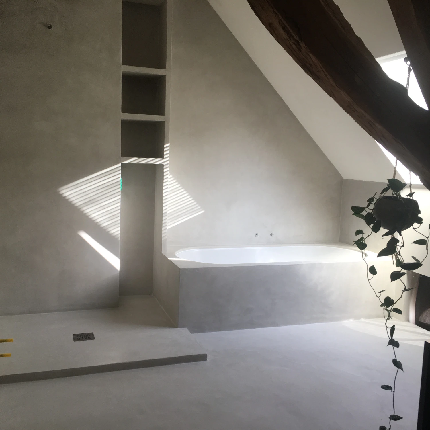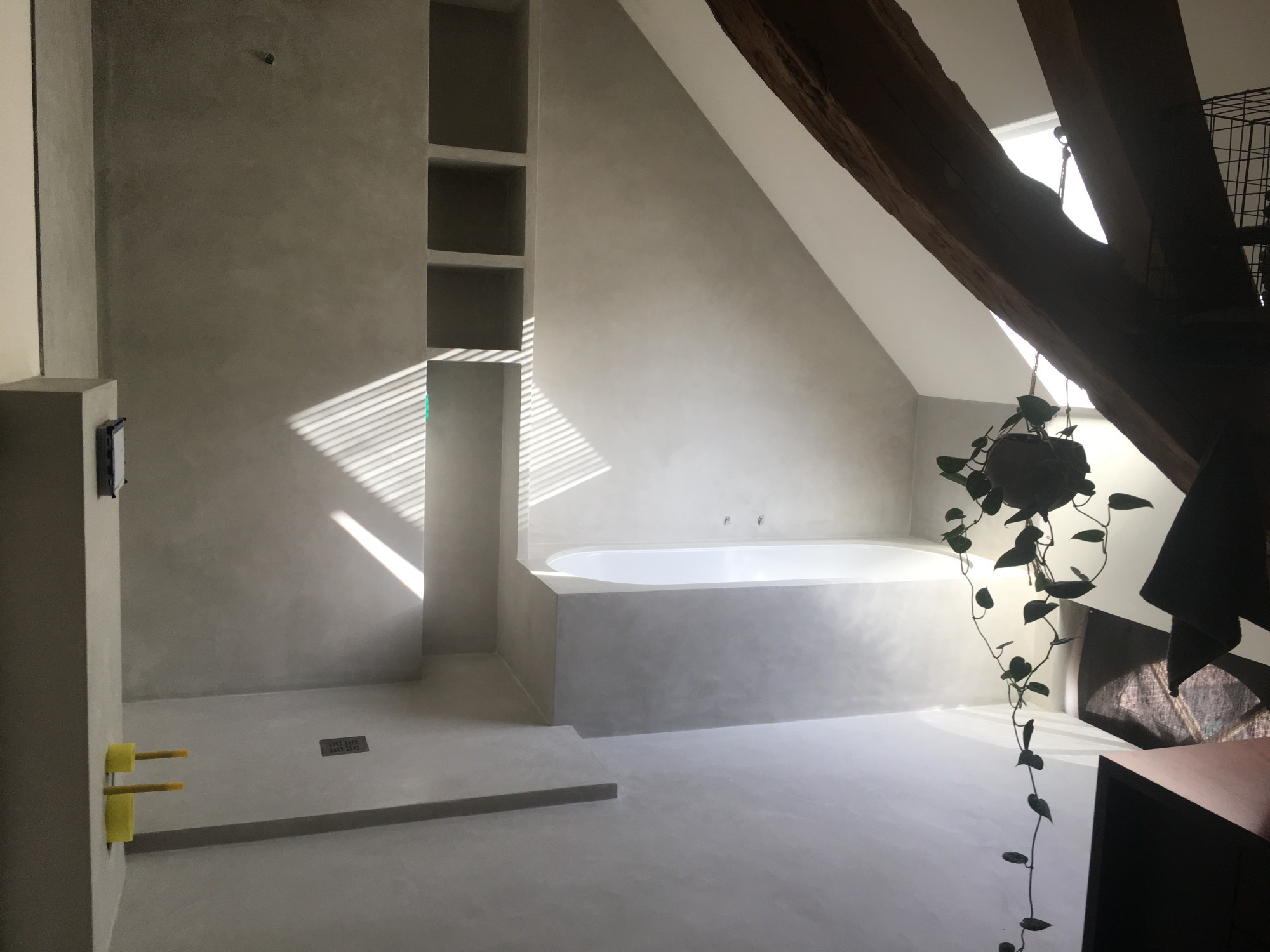 De zachte natuurtint van de mortex, de oude bestaande gebinten en de talrijke nissen bepalen de gezellige sfeer van deze badkamer.