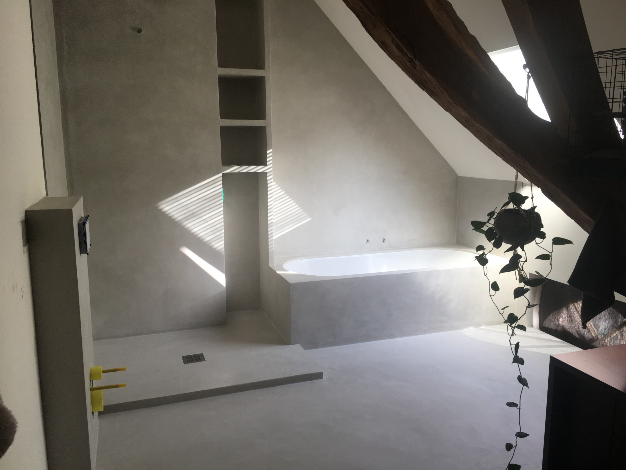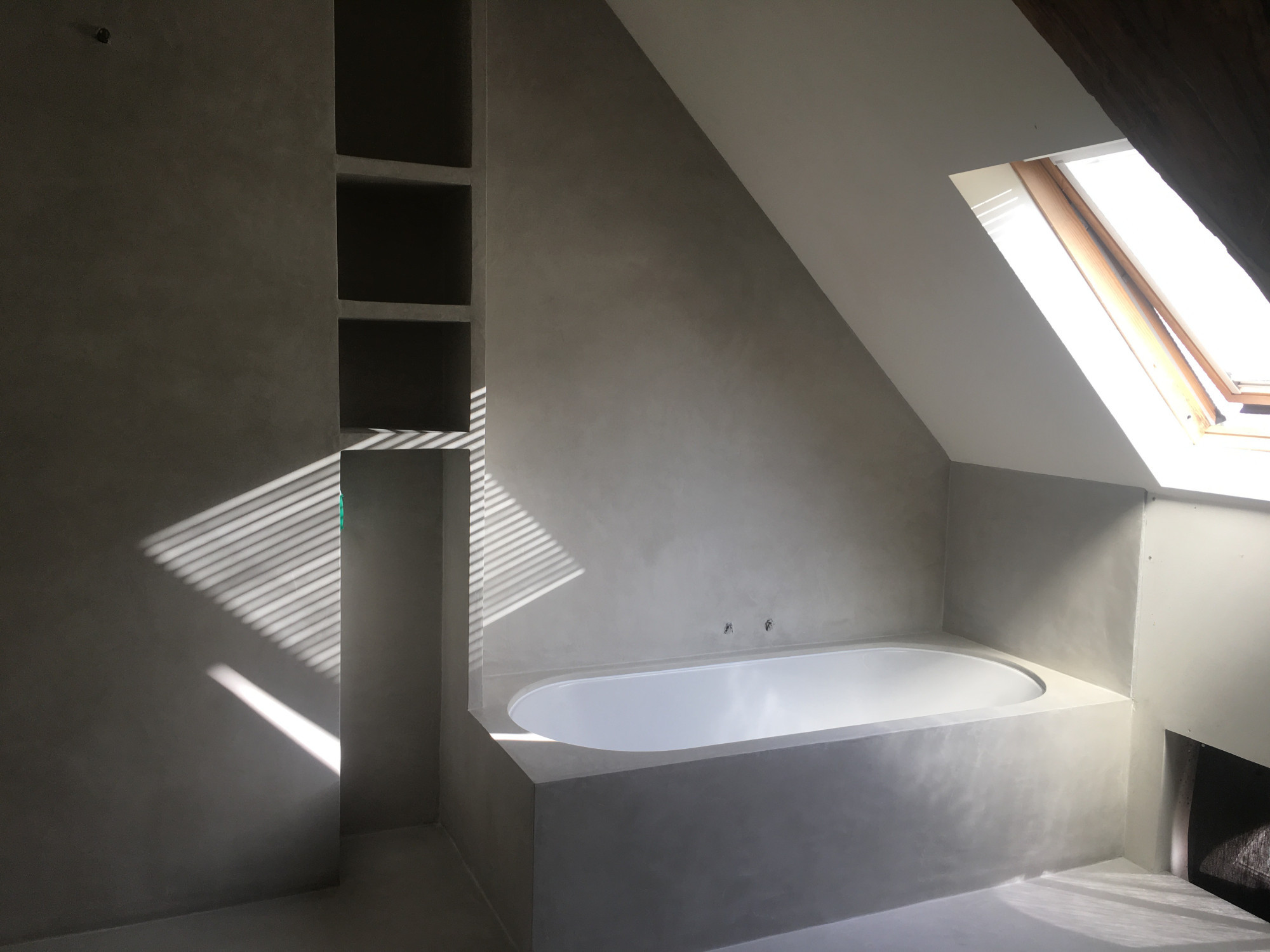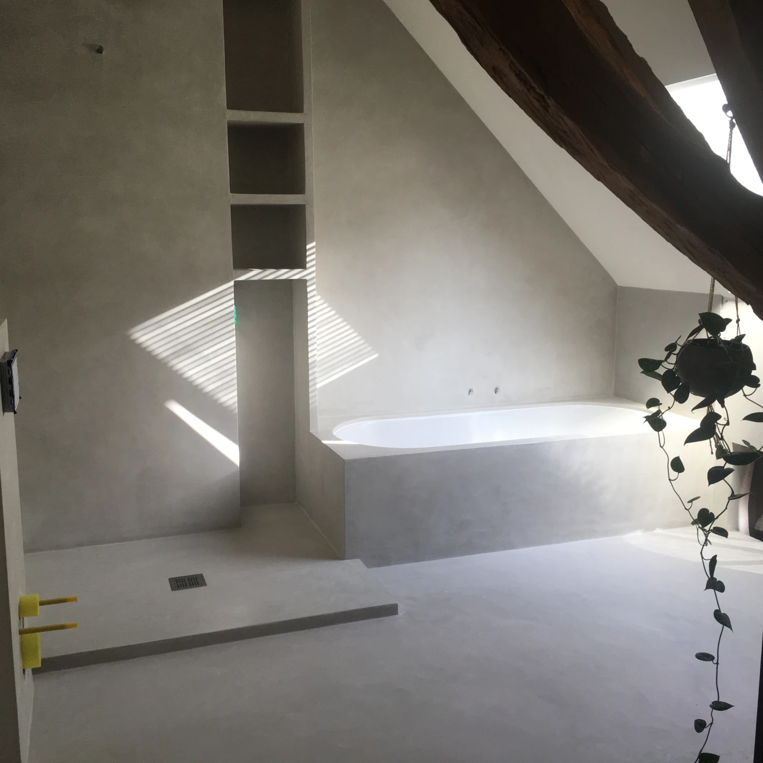 De zachte natuurtint van de mortex, de oude bestaande gebinten en de talrijke nissen bepalen de gezellige sfeer van deze badkamer.
