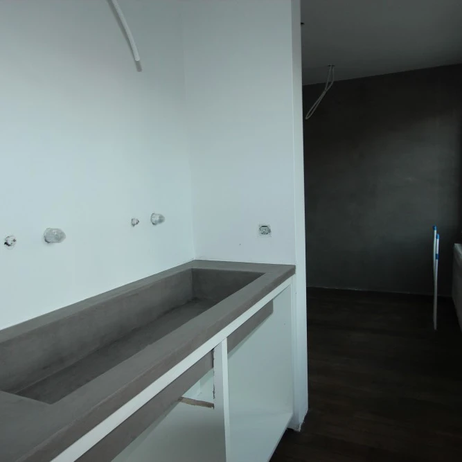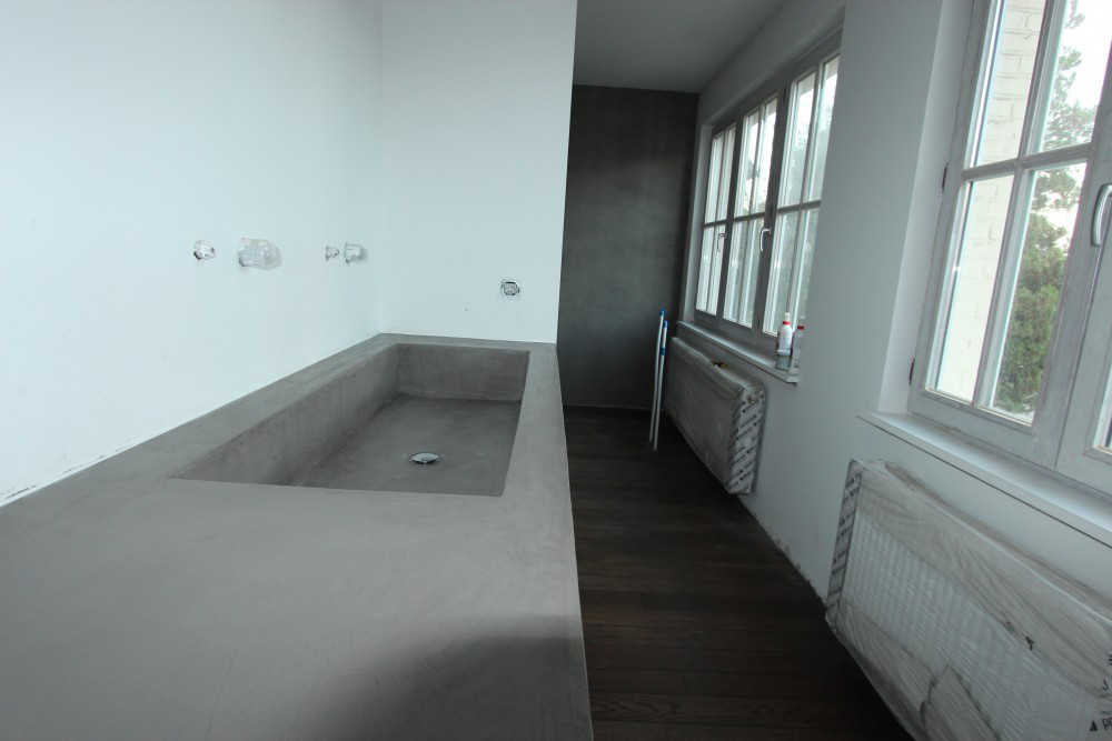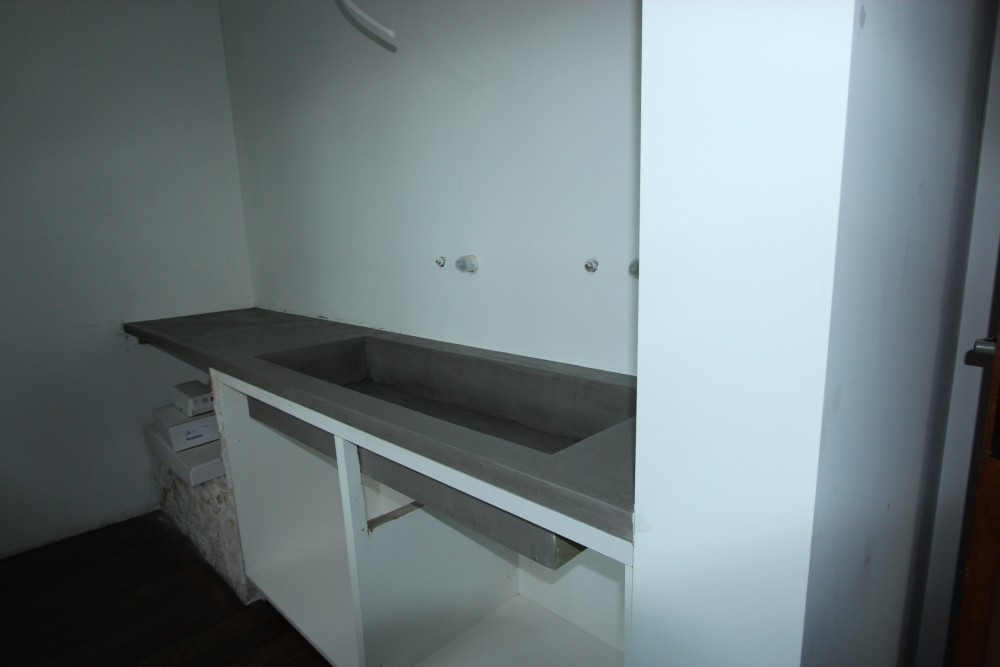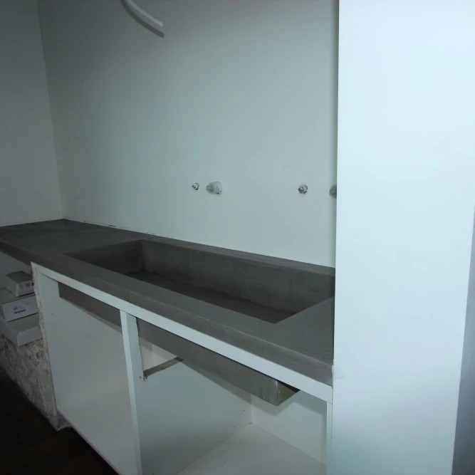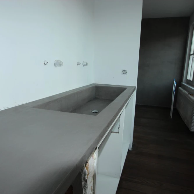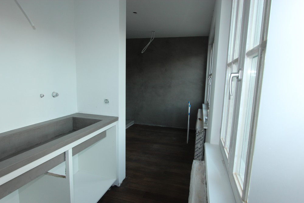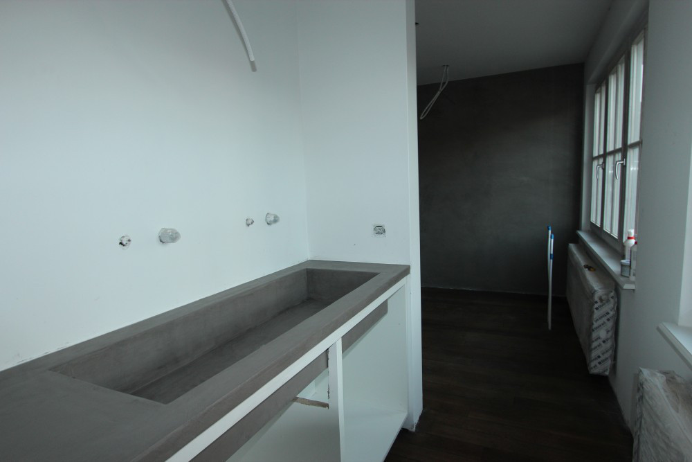 Een grote lavabo werd door ons op maat gemaakt en uitgewerkt in Mortex.