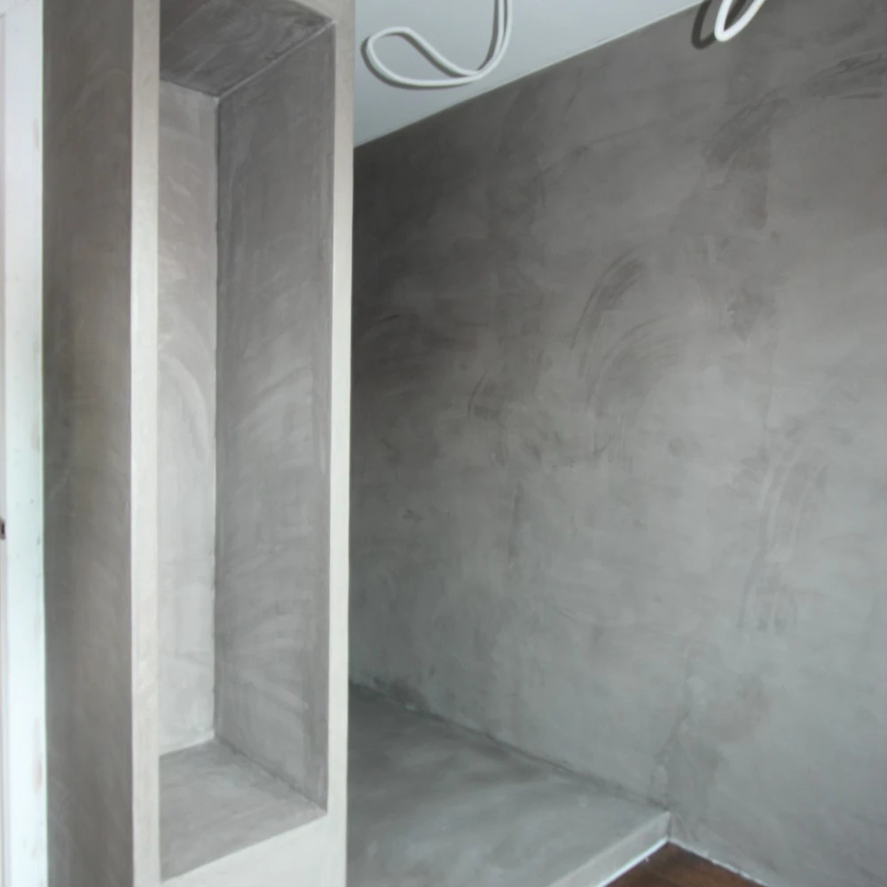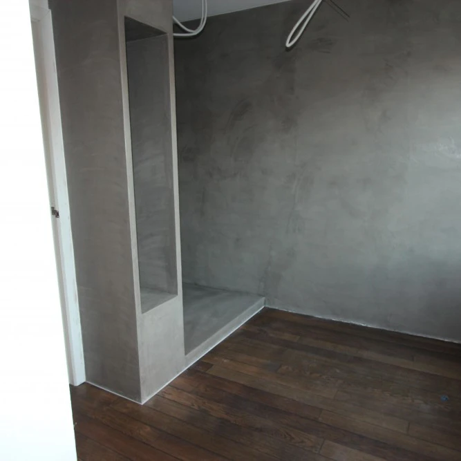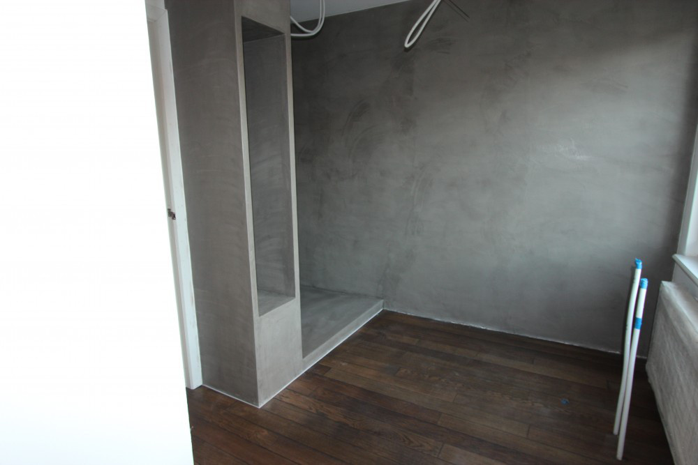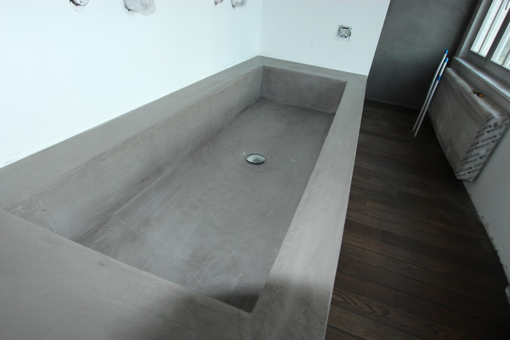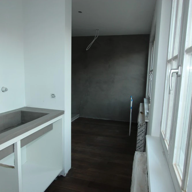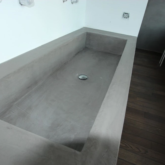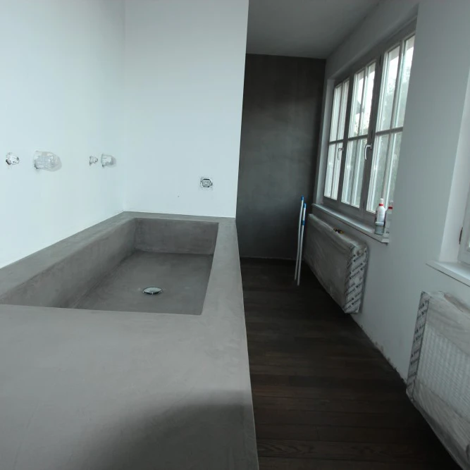 Een grote lavabo werd door ons op maat gemaakt en uitgewerkt in Mortex.