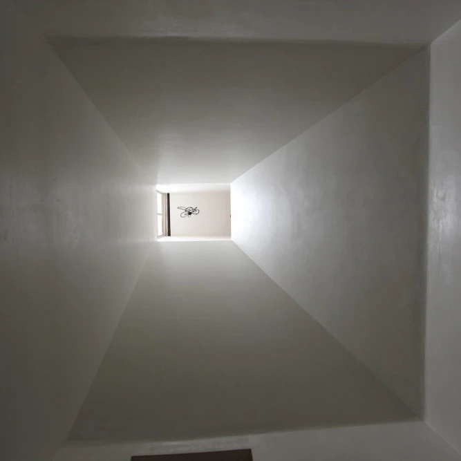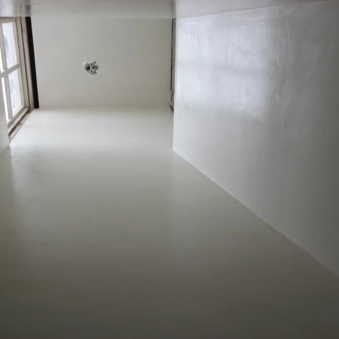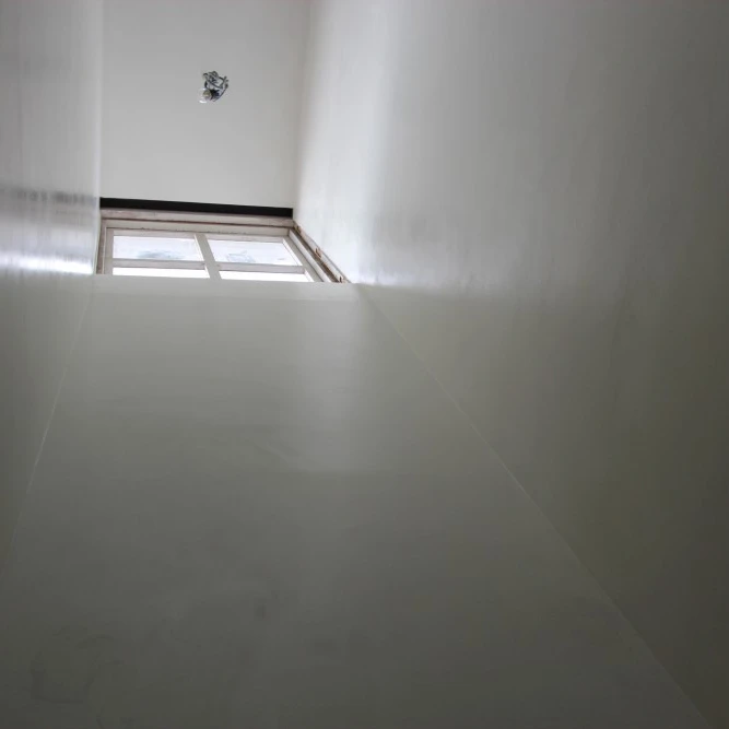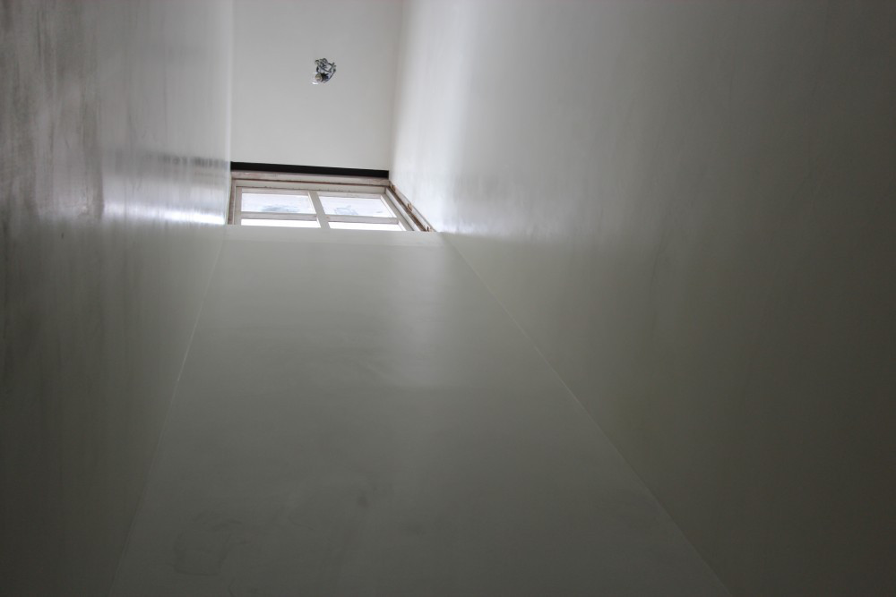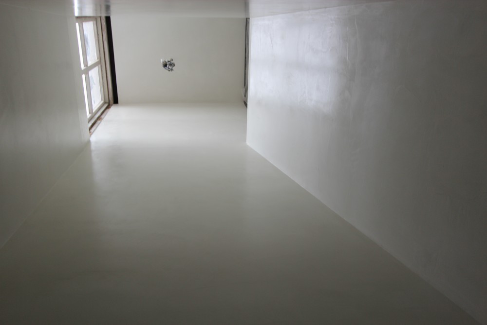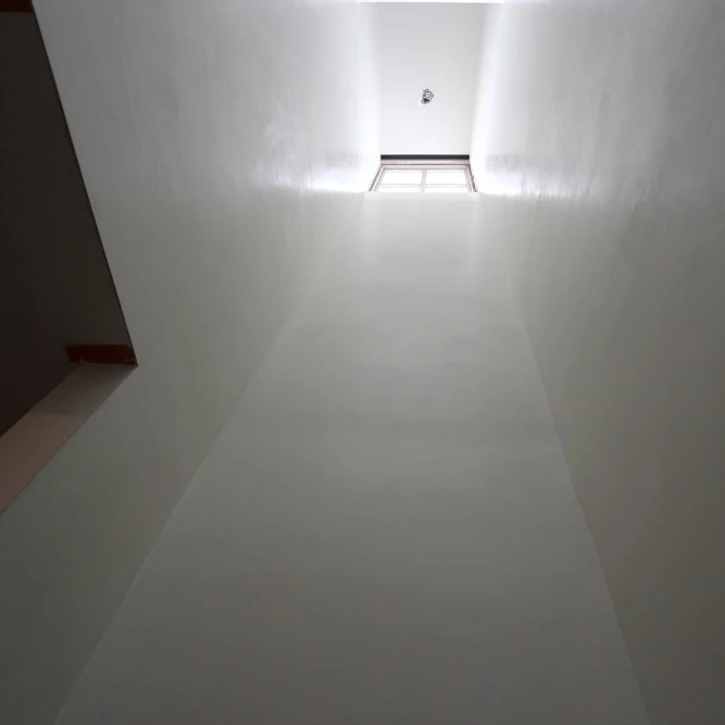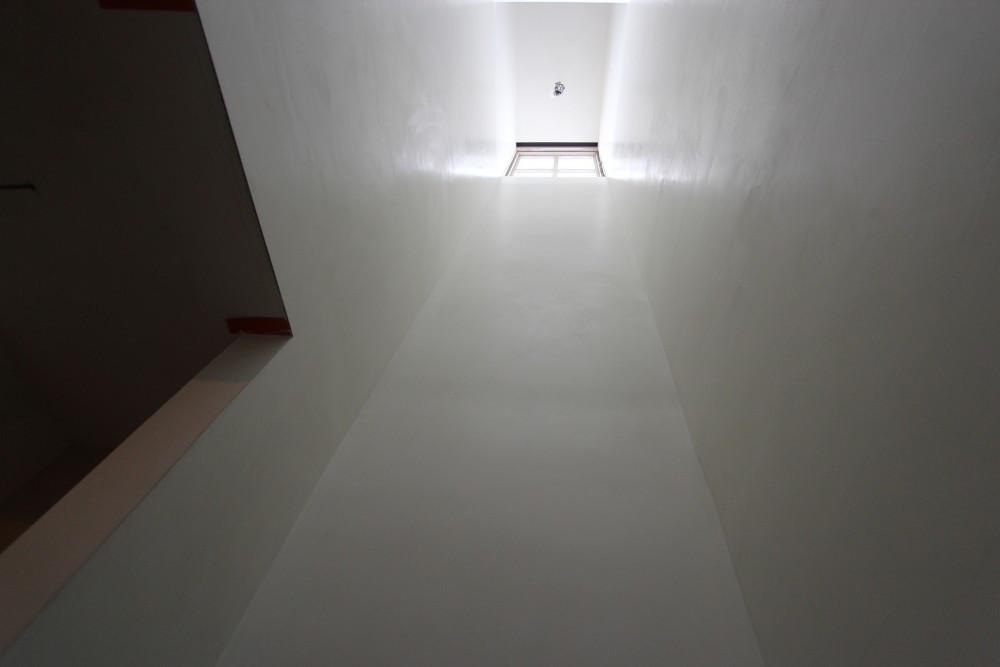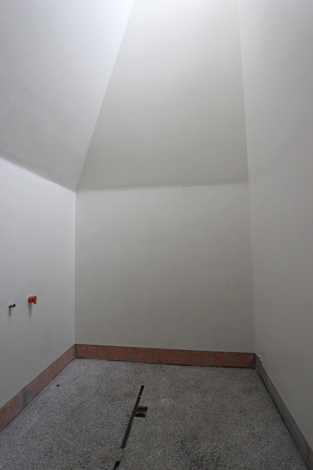 De zeer hoge wanden van douche en wasruimte werden gerealiseerd uit witte Mortex.