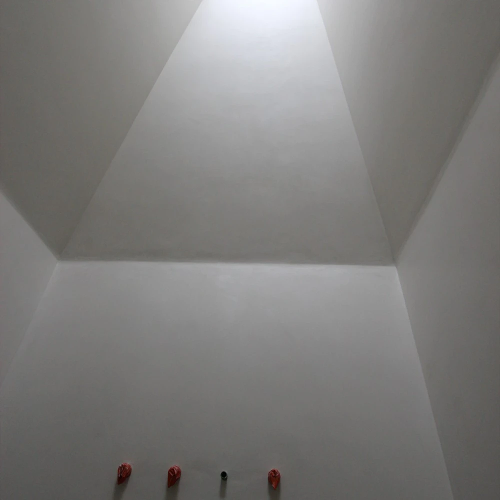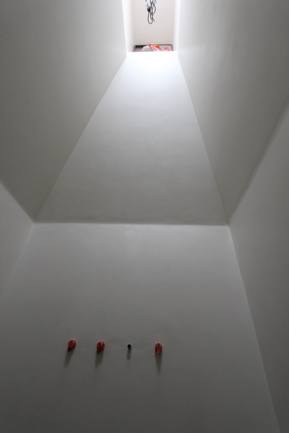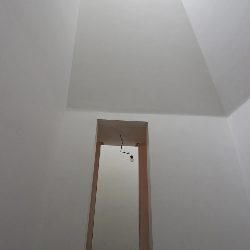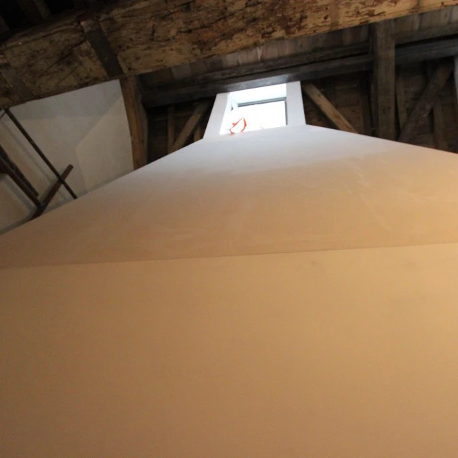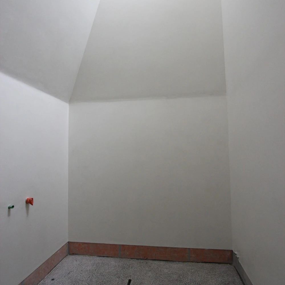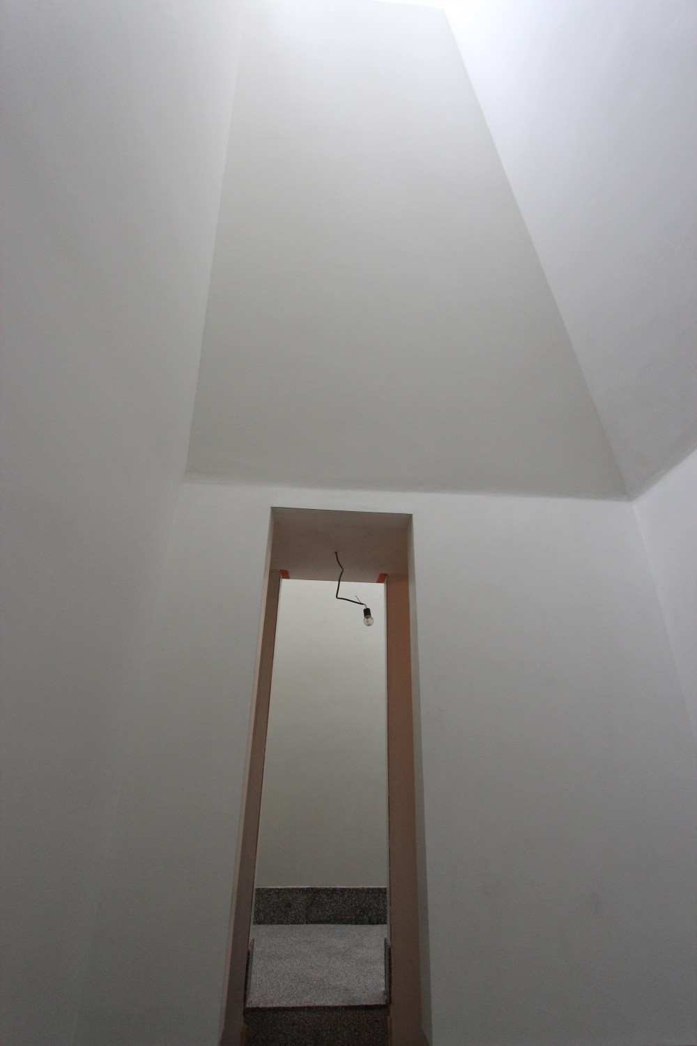 De zeer hoge wanden van douche en wasruimte werden gerealiseerd uit witte Mortex.