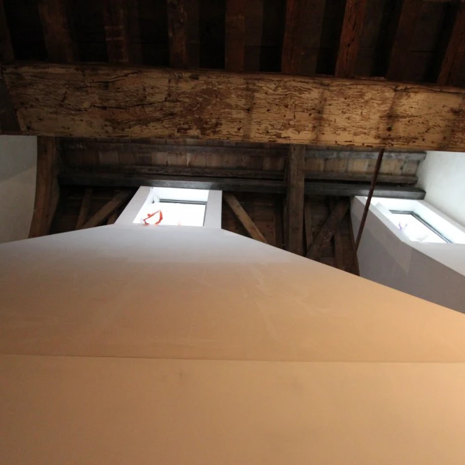De schitterende douche en wasruimte vormen een nieuw volume binnen de contouren van het oude gebouw!