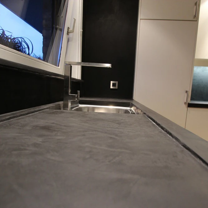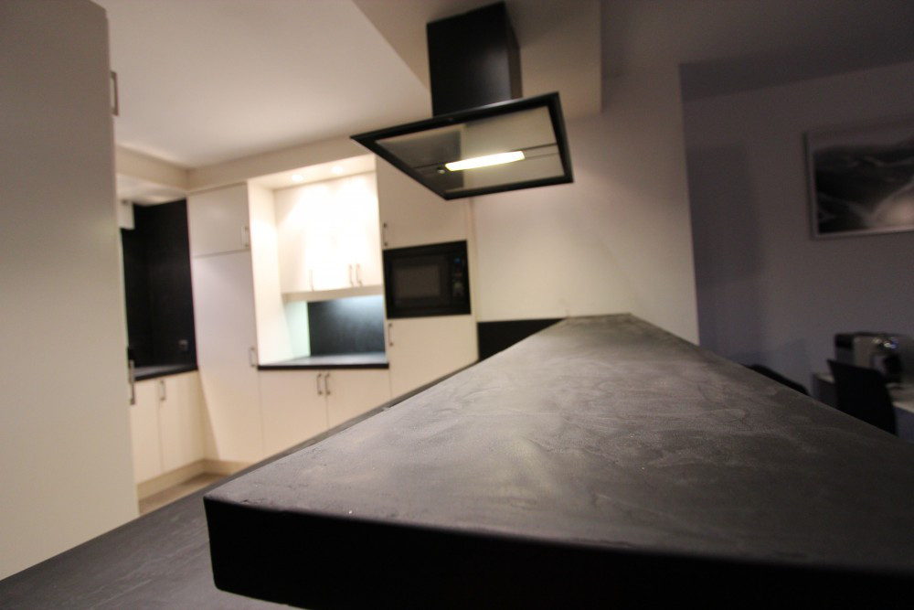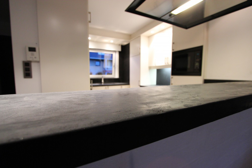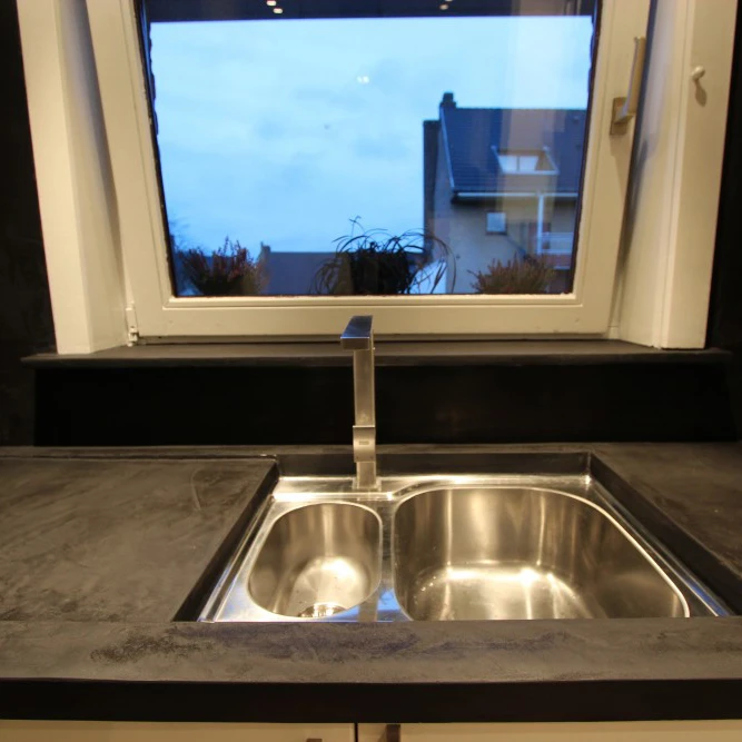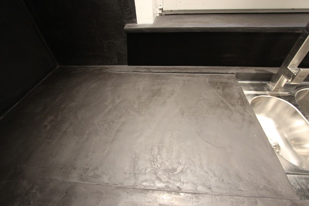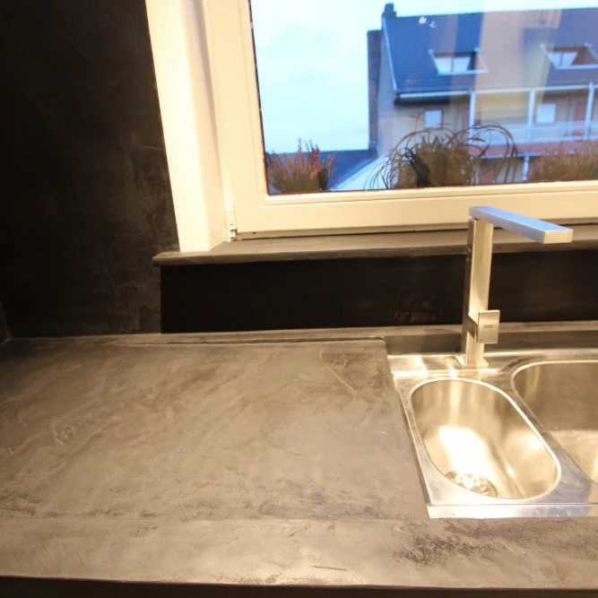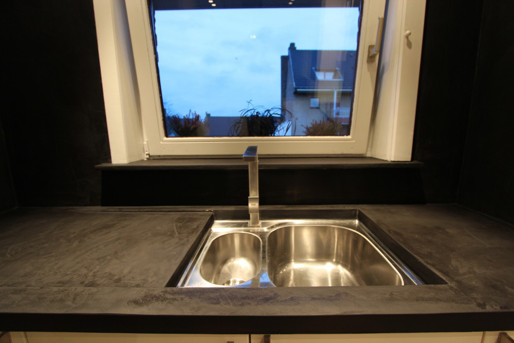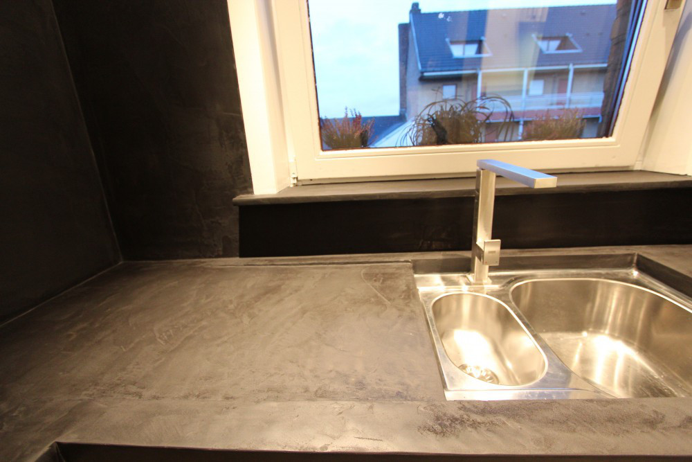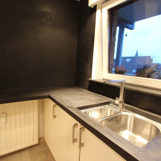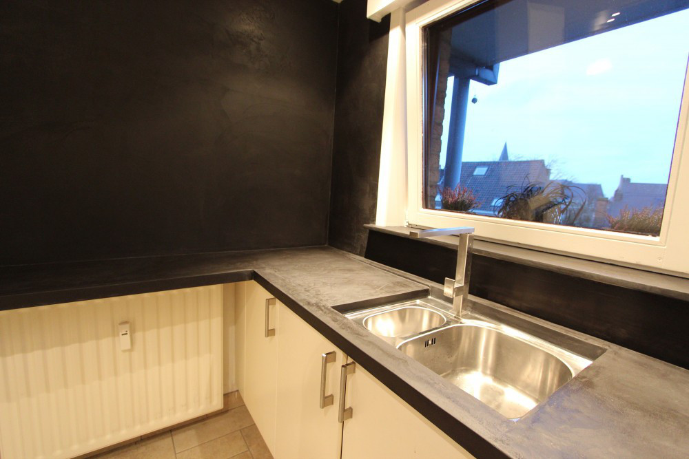 Over het bestaande keukenwerkblad en wanden hebben wij Mortex aangebracht.