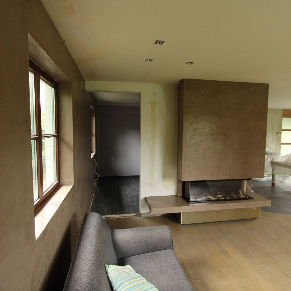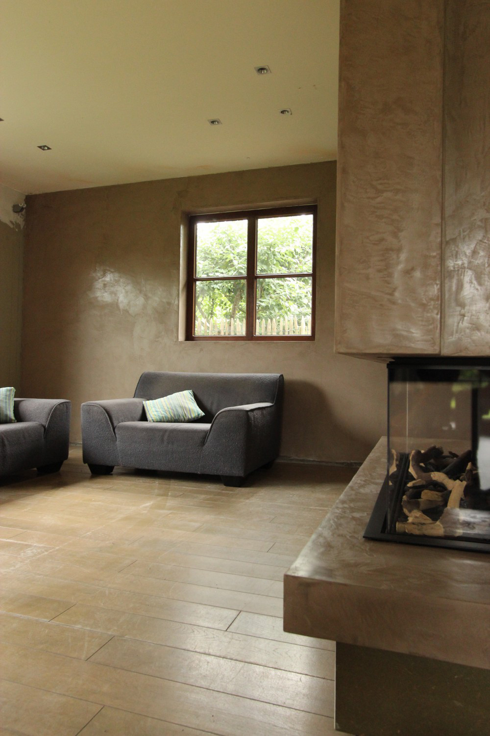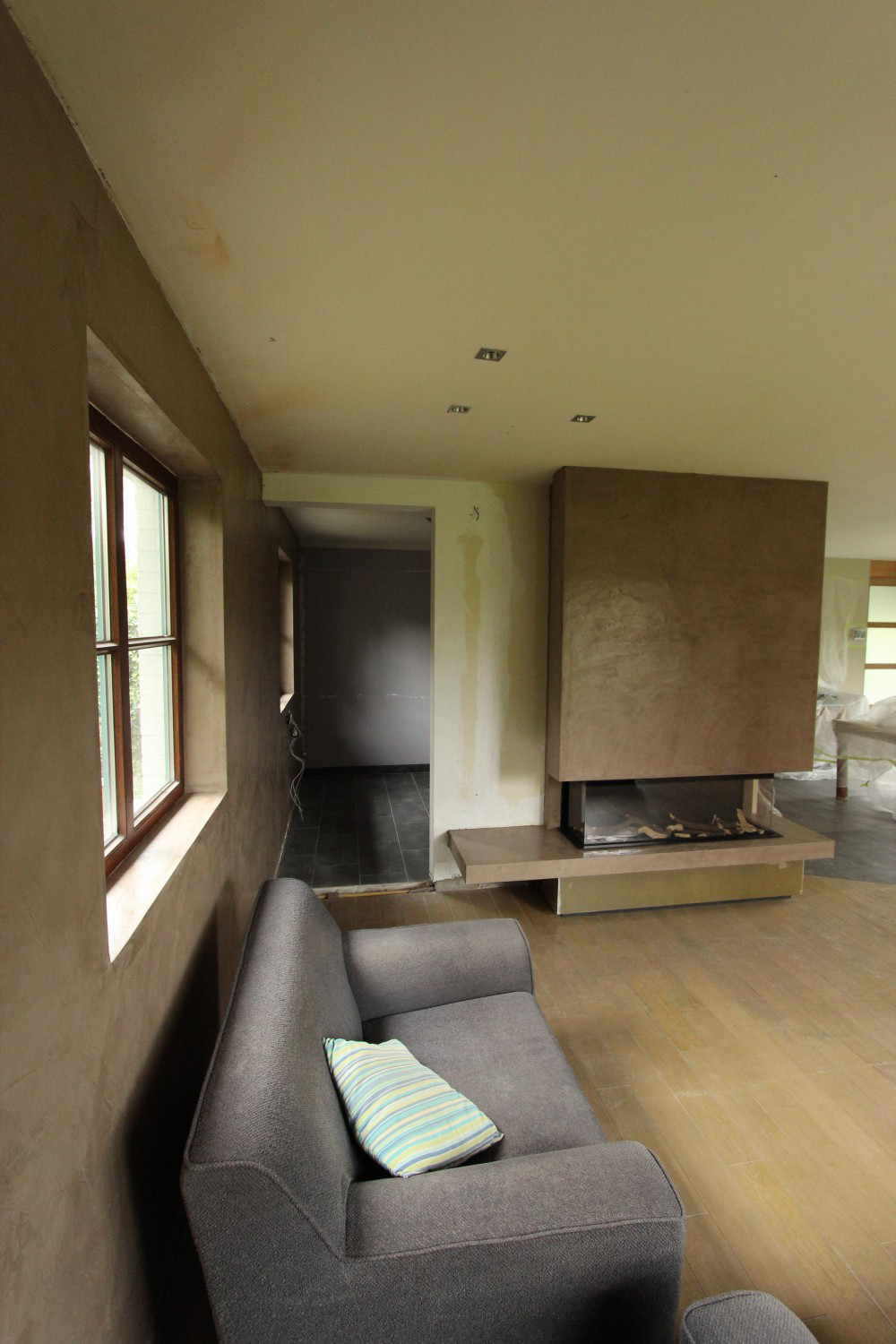 In de leefruimte werd geopteerd om zowel voor de wanden, het meubel als de haardwand gebruik te maken van één en dezelfde kleur Mortex waardoor men een ruimtelijk gevoel krijgt.