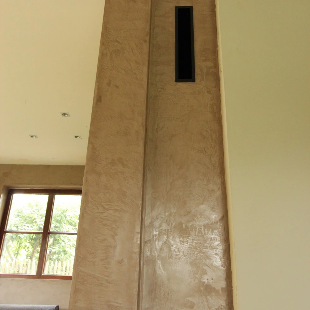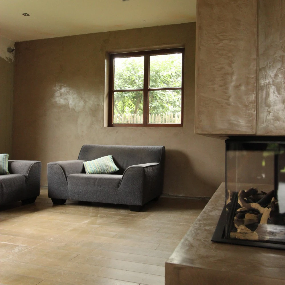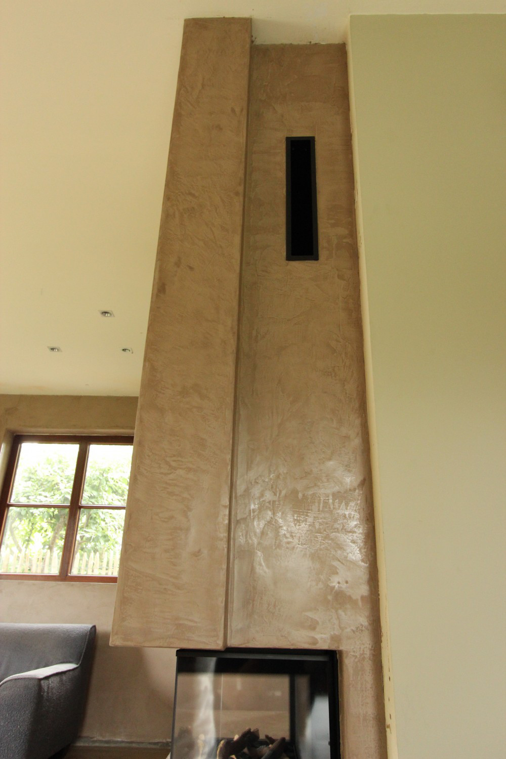 In de leefruimte werd geopteerd om zowel voor de wanden, het meubel als de haardwand gebruik te maken van één en dezelfde kleur Mortex waardoor men een ruimtelijk gevoel krijgt.