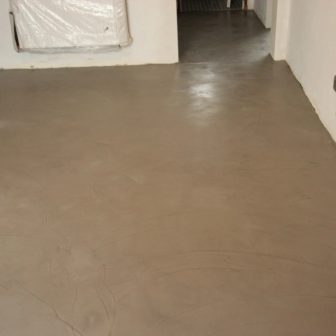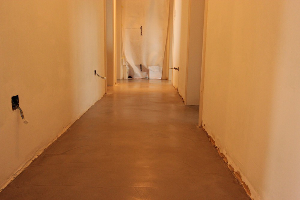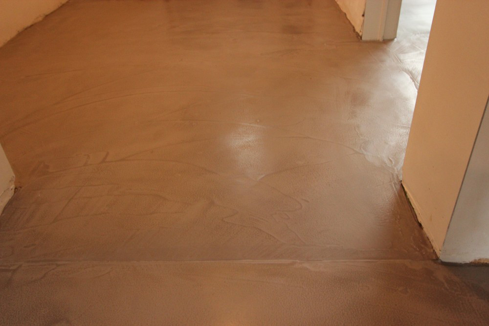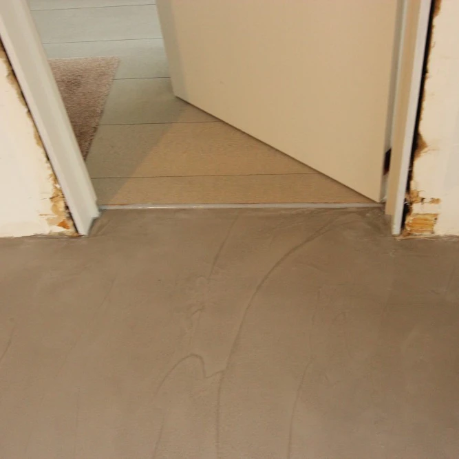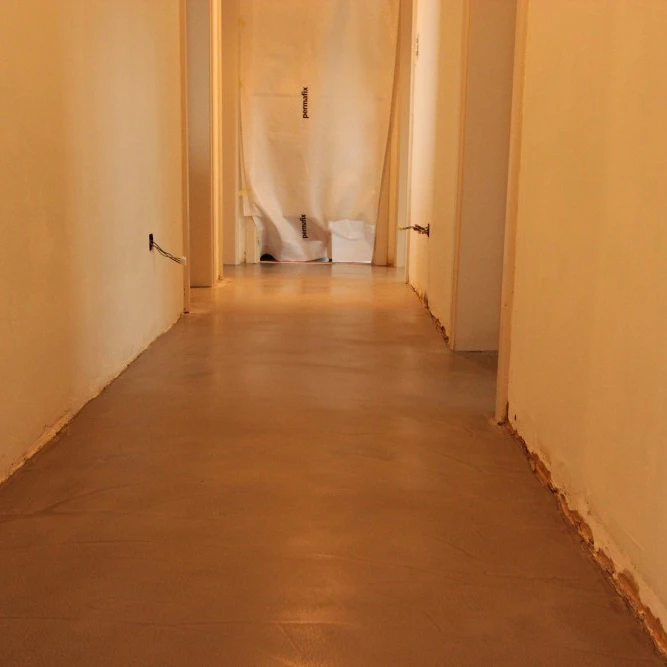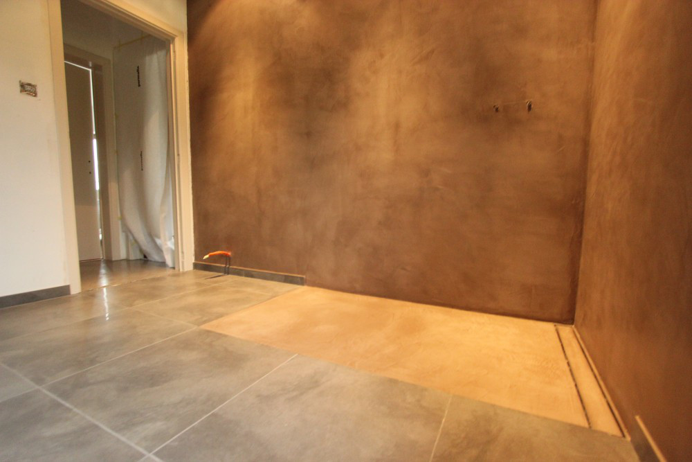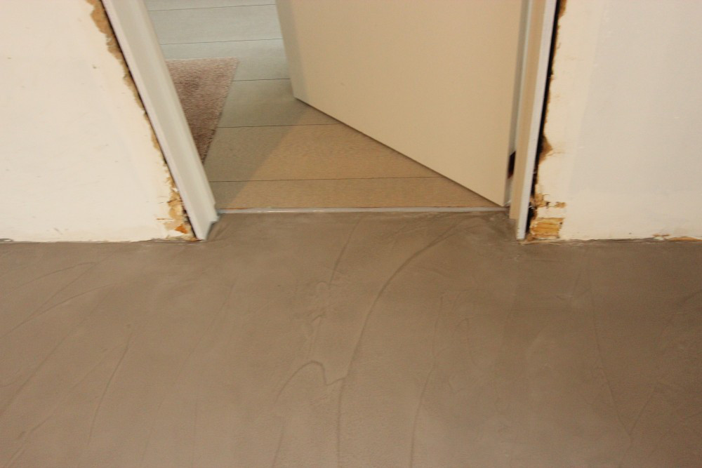 Hier werden Mortex vloeren toegepast in keuken, badkamer en gang.