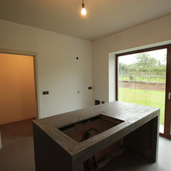 In de keuken werden de werkbladen uitgewerkt in Mortex; in de badkamer zijn eveneens de douche en wanden uitgevoerd in Mortex.