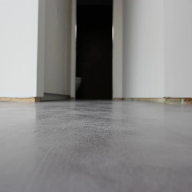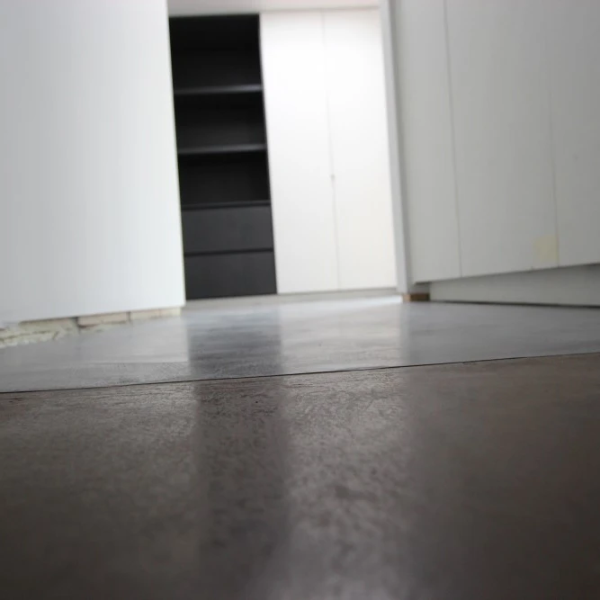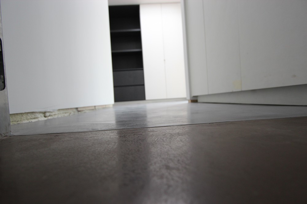 De keukenvloer werd gerealiseerd in een grijze mortex-tint, afgestemd op de aanpalende houten parketvloer van de woonkamer.