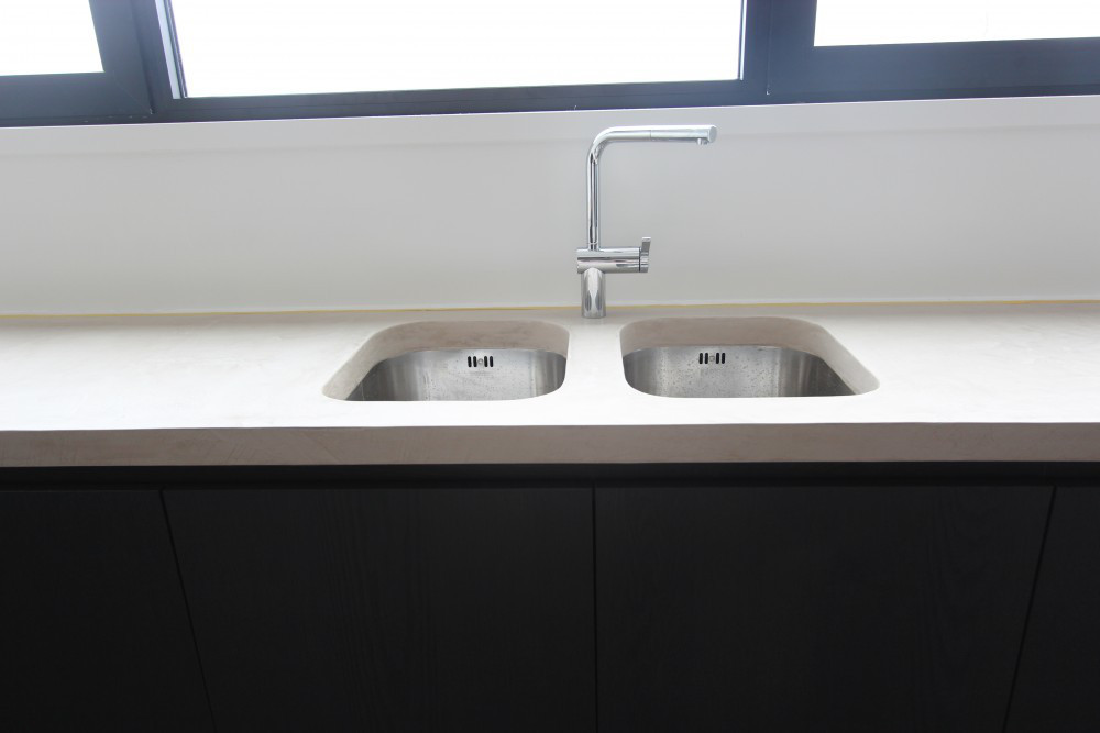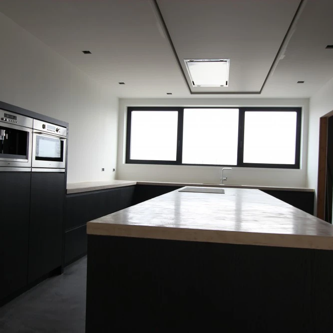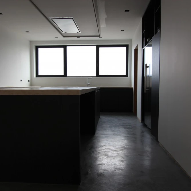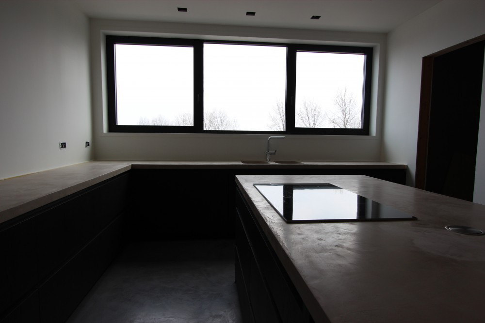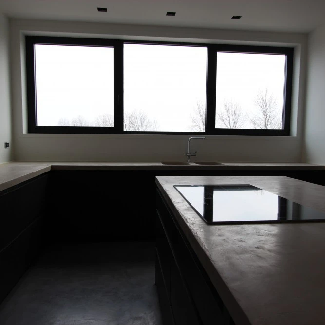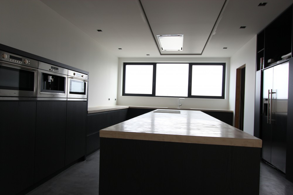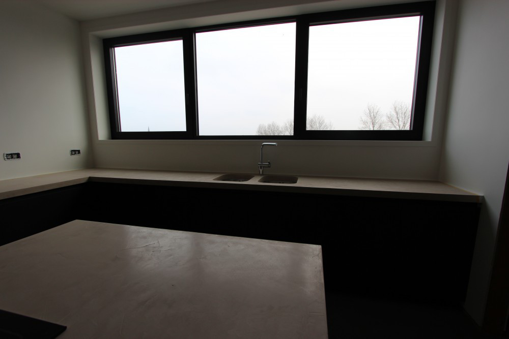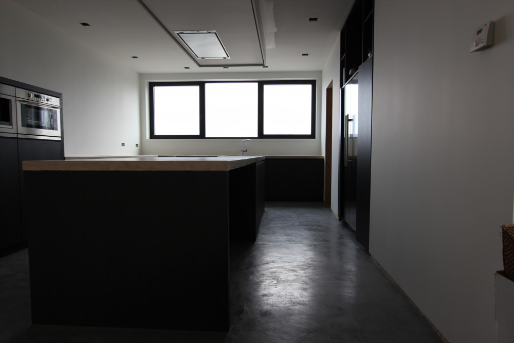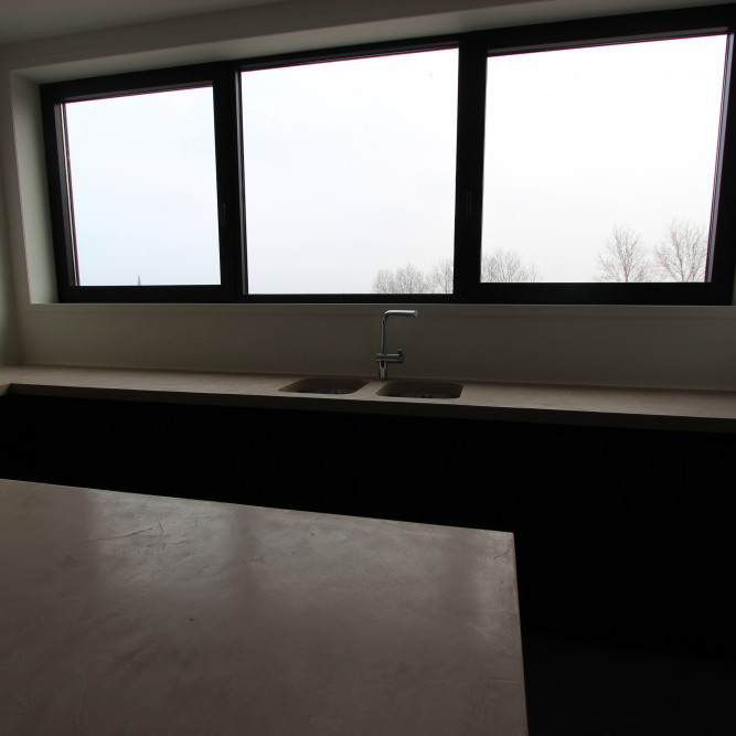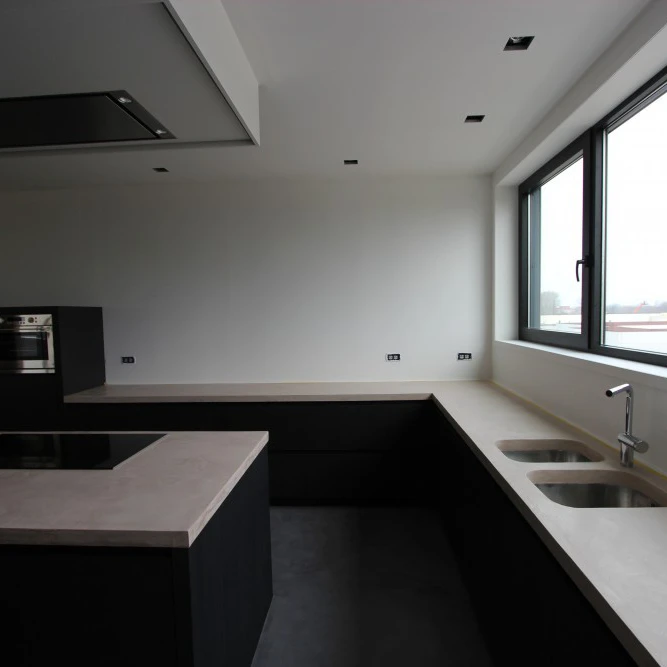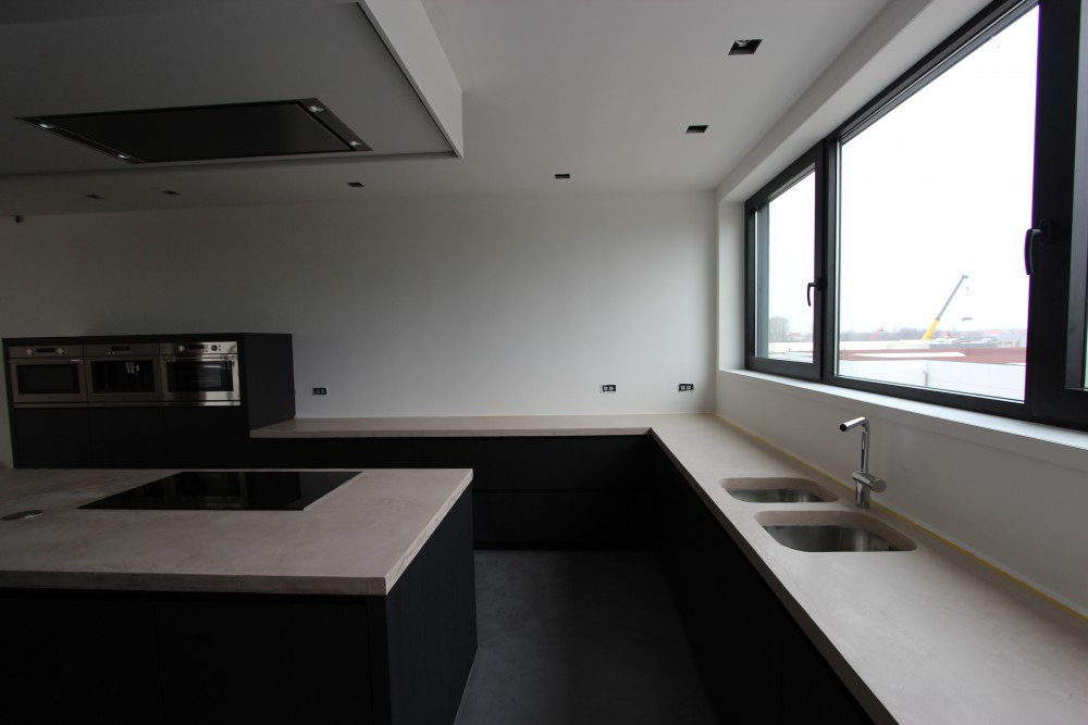 In deze loft in Knokke hebben wij het volledige concept van keuken, vloeren, toilet als badkamer gedaan. In deze keuken hebben wij het werkgedeelte van de keuken(werkblad en keukenblok) in naturel kleur Mortex afgewerkt.