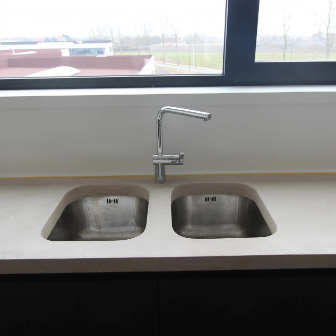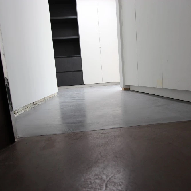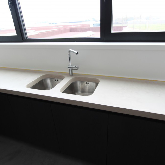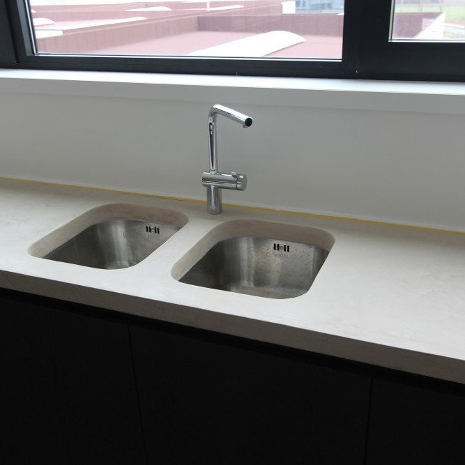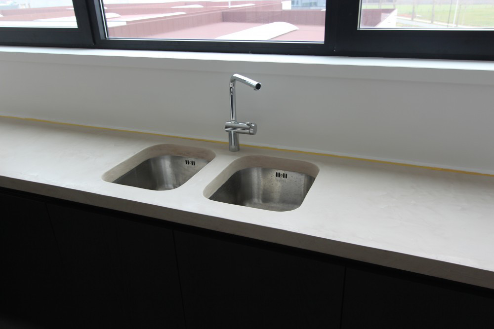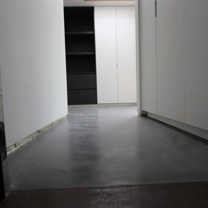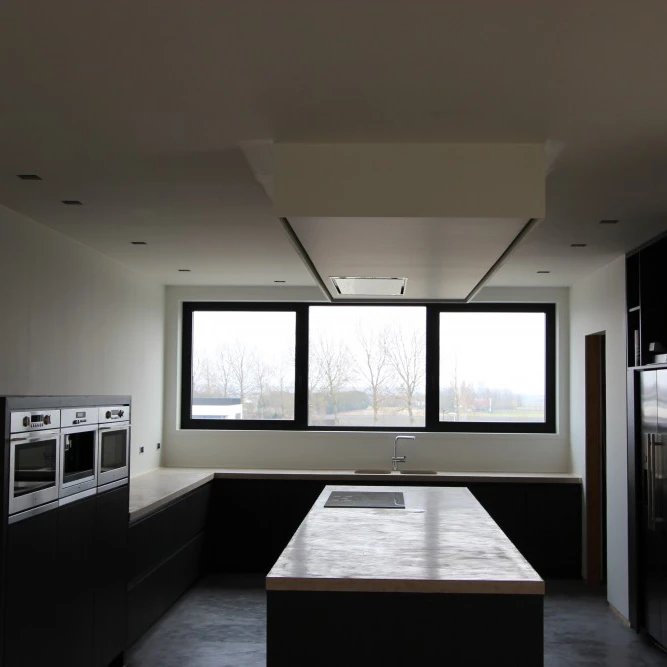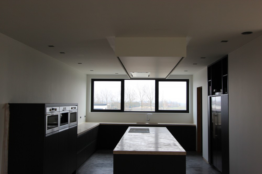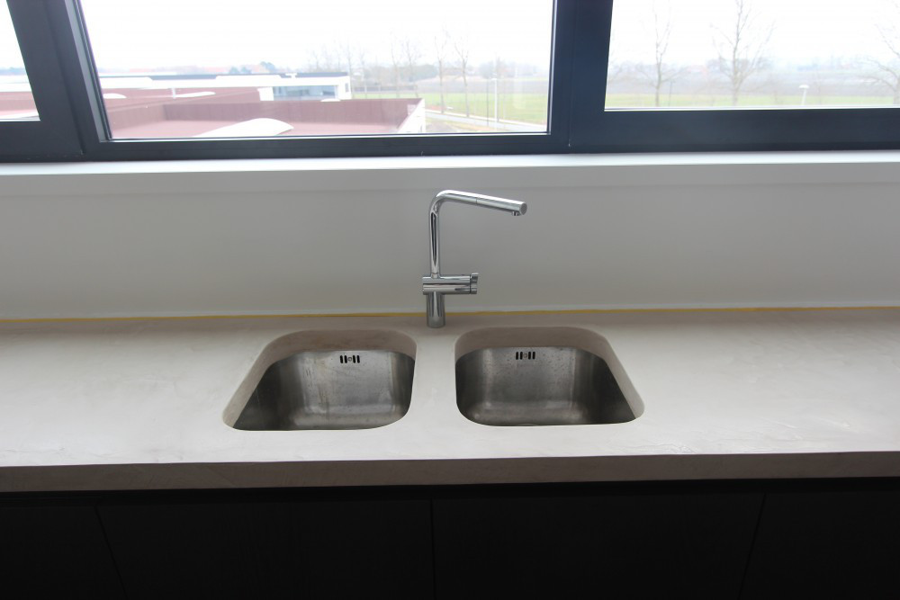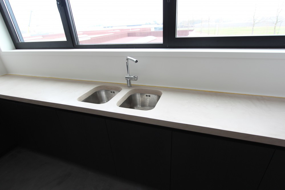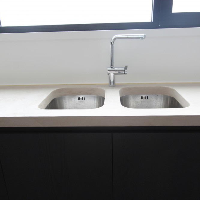 In deze loft in Knokke hebben wij het volledige concept van keuken, vloeren, toilet als badkamer gedaan. In deze keuken hebben wij het werkgedeelte van de keuken(werkblad en keukenblok) in naturel kleur Mortex afgewerkt.