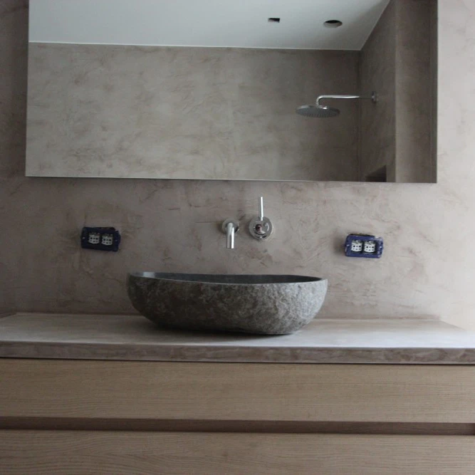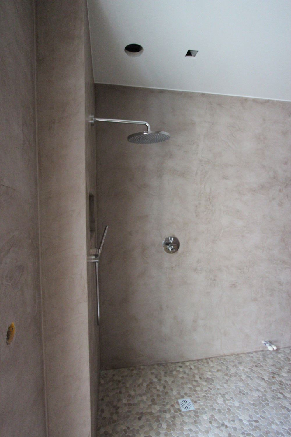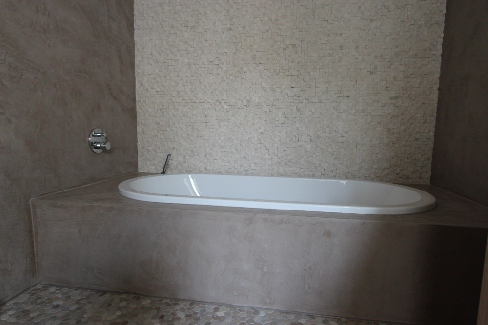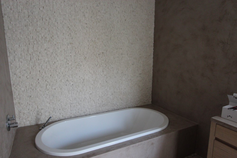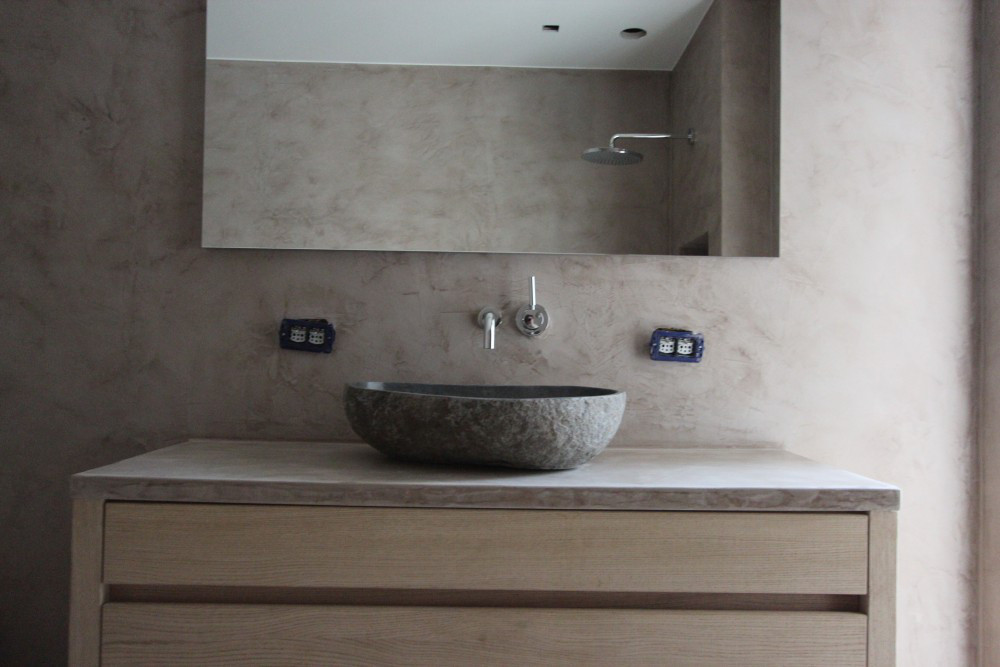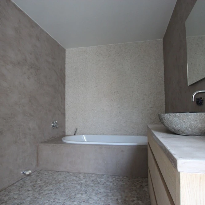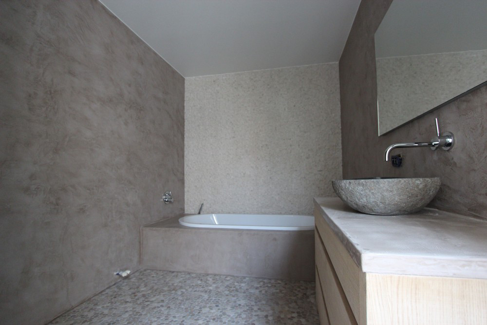 In de badkamer werd Mortex geplaatst in de doucheruimte en op 3 wanden; de wand achter het bad kreeg een afwerking in natuursteen.