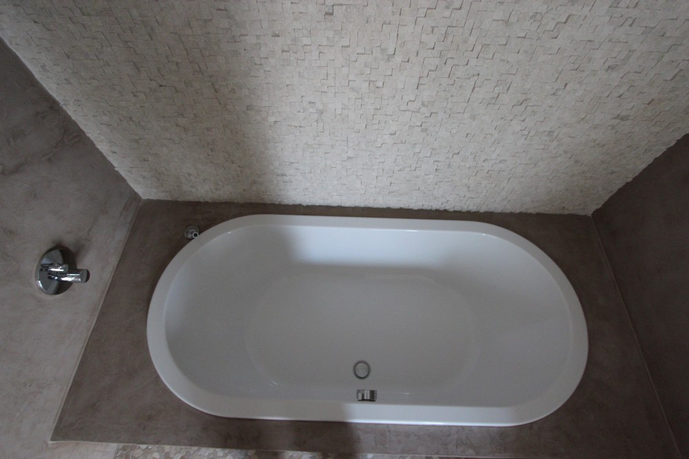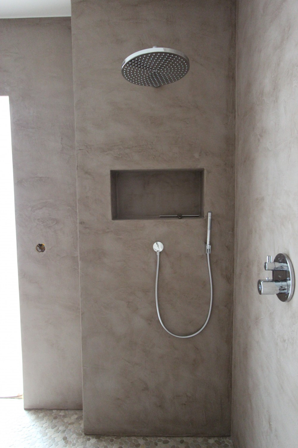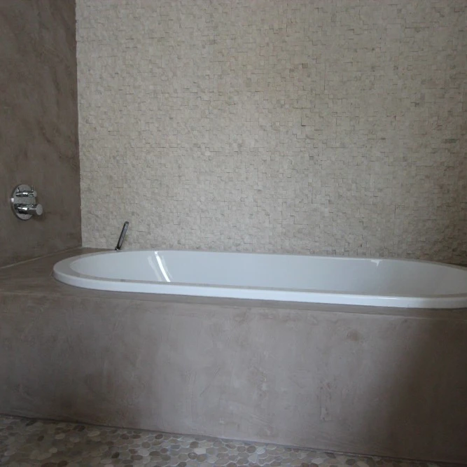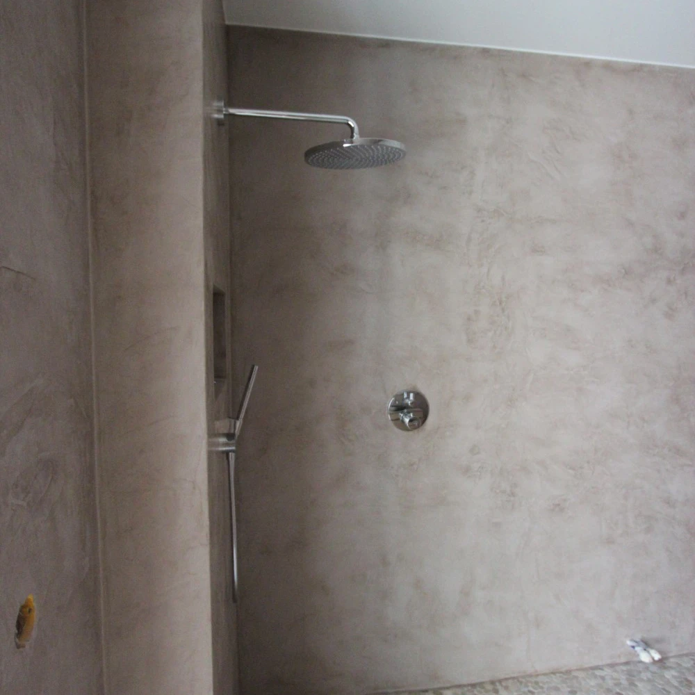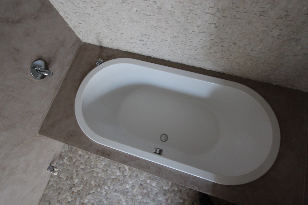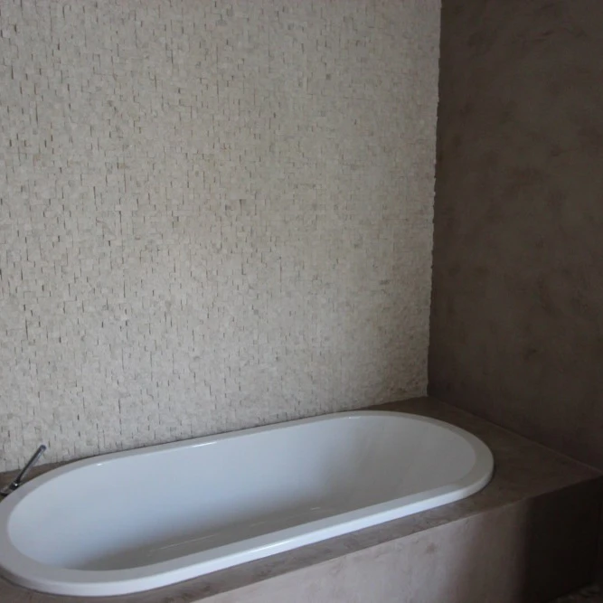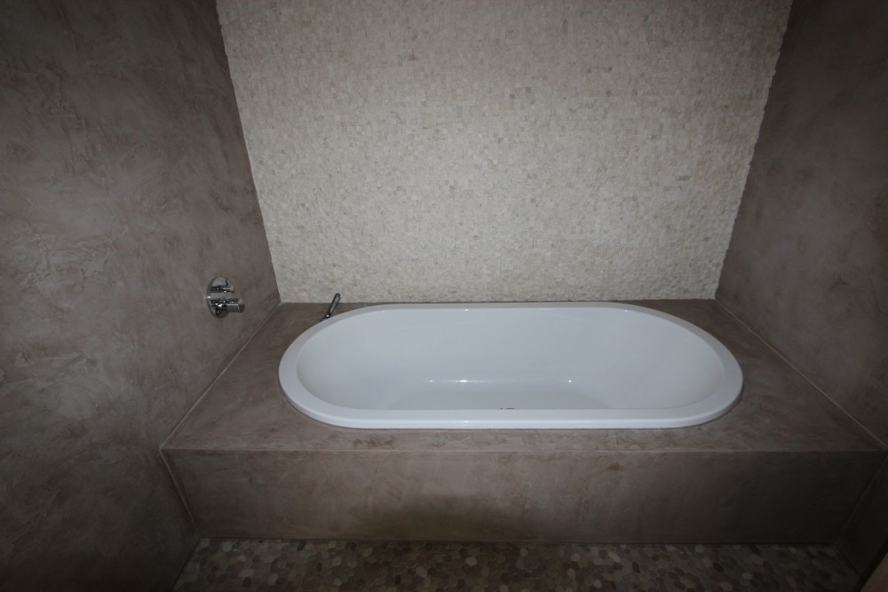 In de badkamer werd Mortex geplaatst in de doucheruimte en op 3 wanden; de wand achter het bad kreeg een afwerking in natuursteen.