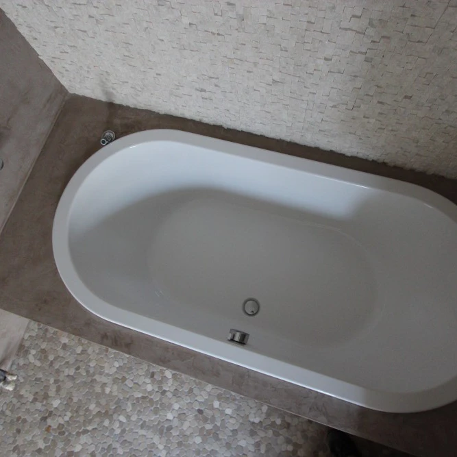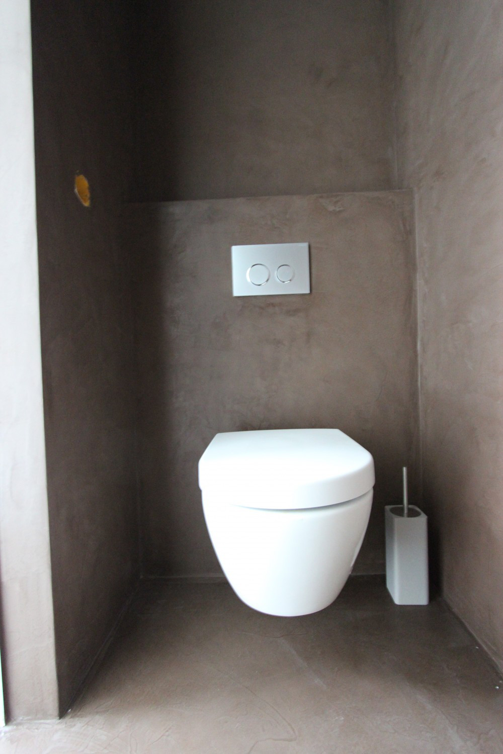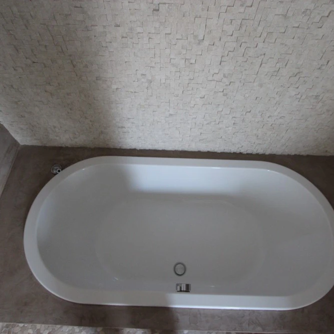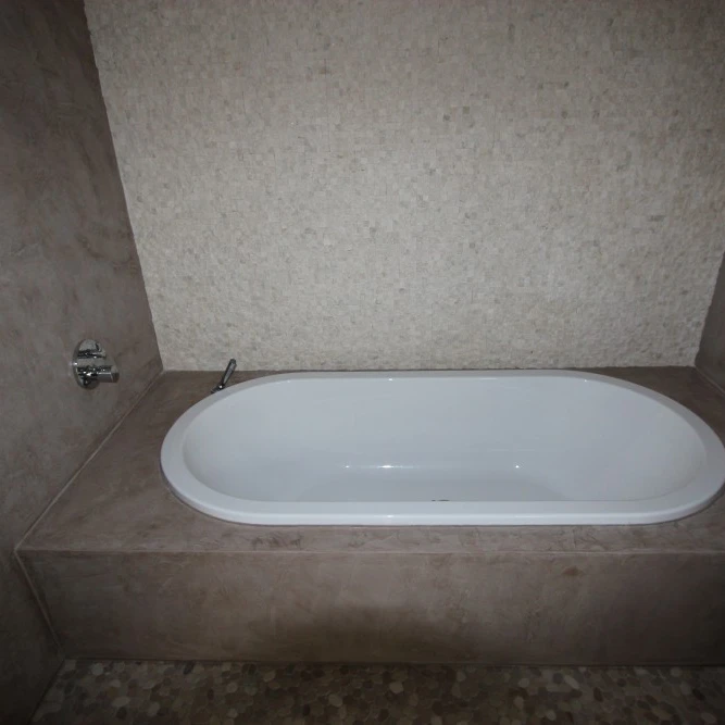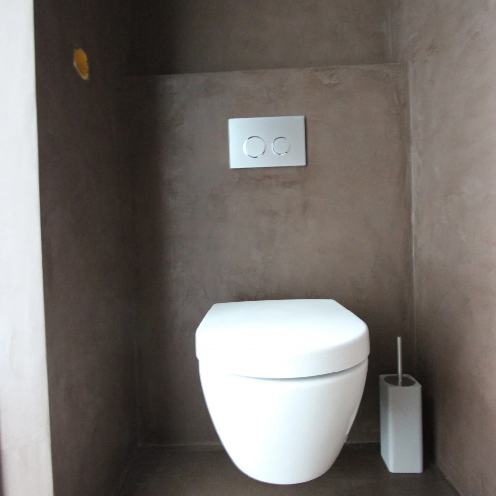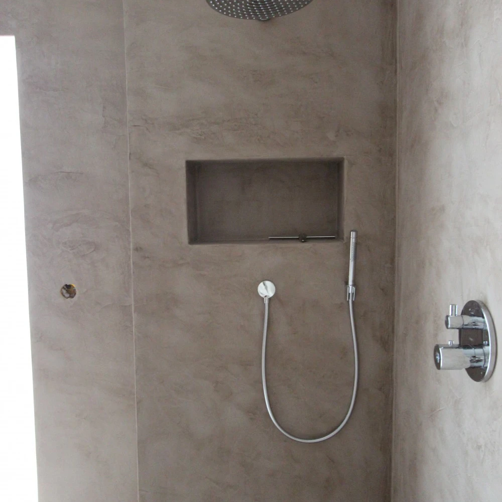 In de badkamer werd Mortex geplaatst in de doucheruimte en op 3 wanden; de wand achter het bad kreeg een afwerking in natuursteen.