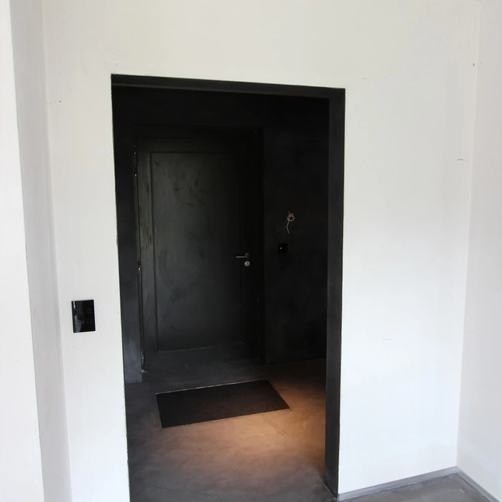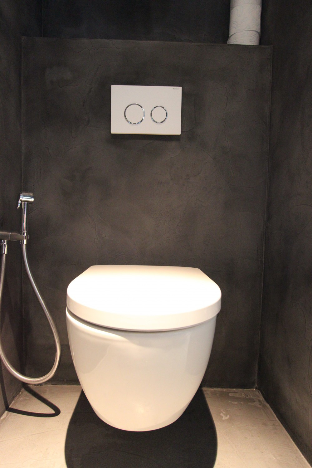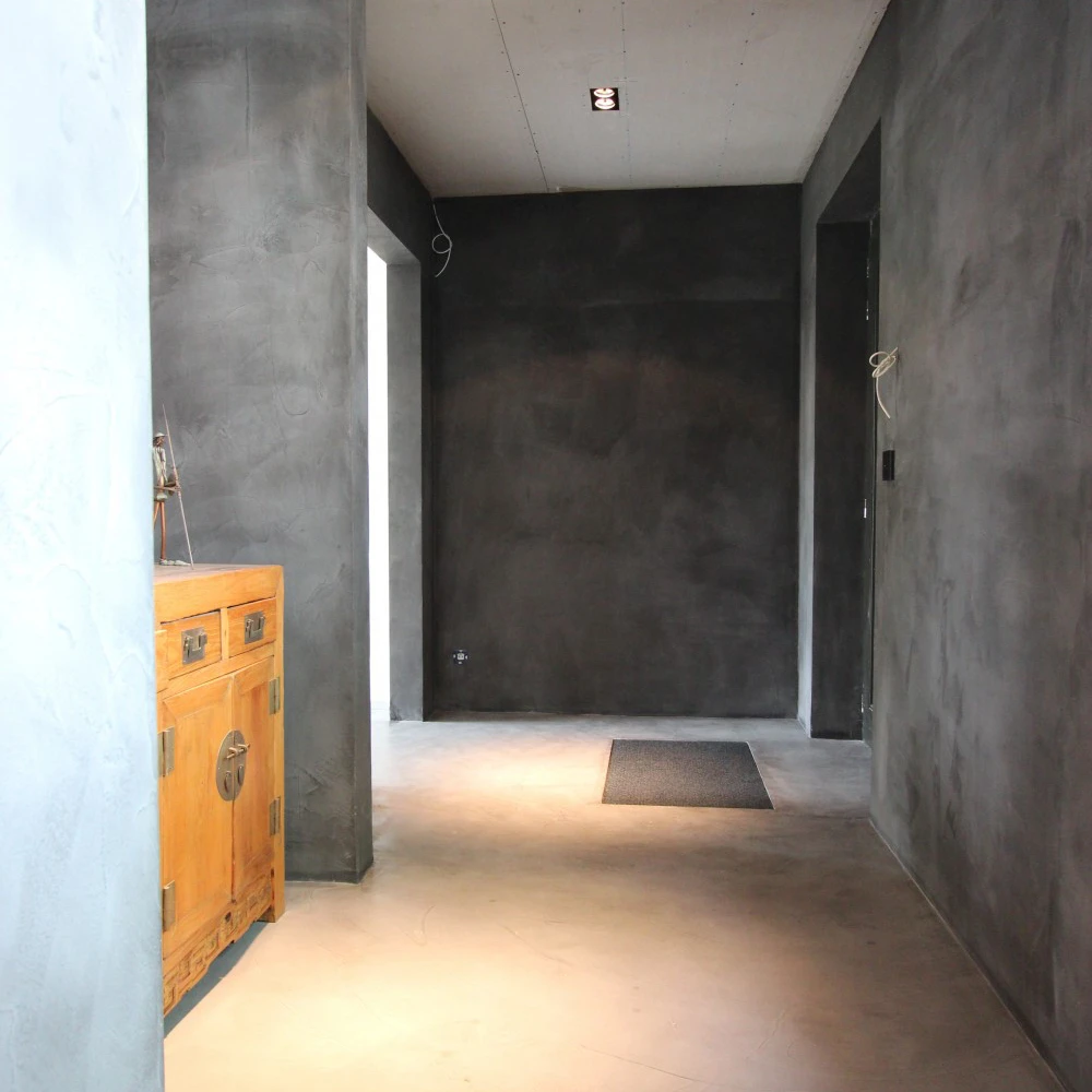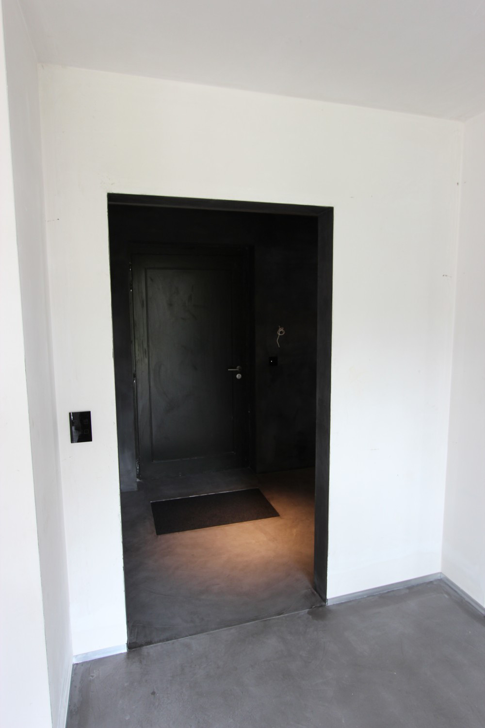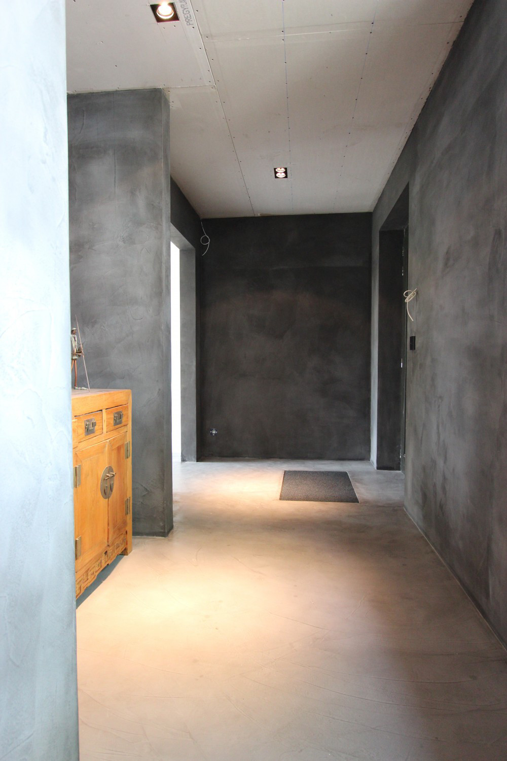 Zowel de vloer en wanden van de inkomhal, de volledige toiletruimte als de vloer in de woonkamer werden uitgevoerd in zwarte Mortex.