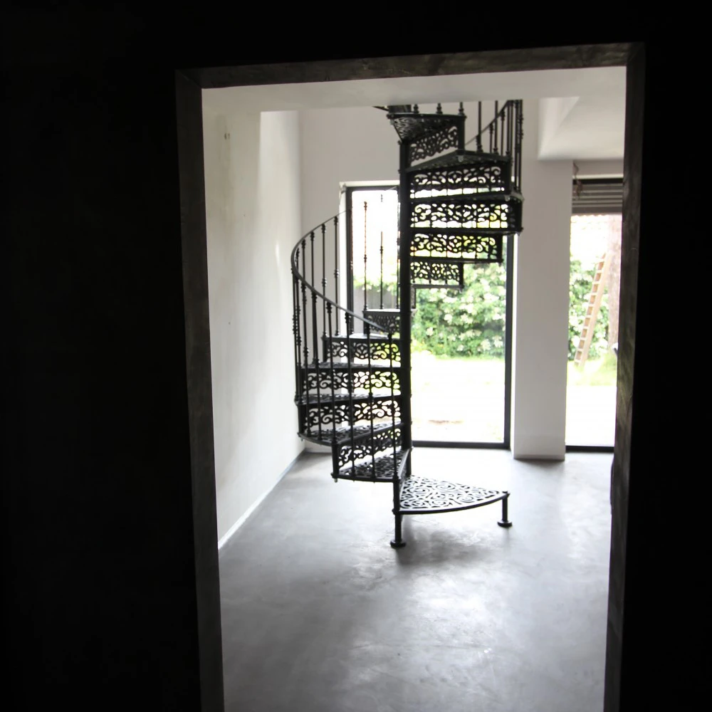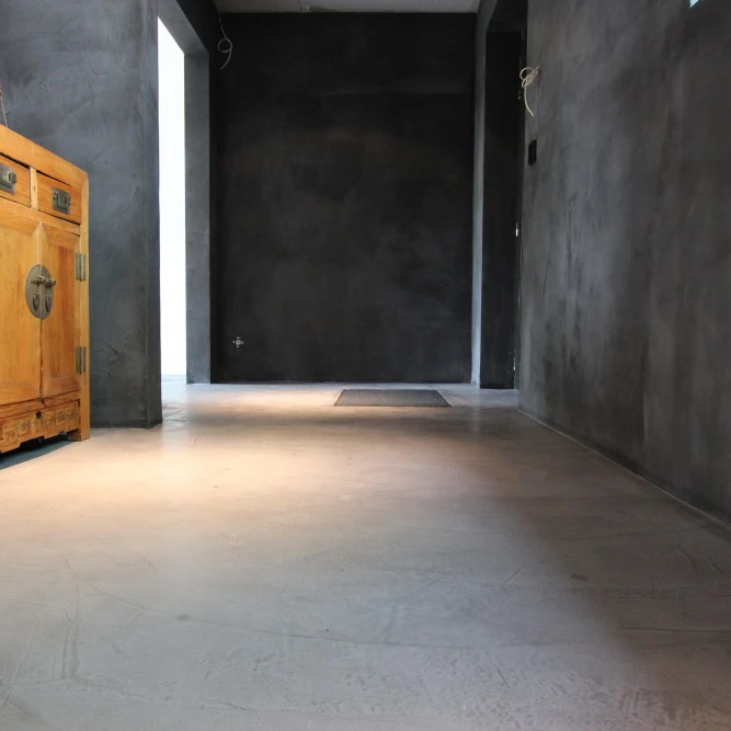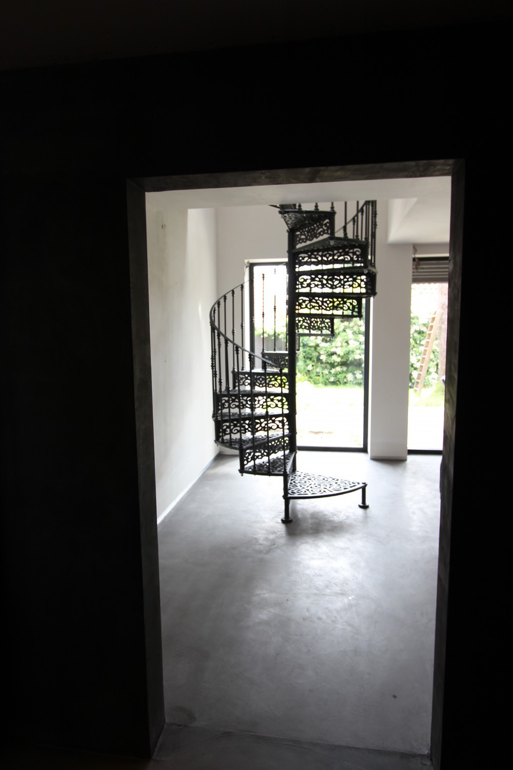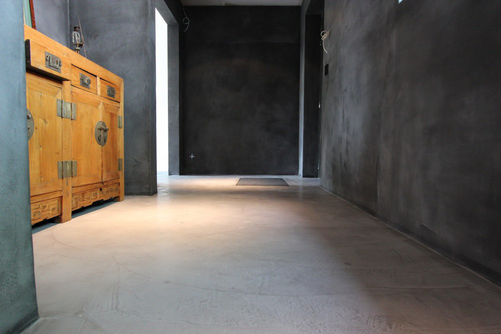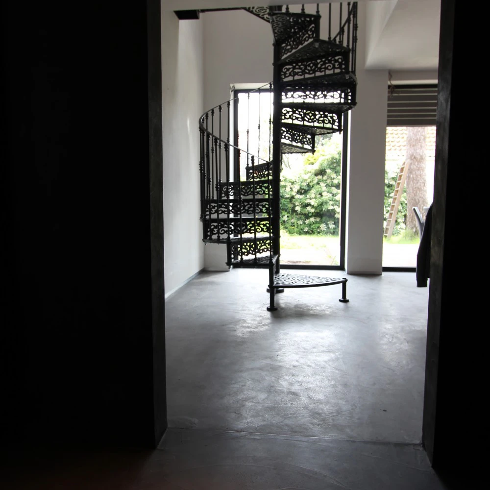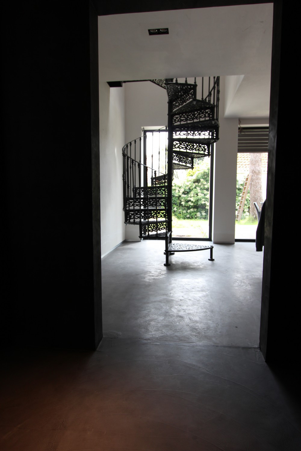 Zowel de vloer en wanden van de inkomhal, de volledige toiletruimte als de vloer in de woonkamer werden uitgevoerd in zwarte Mortex.