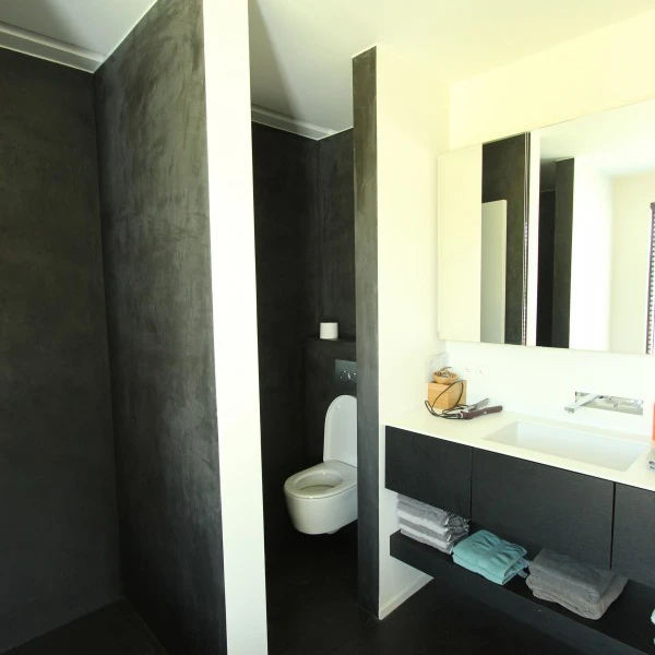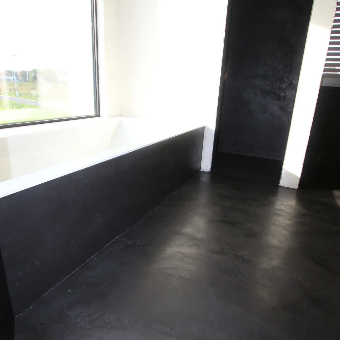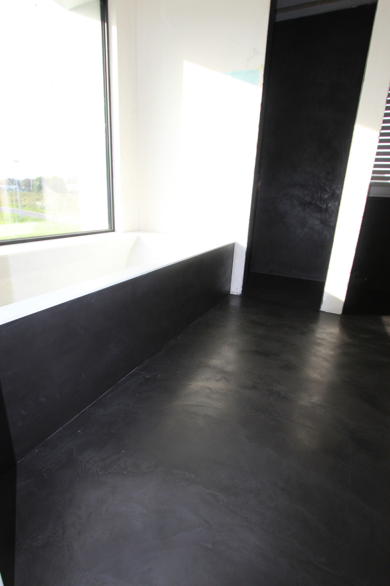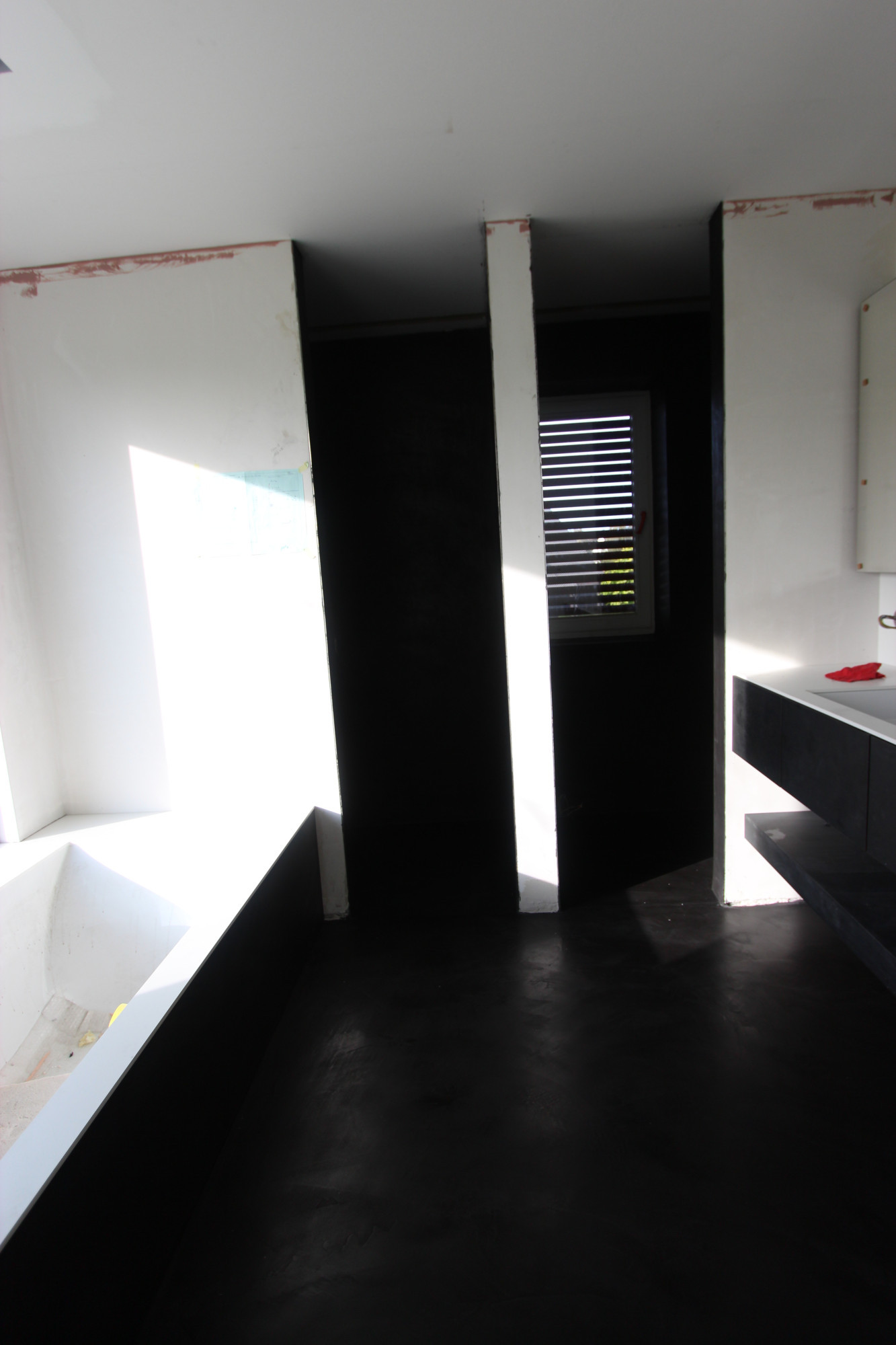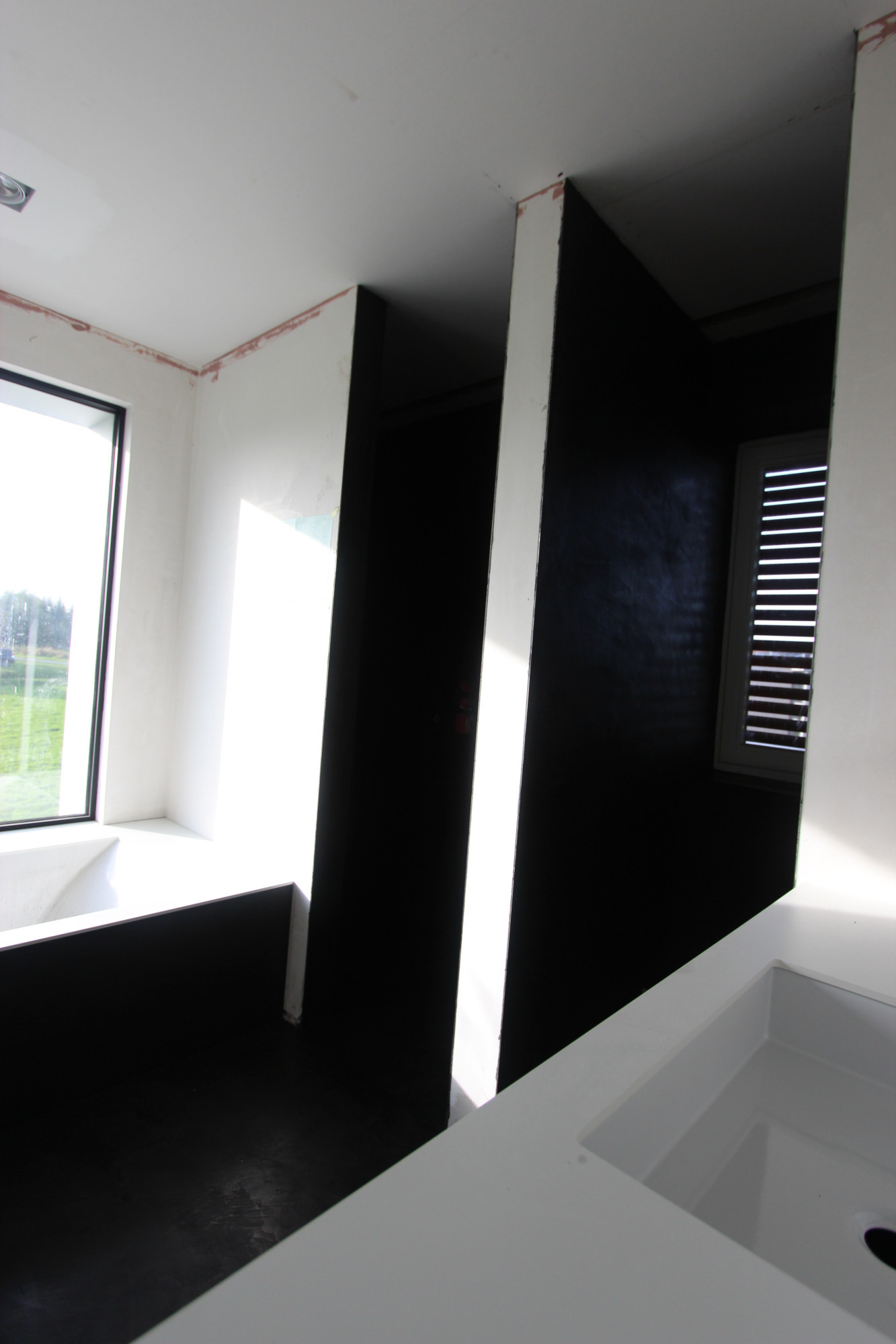 Zwart is de hoofdtoon!Zowel vloeren als doucheruimtes werden uitgewerkt in zwarte Mortex.