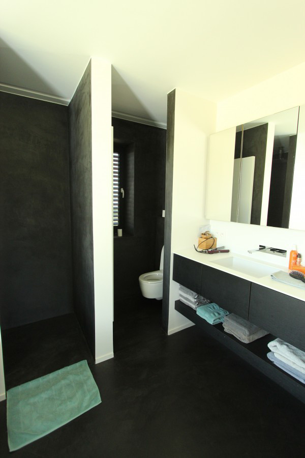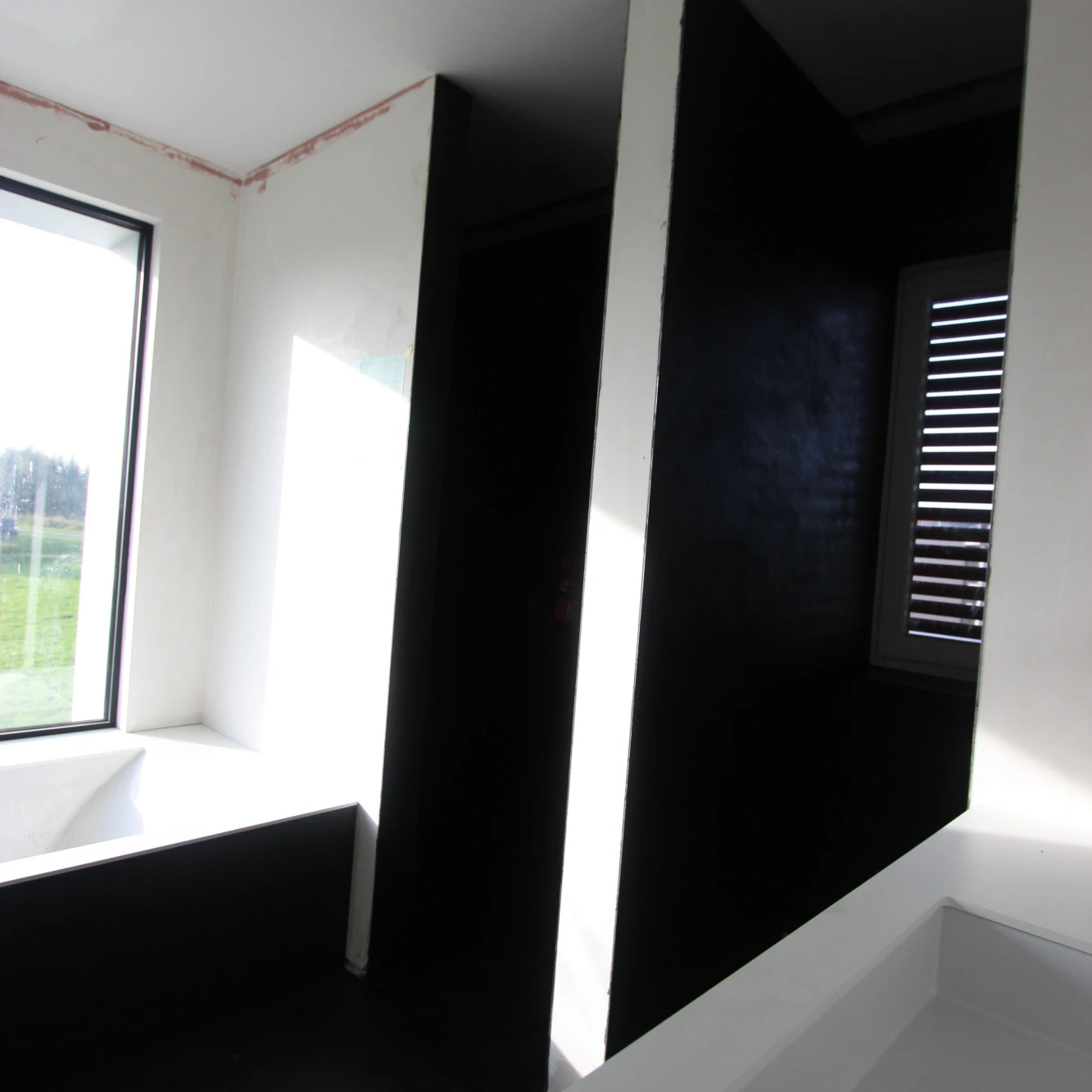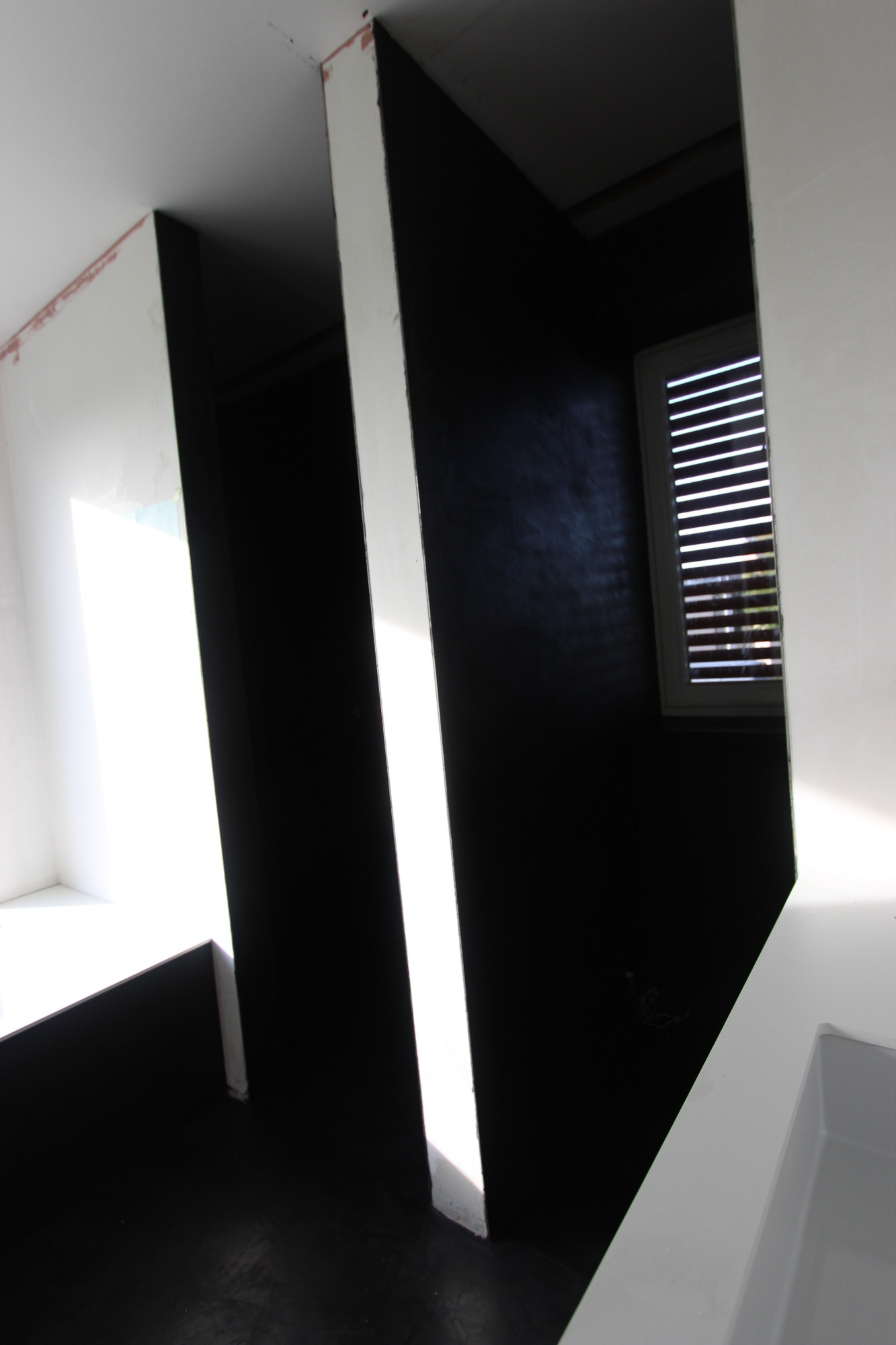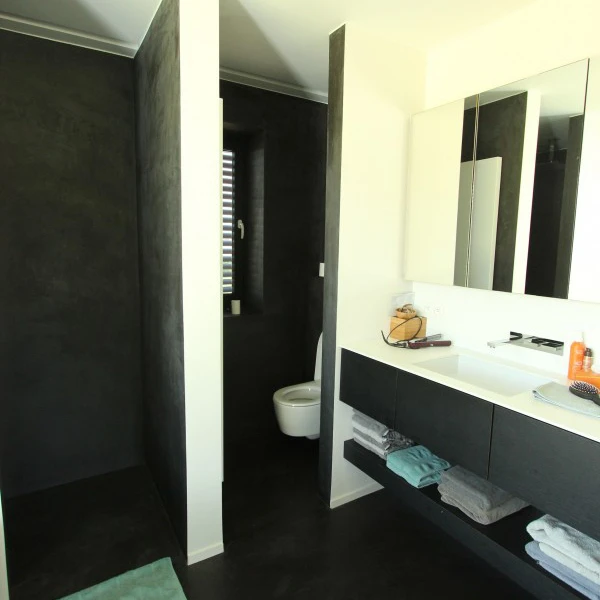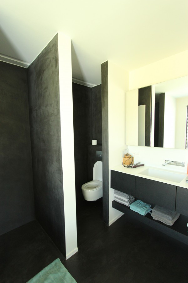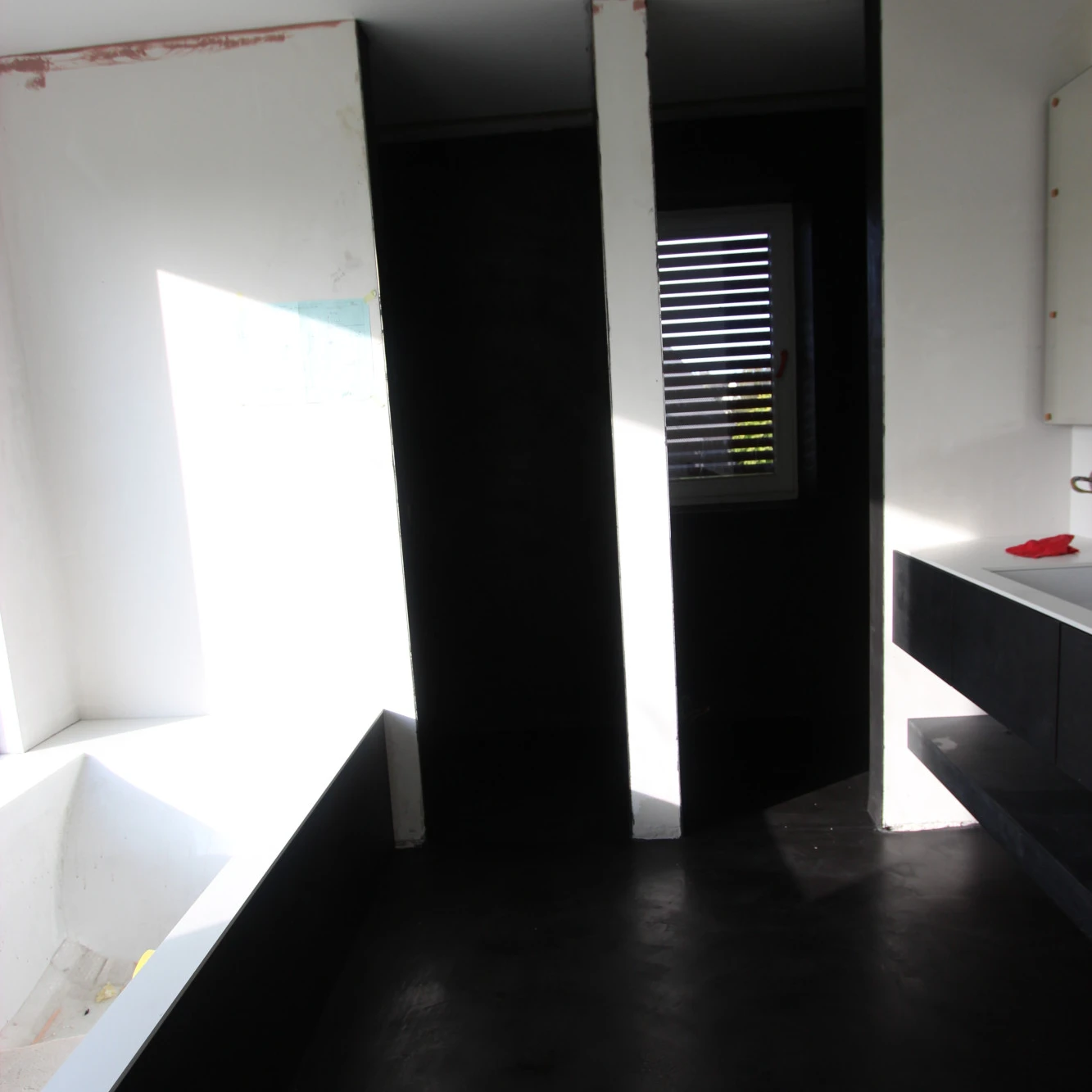 Zwart is de hoofdtoon!Zowel vloeren als doucheruimtes werden uitgewerkt in zwarte Mortex.