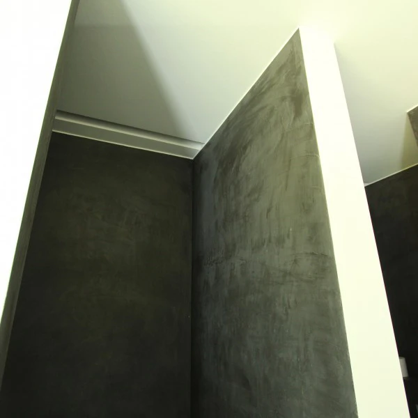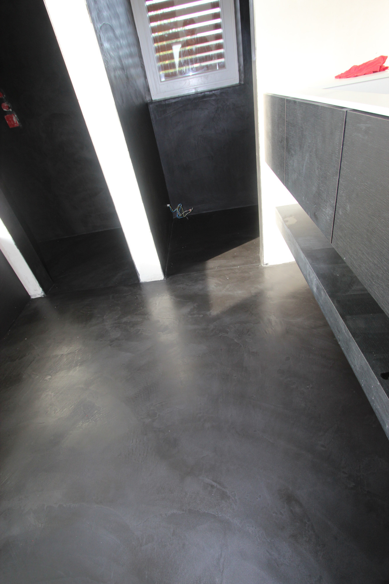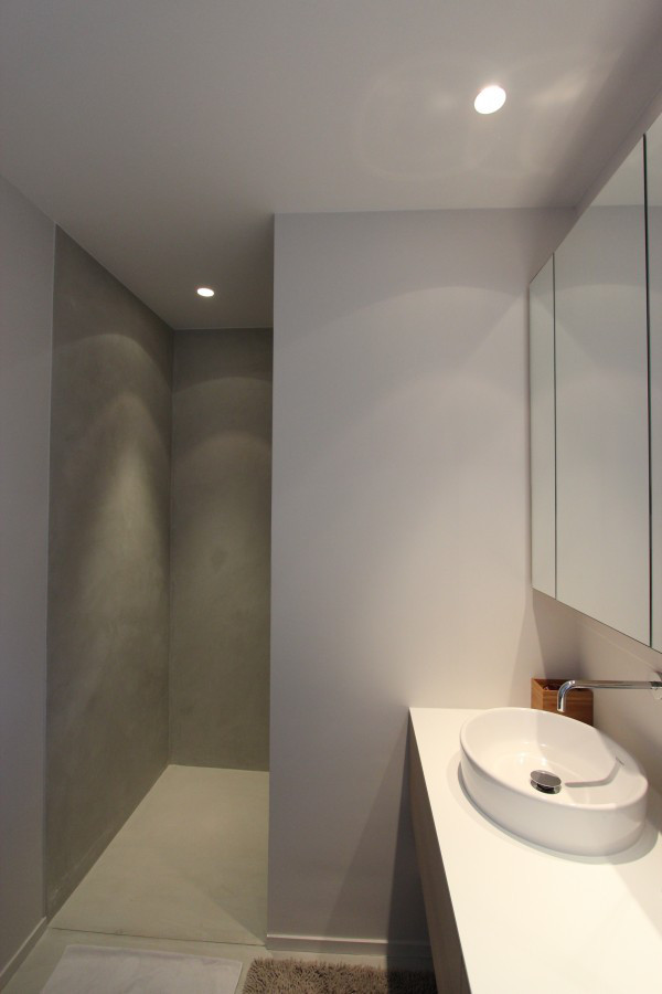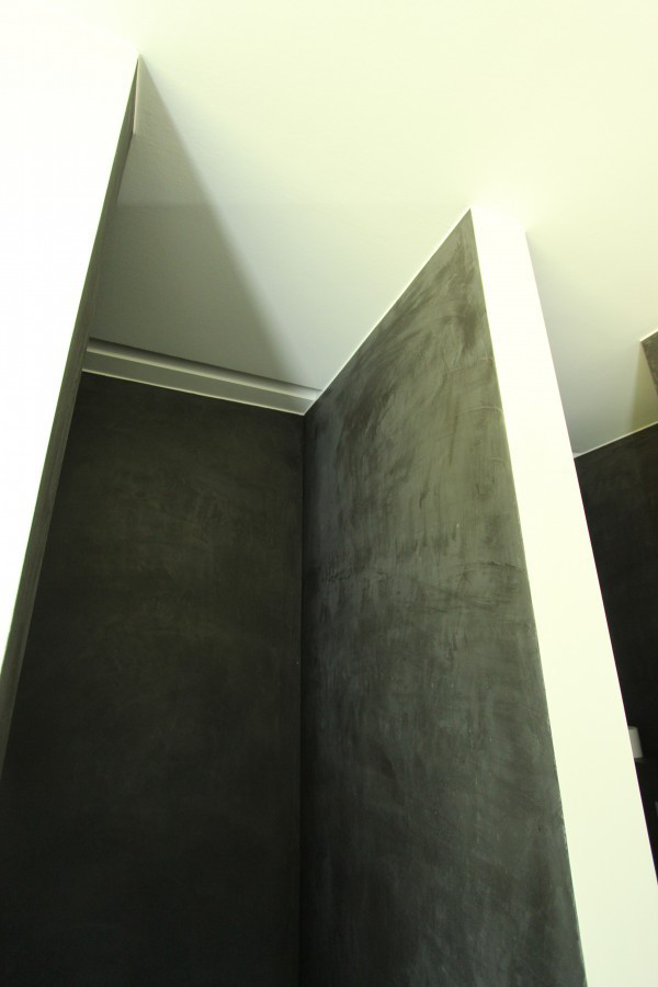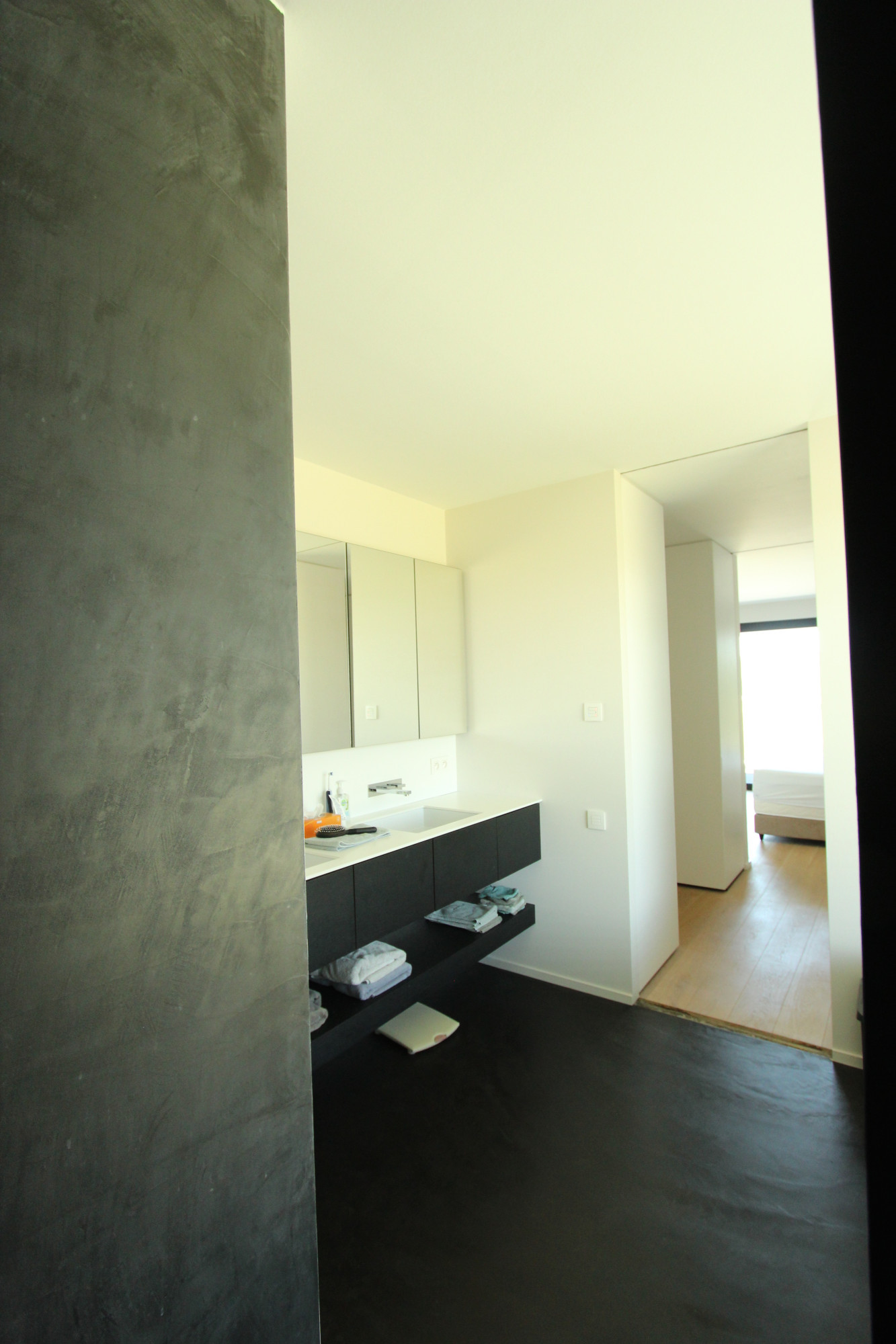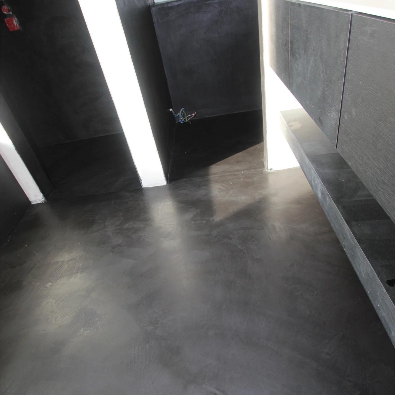 Zwart is de hoofdtoon!Zowel vloeren als doucheruimtes werden uitgewerkt in zwarte Mortex.