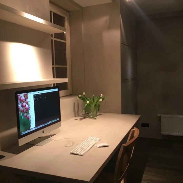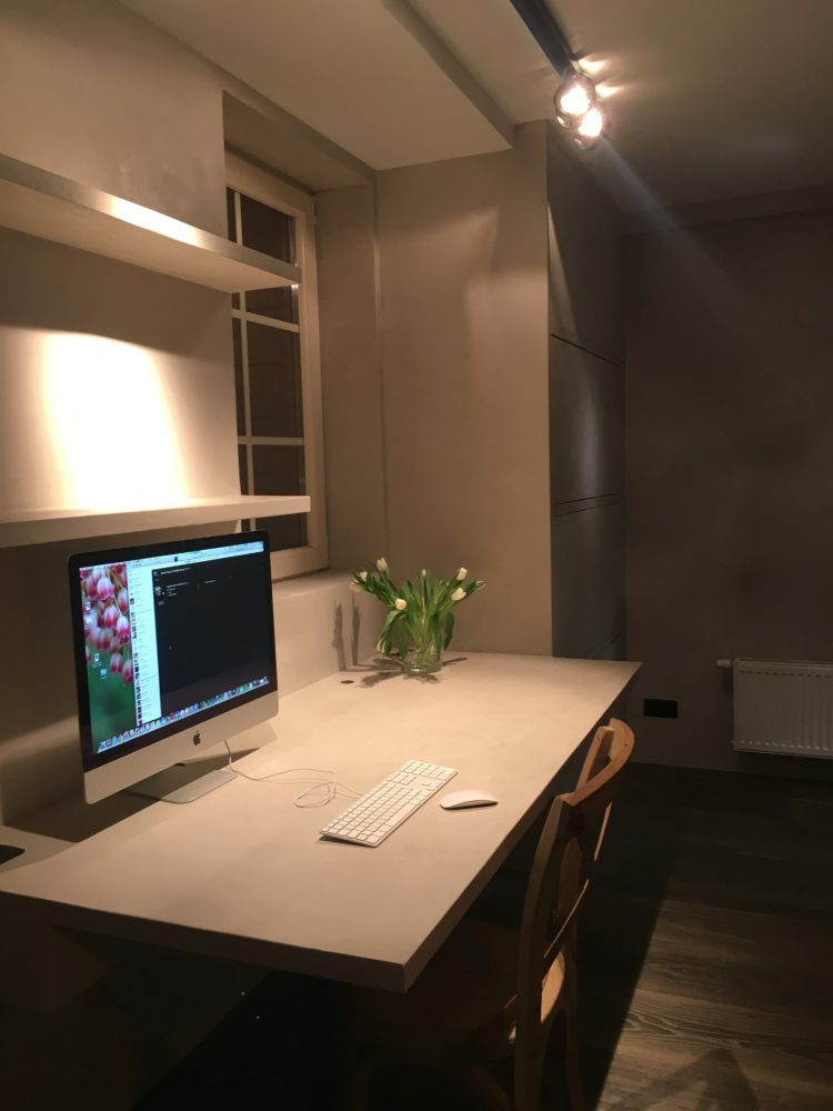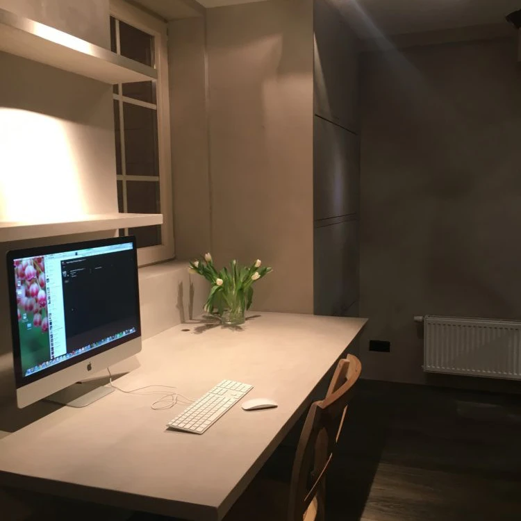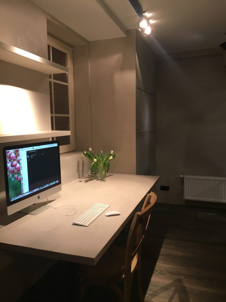 Hier werd de ruimte optimaal benut door bureel, wanden en kasten uit te werken in hetzelfde materiaal microtopping.