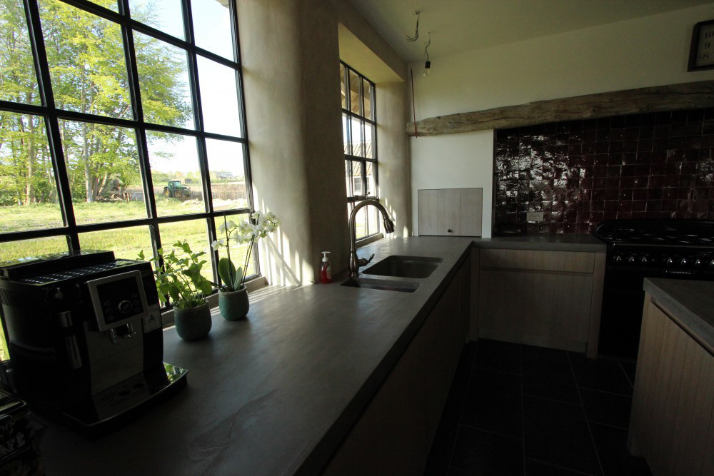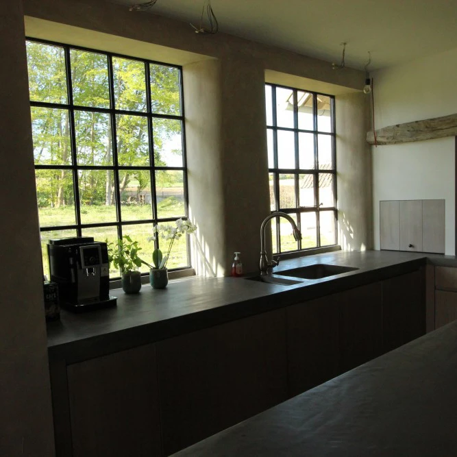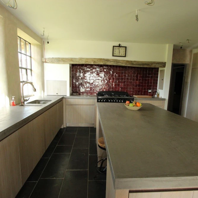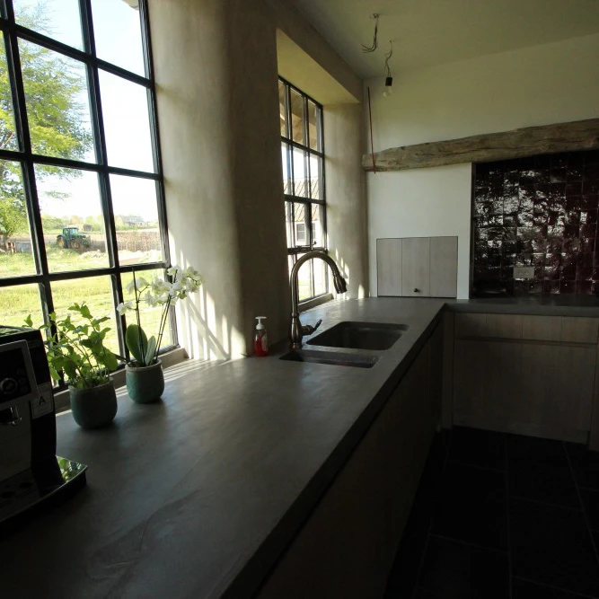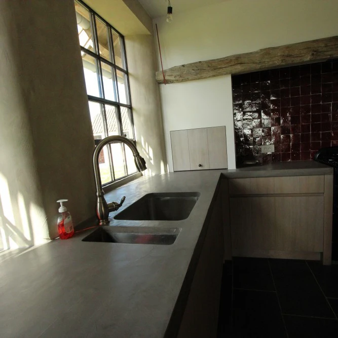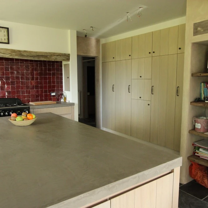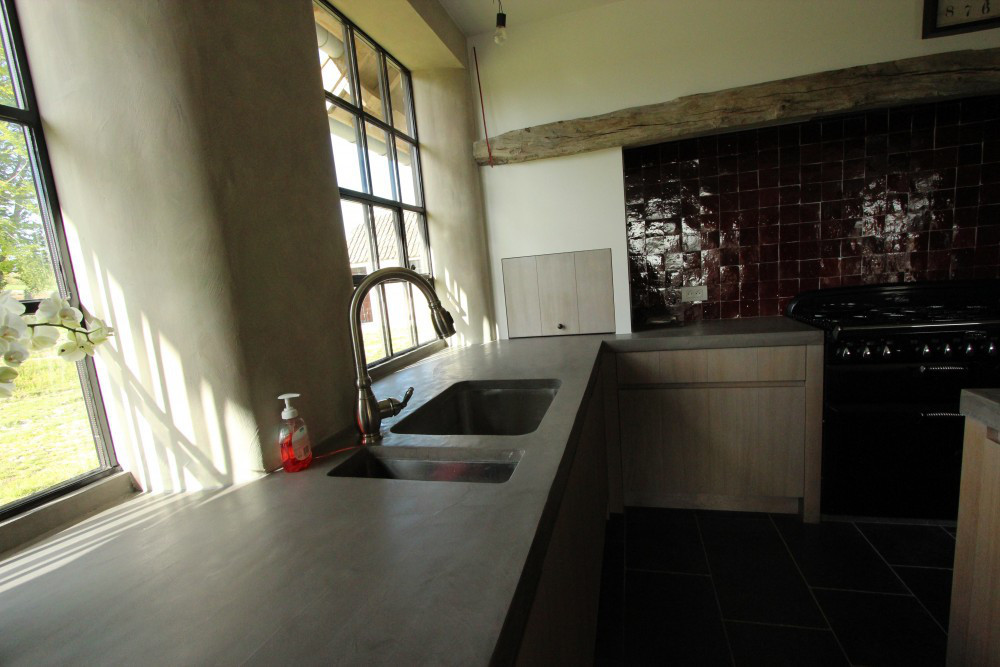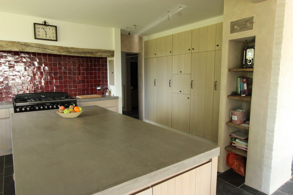 In deze landelijke keuken werden zowel werkblad als spatwand afgewerkt met Mortex in een warme kleur.De douche en badomkasting werden tevens uitgewerkt in Mortex.