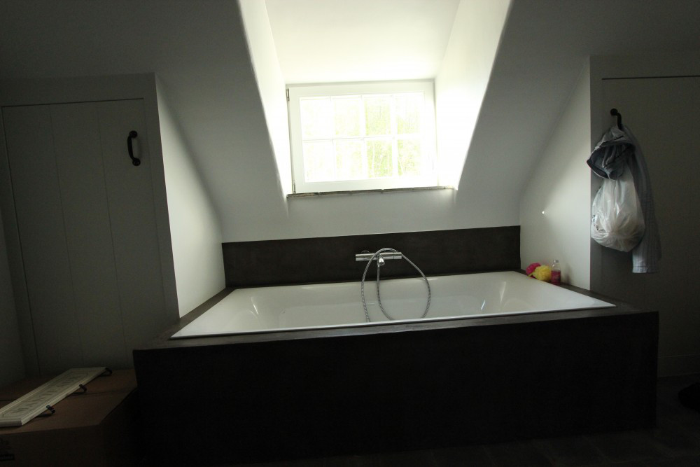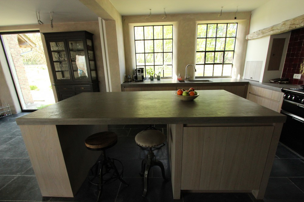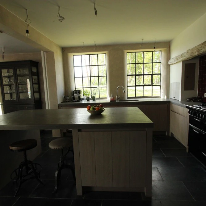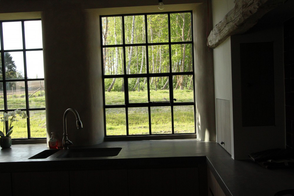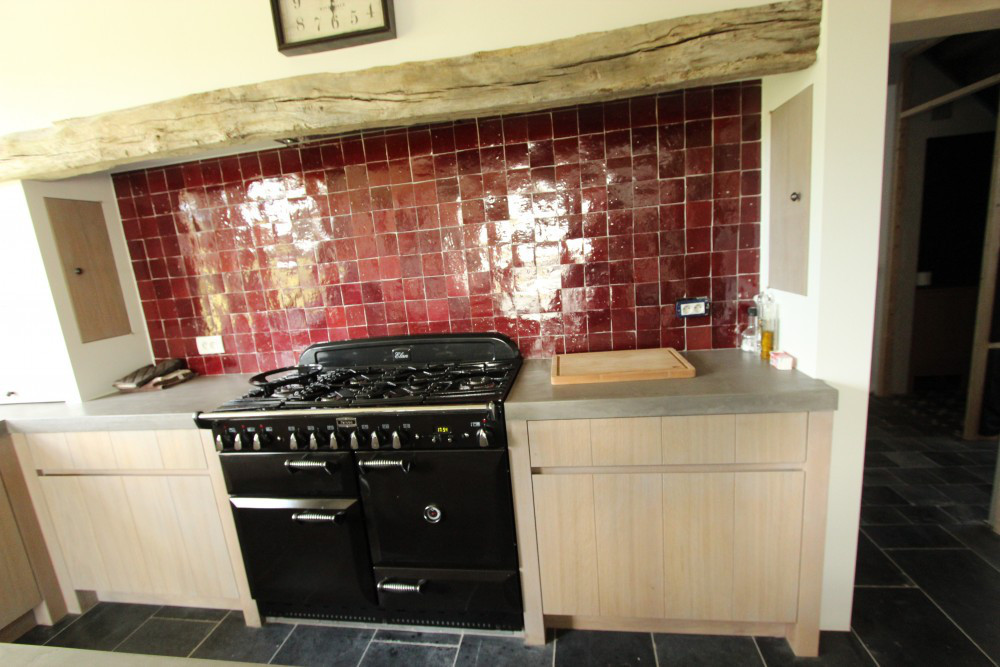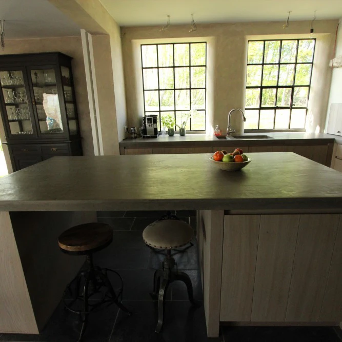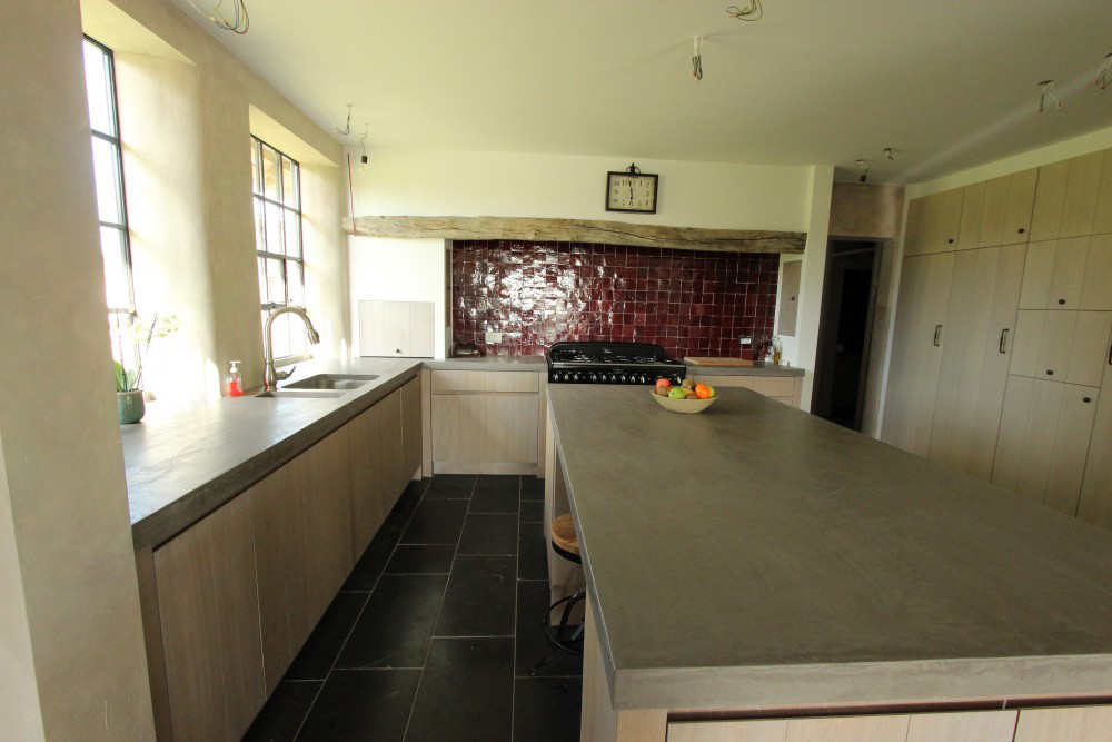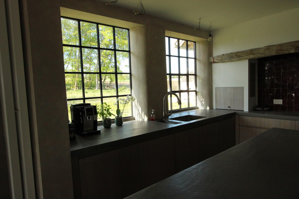 In deze landelijke keuken werden zowel werkblad als spatwand afgewerkt met Mortex in een warme kleur.De douche en badomkasting werden tevens uitgewerkt in Mortex.