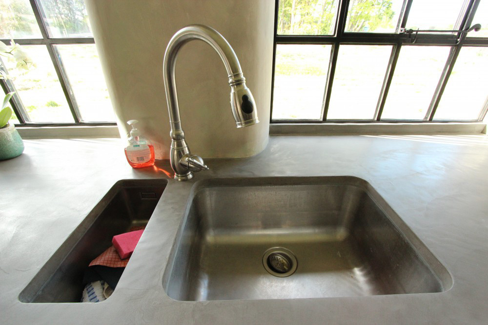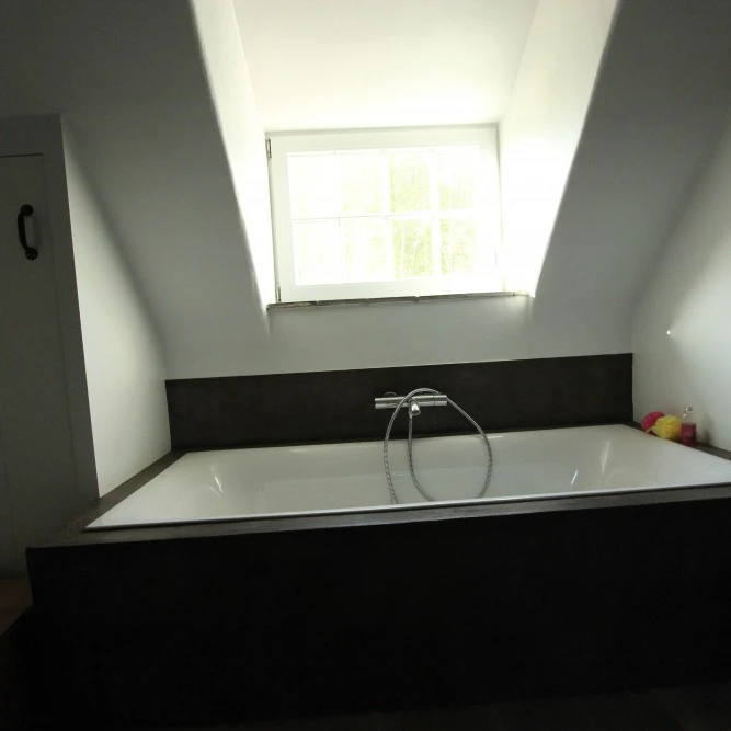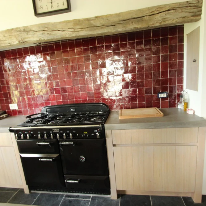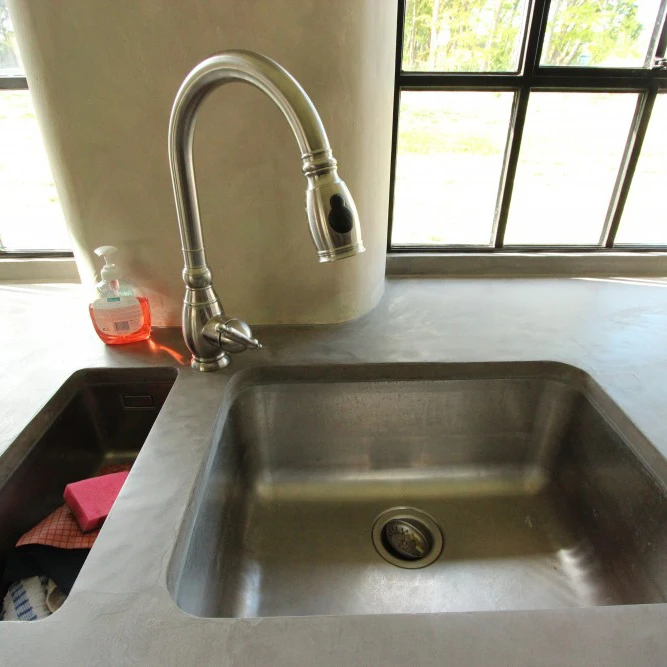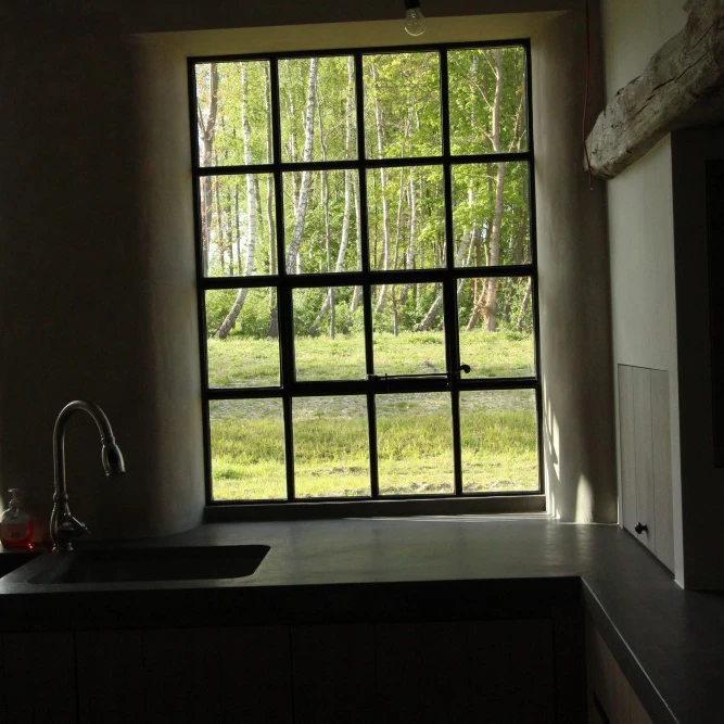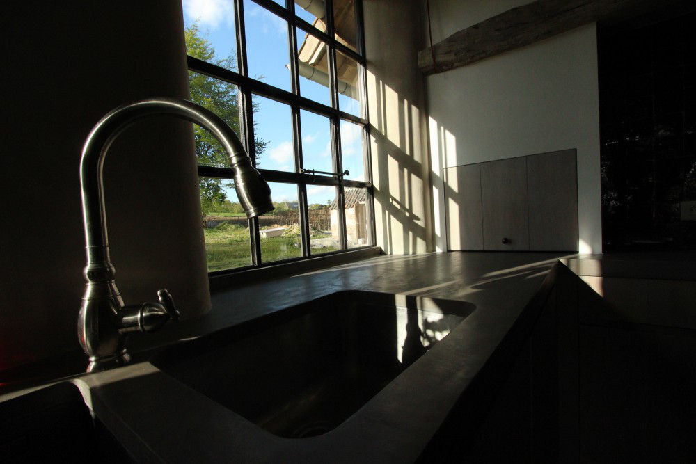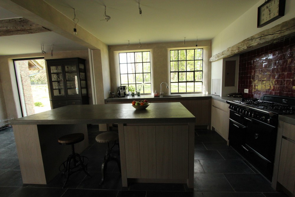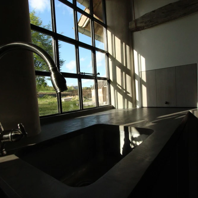 In deze landelijke keuken werden zowel werkblad als spatwand afgewerkt met Mortex in een warme kleur.De douche en badomkasting werden tevens uitgewerkt in Mortex.