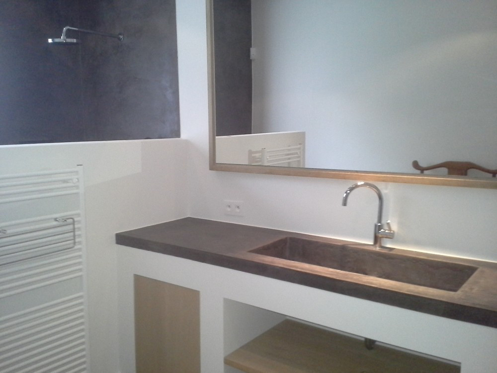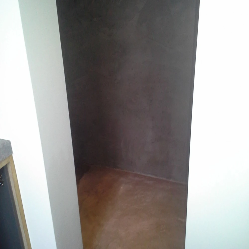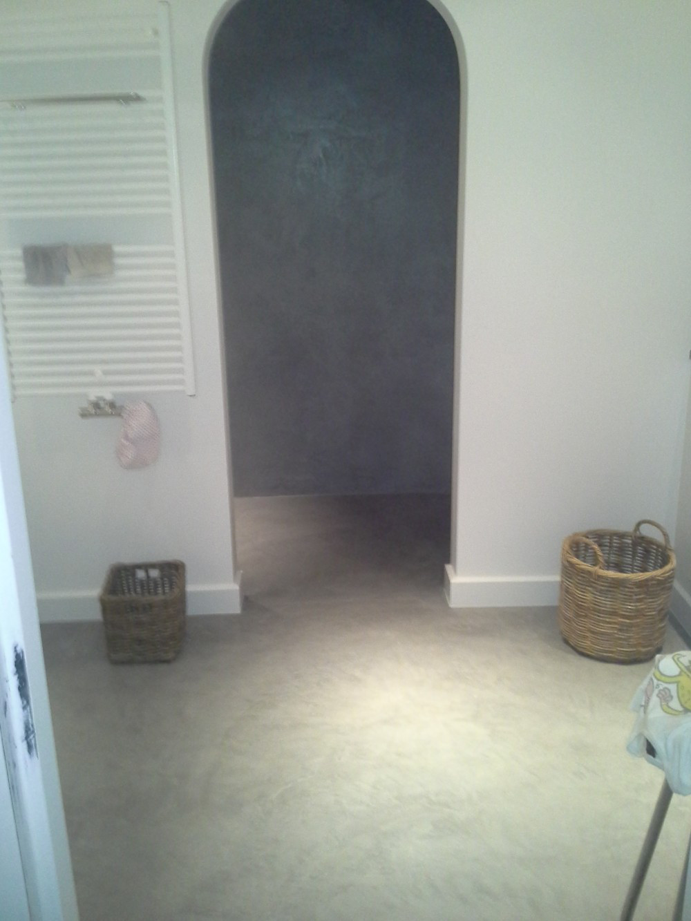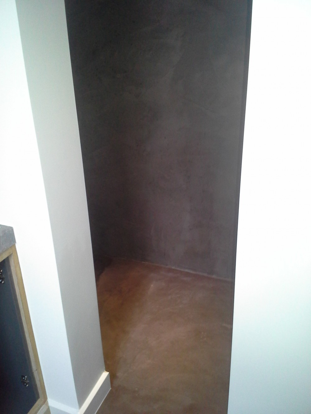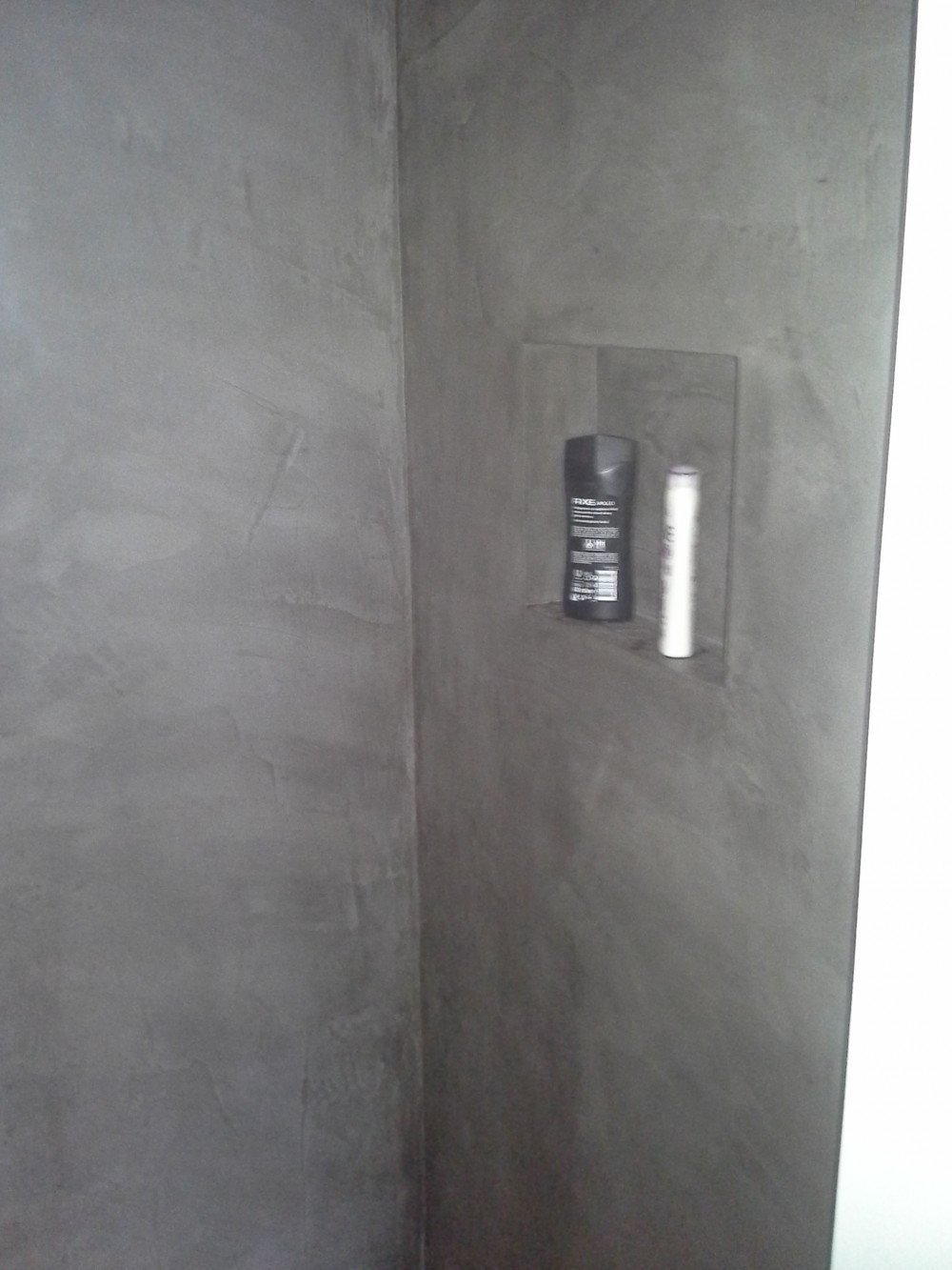 Zowel de vloeren, de douches, de badomkasting als het badmeubilair werden afgewerkt in Mortex.