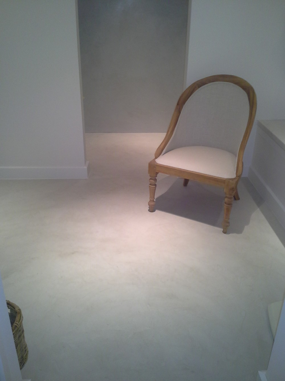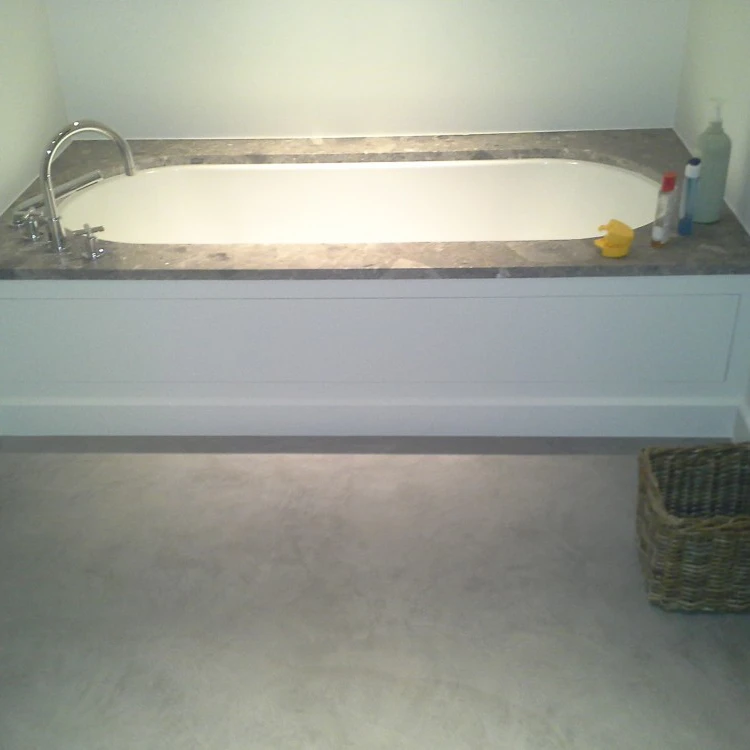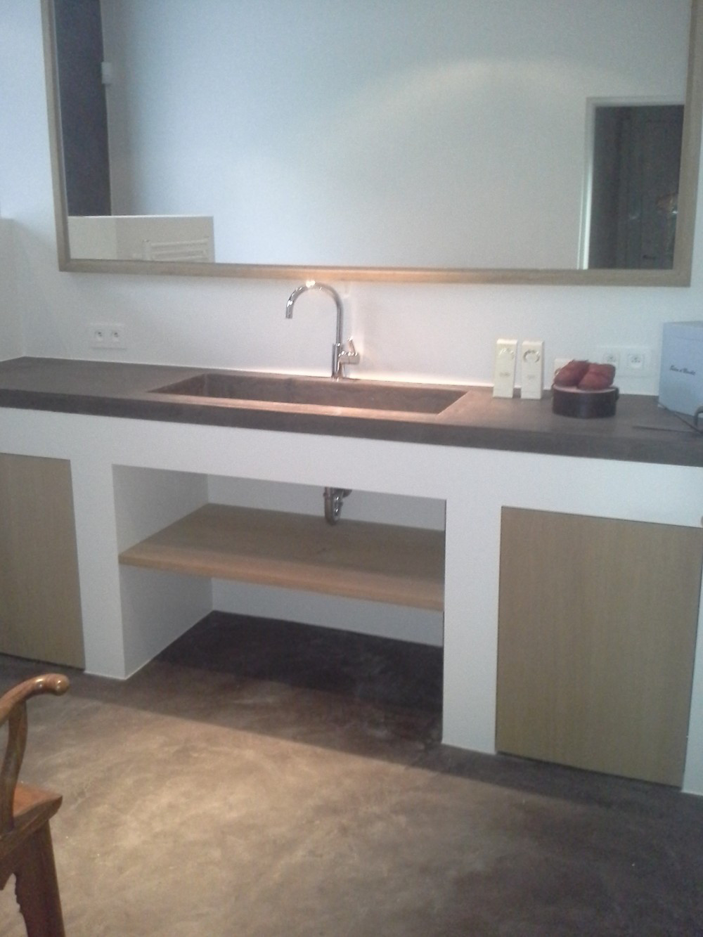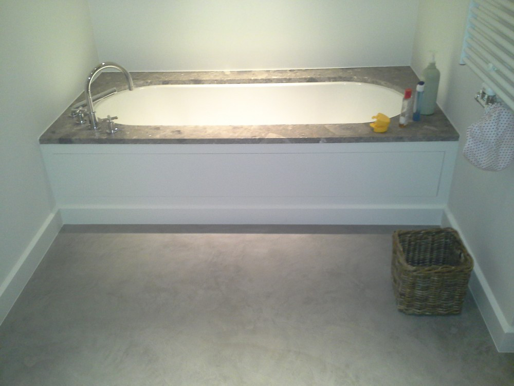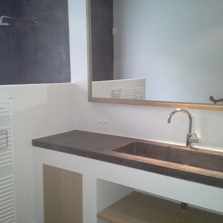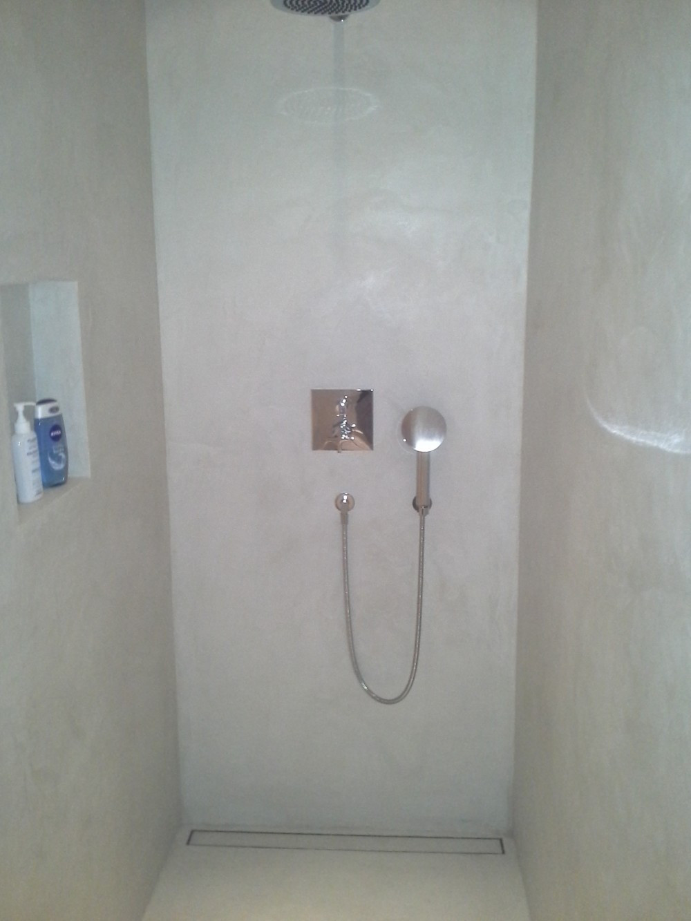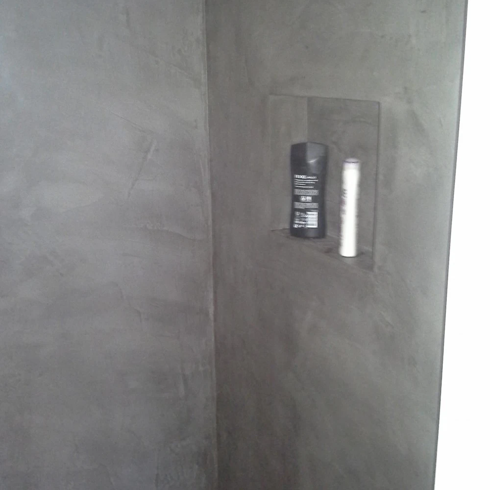 Zowel de vloeren, de douches, de badomkasting als het badmeubilair werden afgewerkt in Mortex.