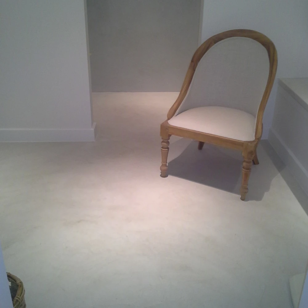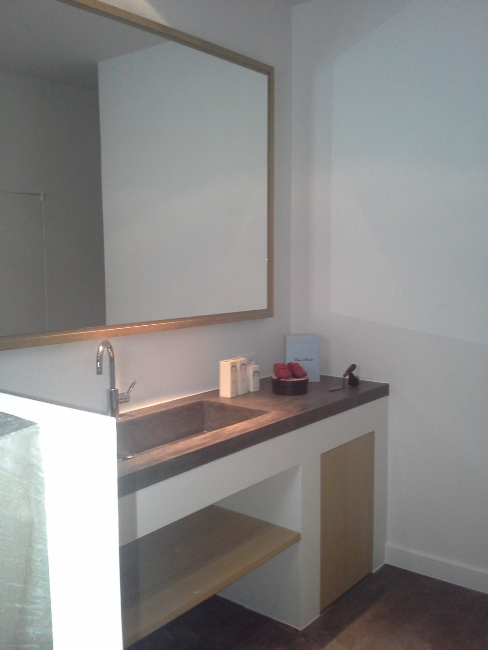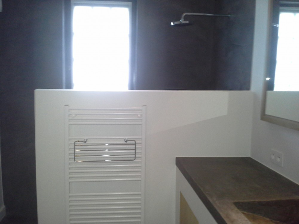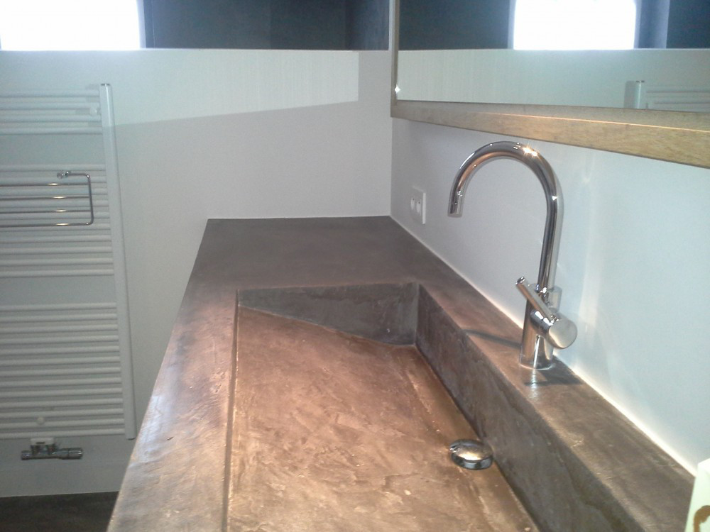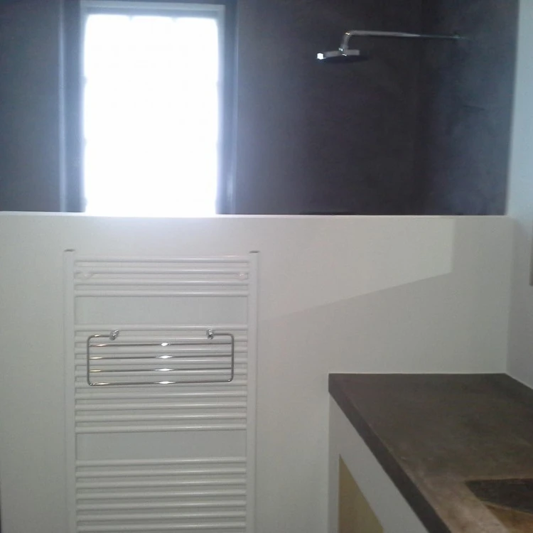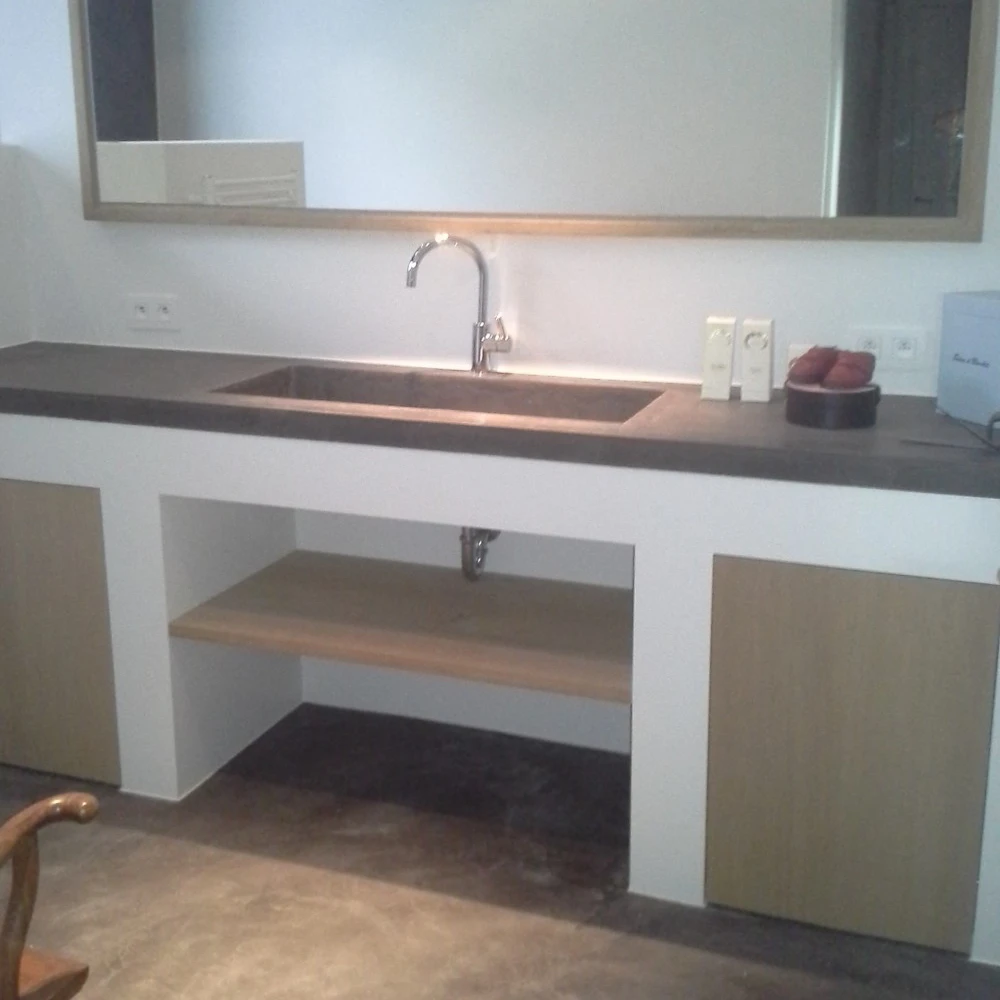 Zowel de vloeren, de douches, de badomkasting als het badmeubilair werden afgewerkt in Mortex.