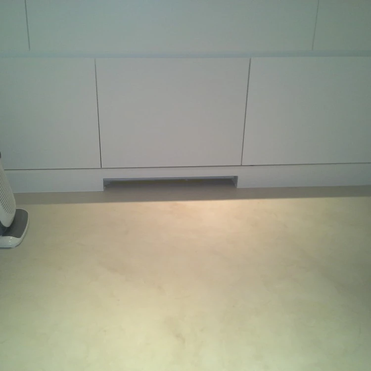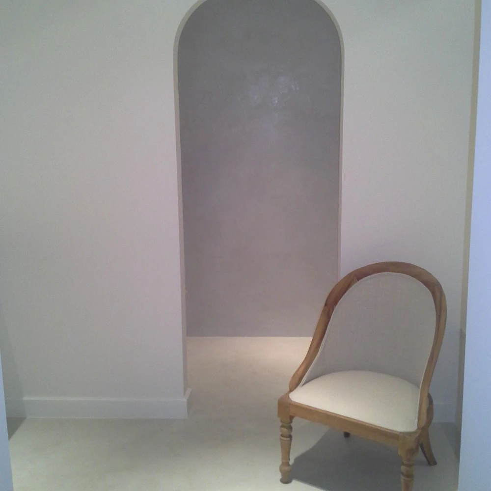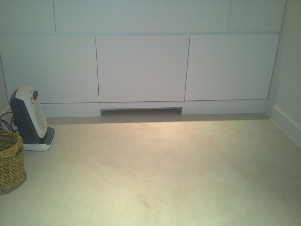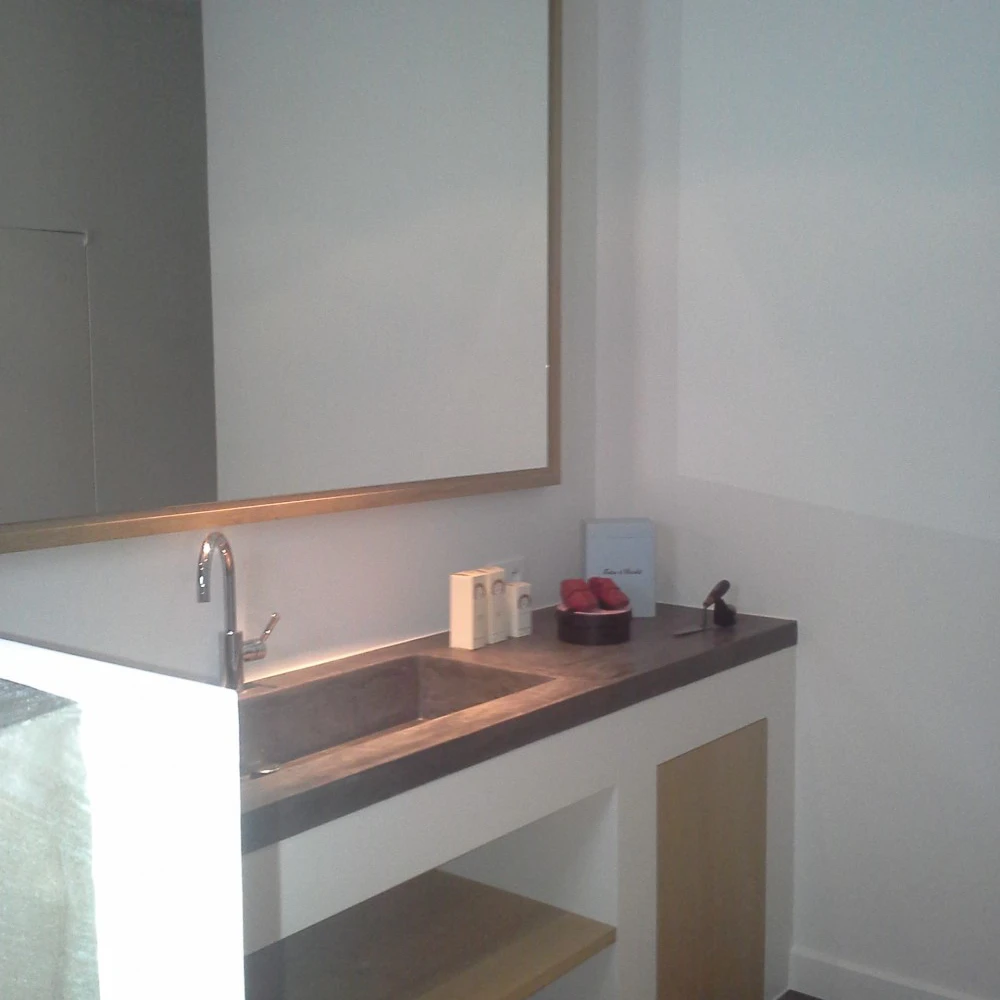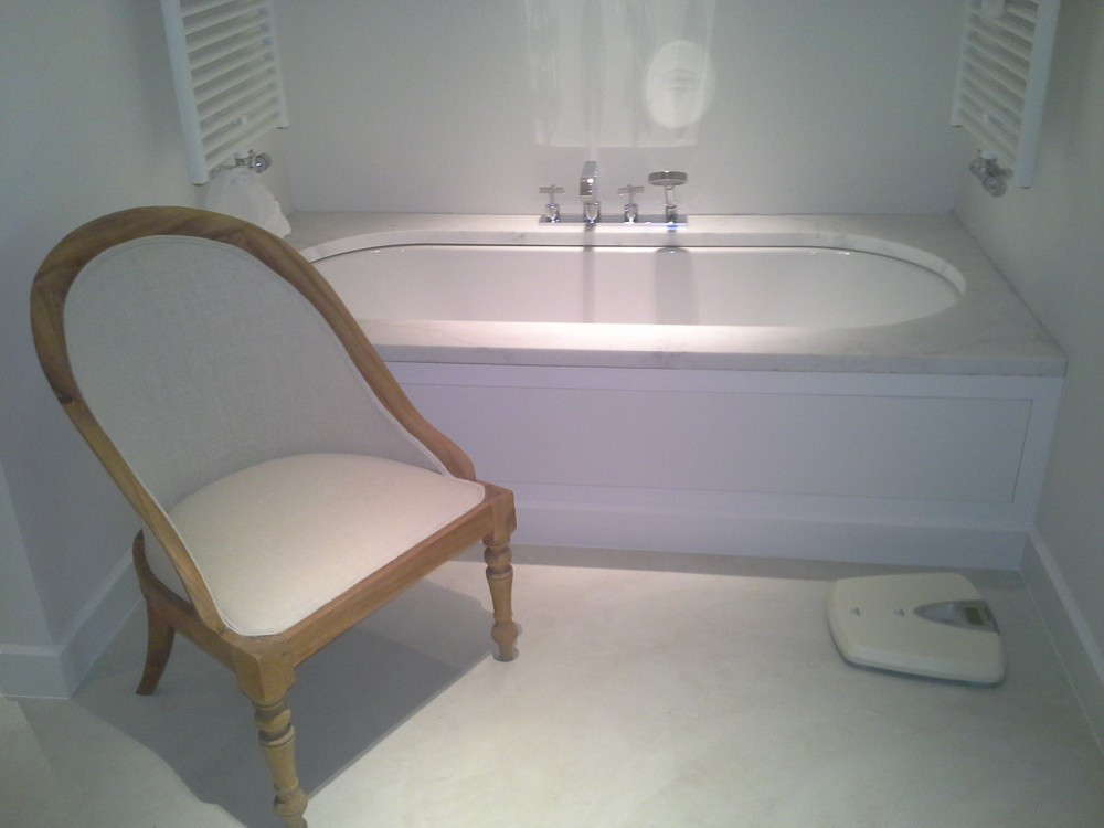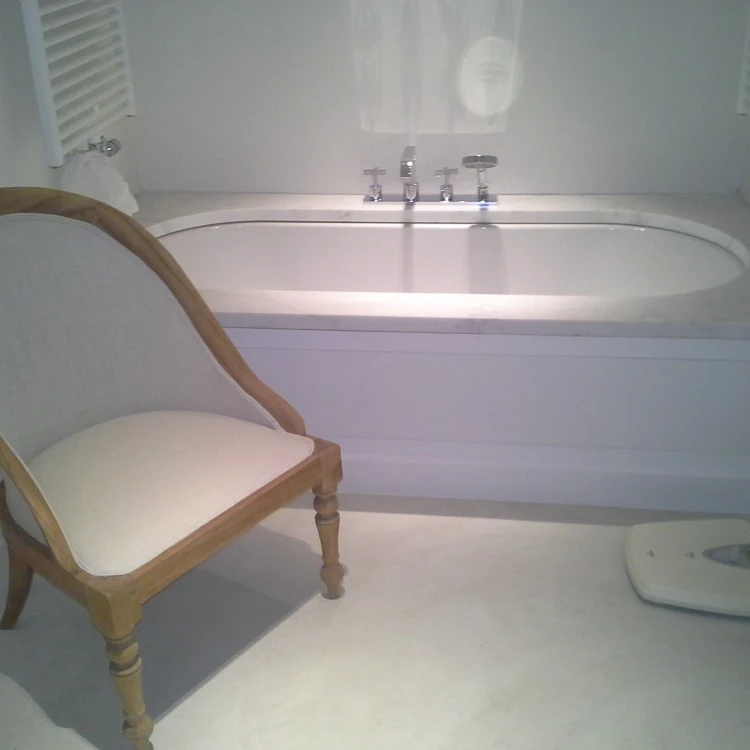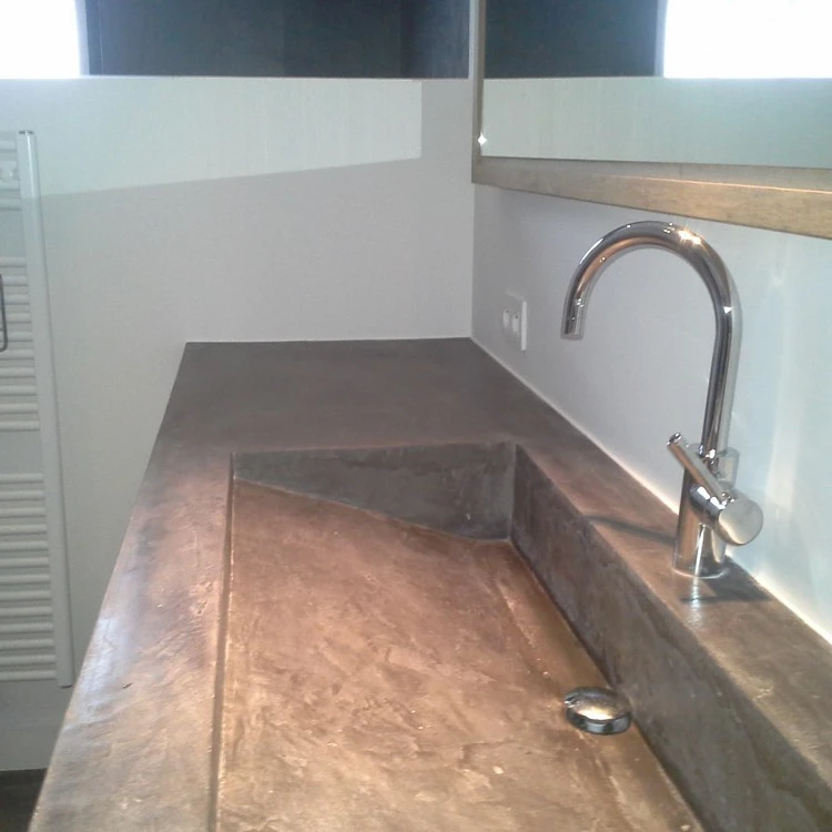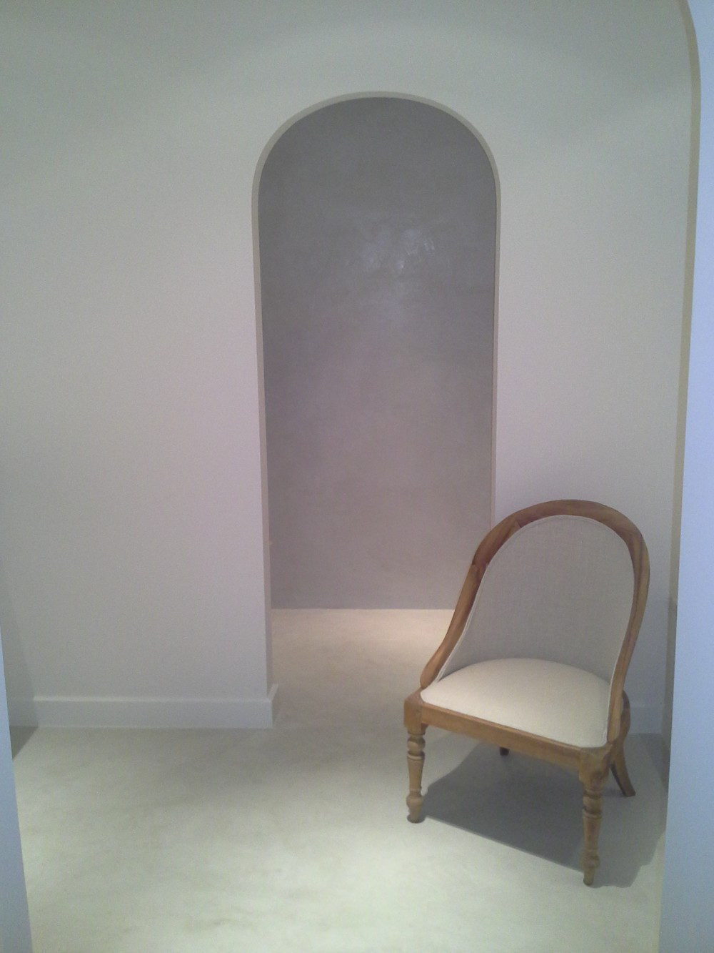 Zowel de vloeren, de douches, de badomkasting als het badmeubilair werden afgewerkt in Mortex.