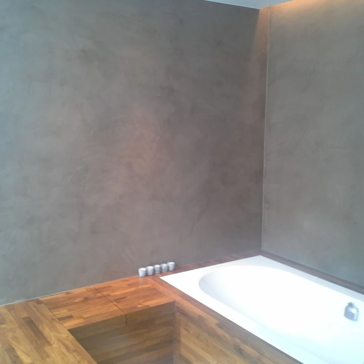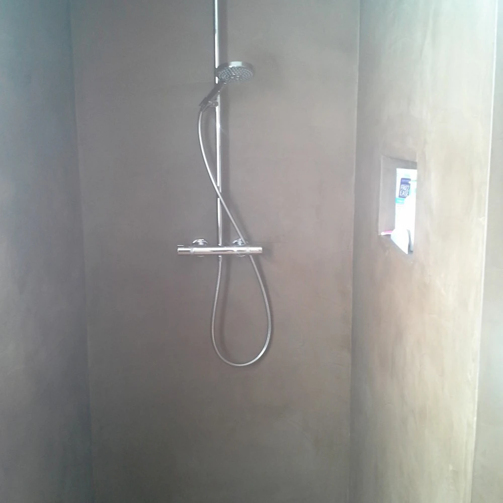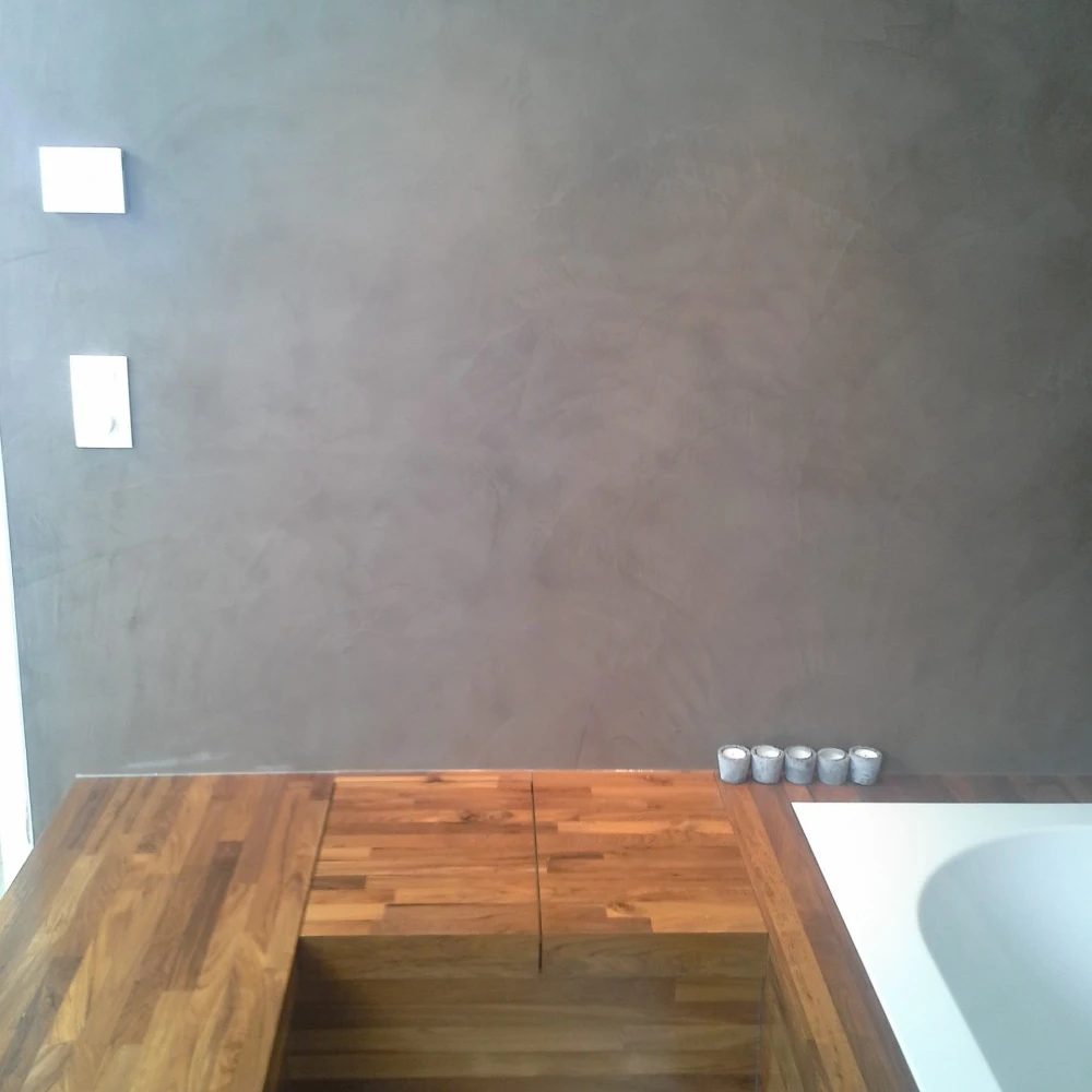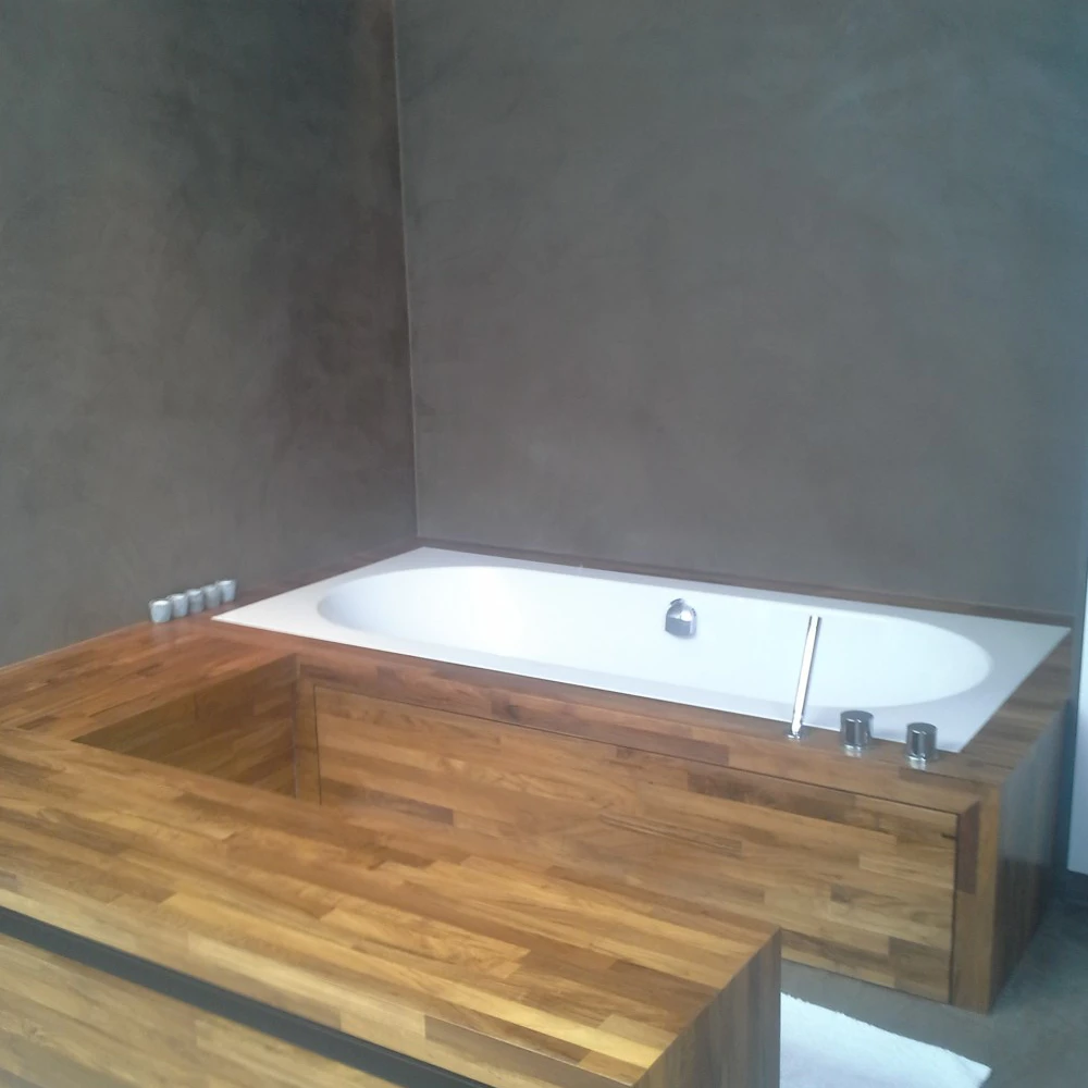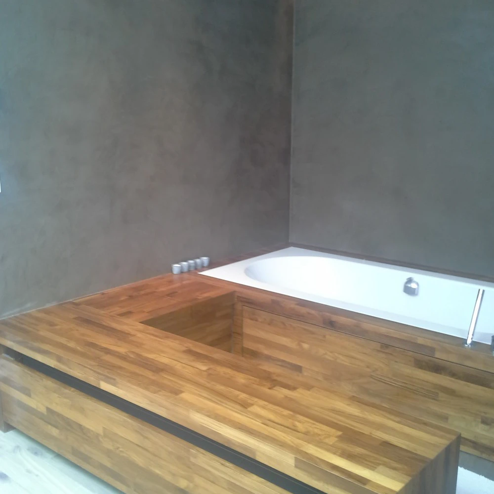 Hier werden de badkamerwanden, de douchewanden- en vloer uitgewerkt in Mortex.Het houten meubilair gaat zeer goed met de gekozen aardetint Mortex.