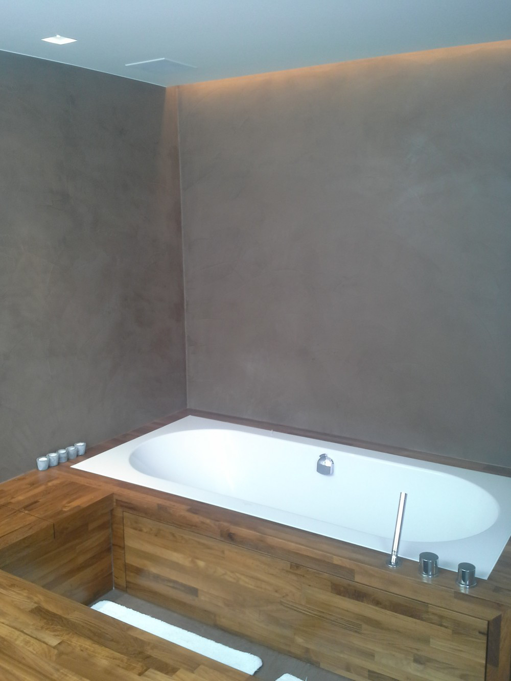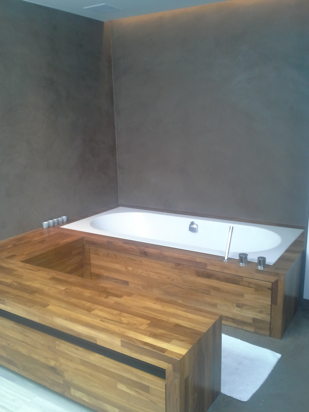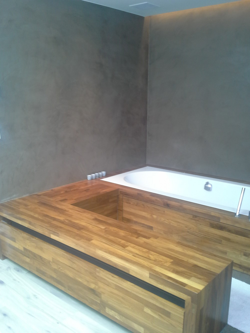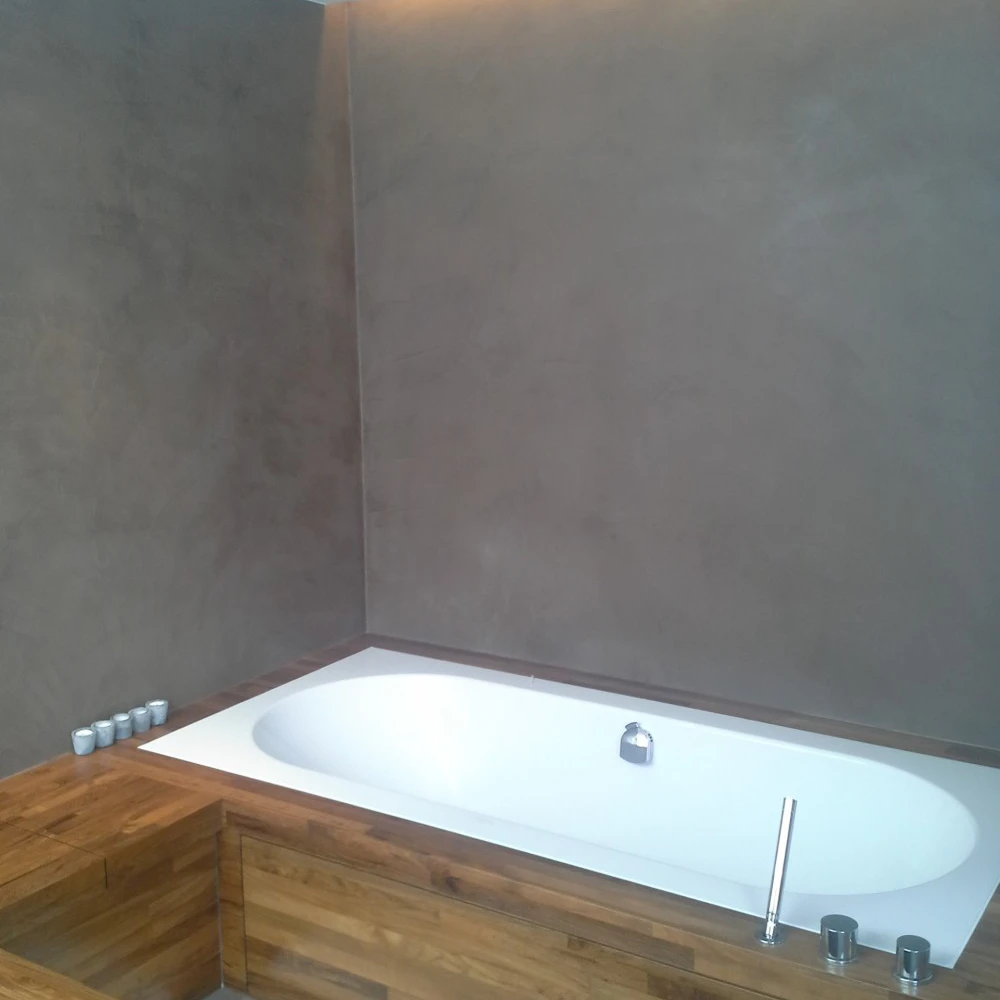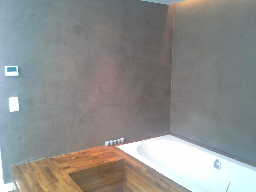 Hier werden de badkamerwanden, de douchewanden- en vloer uitgewerkt in Mortex.Het houten meubilair gaat zeer goed met de gekozen aardetint Mortex.