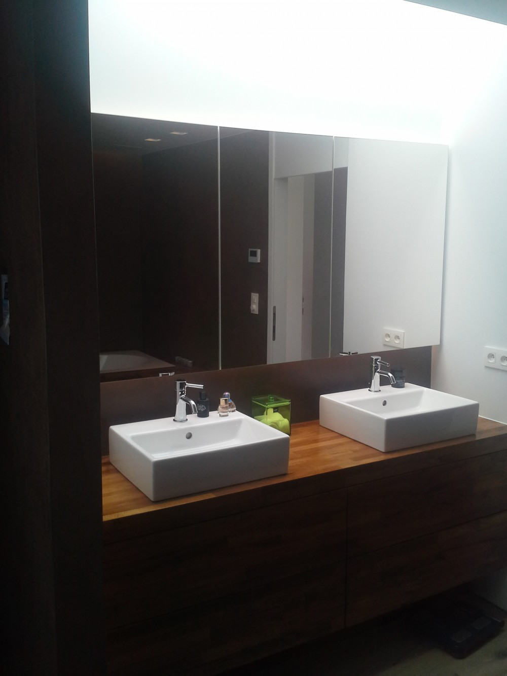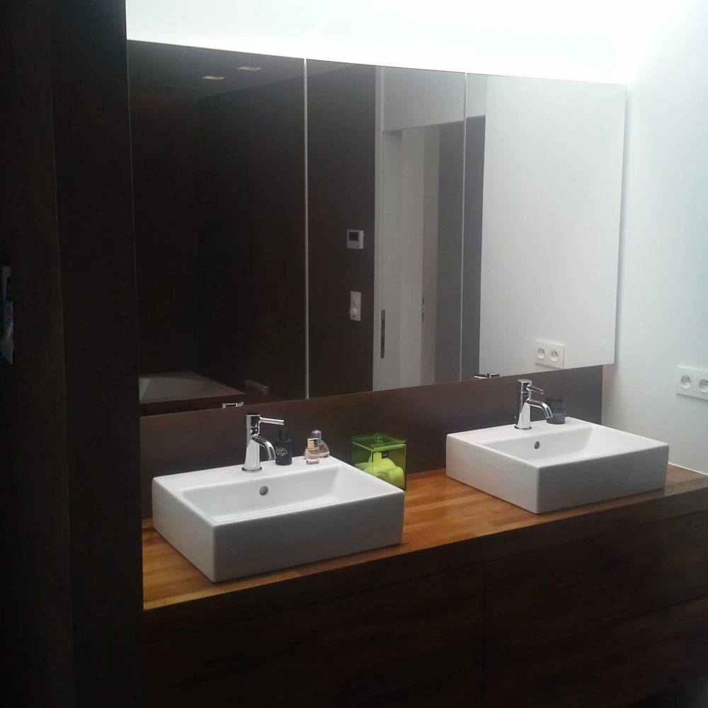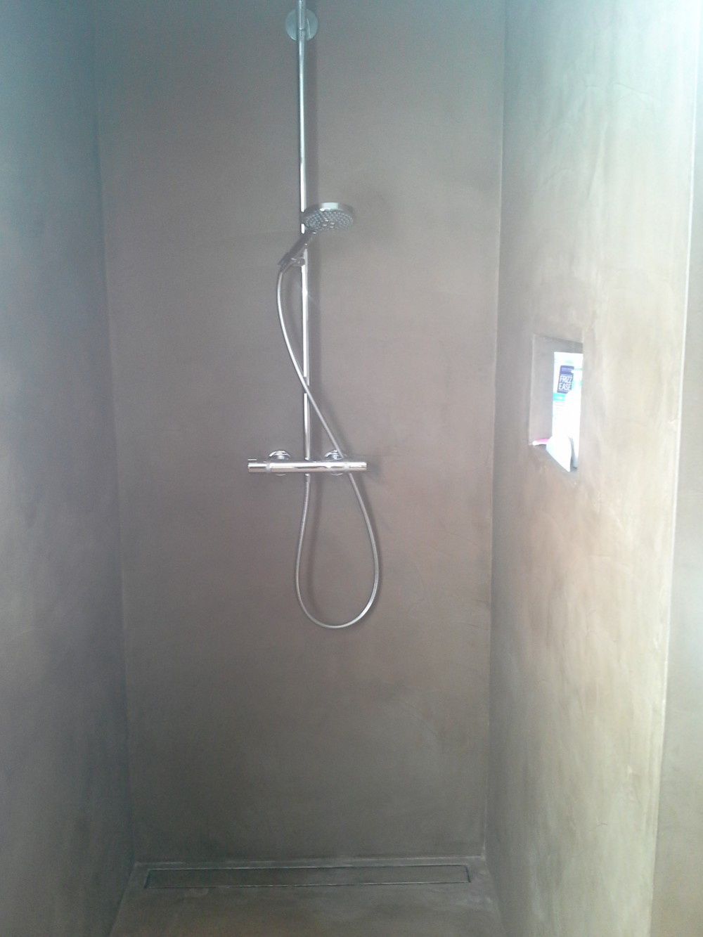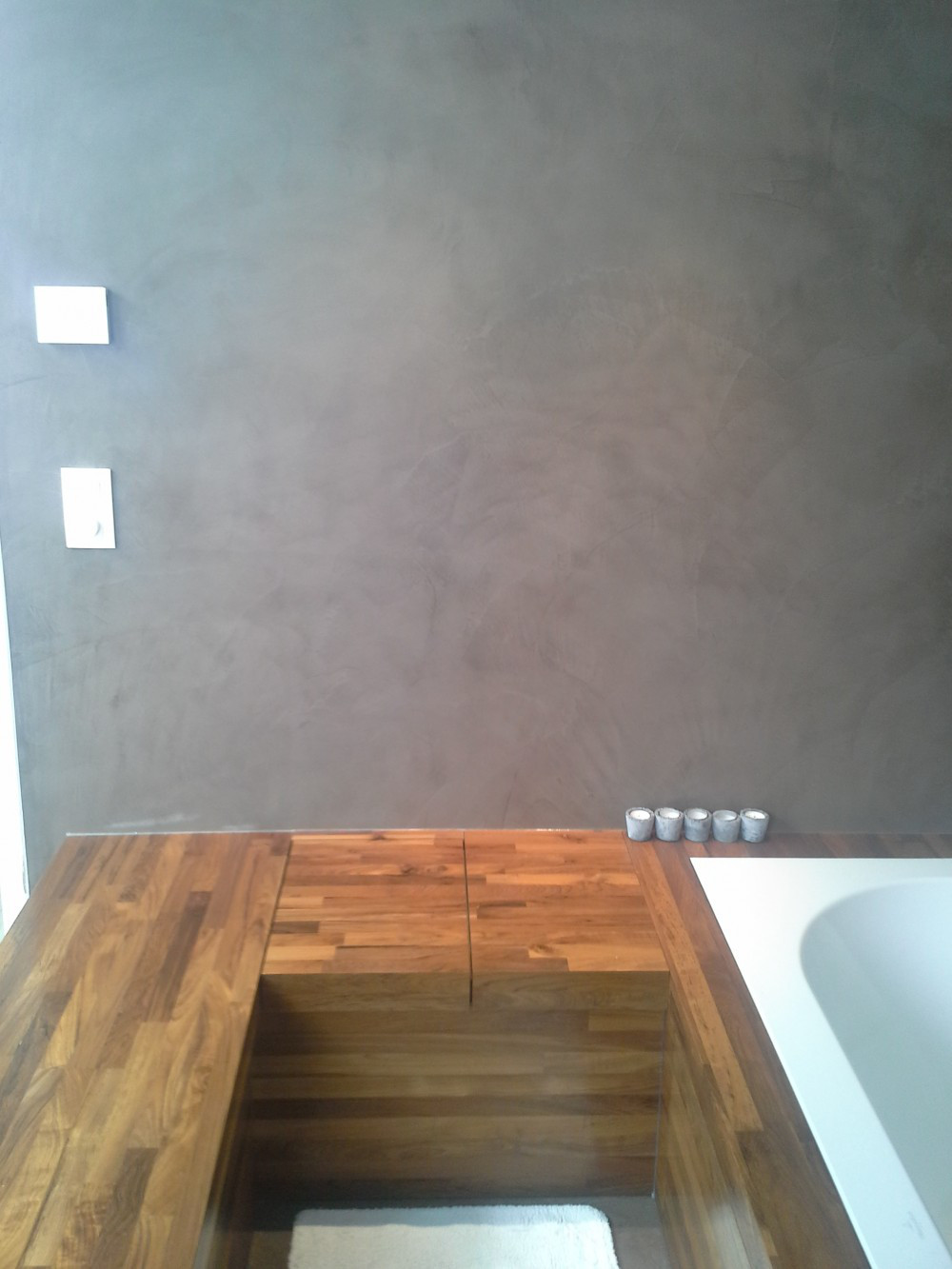 Hier werden de badkamerwanden, de douchewanden- en vloer uitgewerkt in Mortex.Het houten meubilair gaat zeer goed met de gekozen aardetint Mortex.