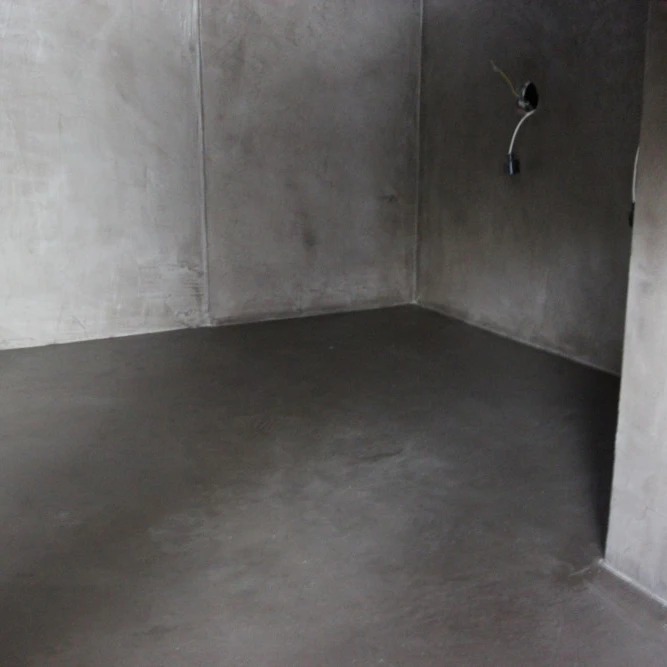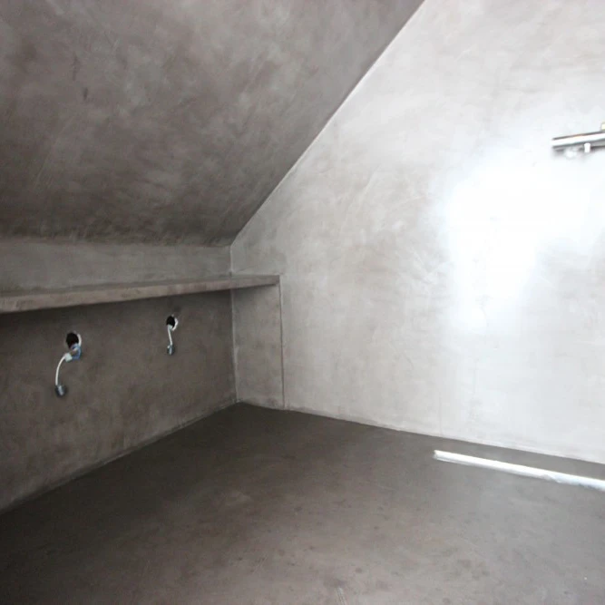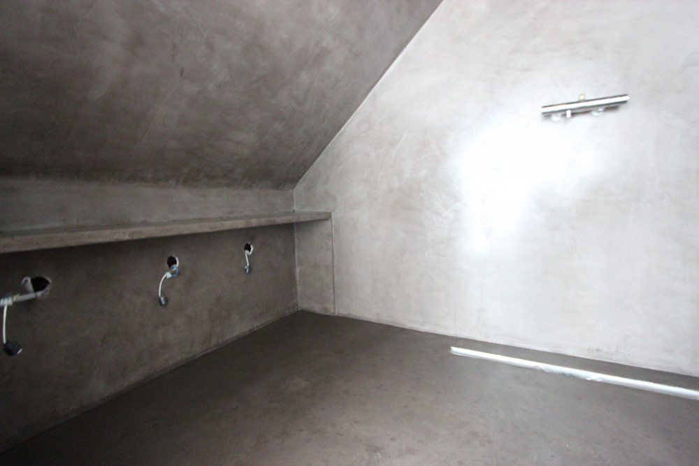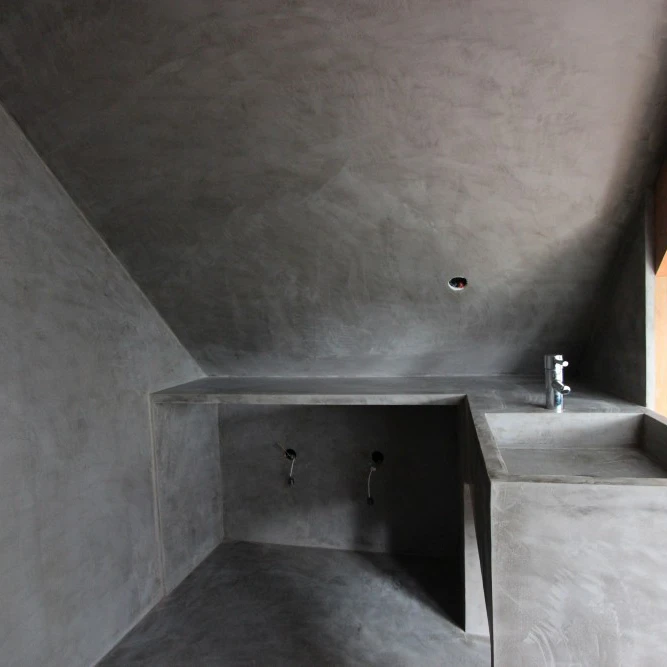 Zowel douche, schabben, vloer als meubel werden uitgewerkt in Mortex.