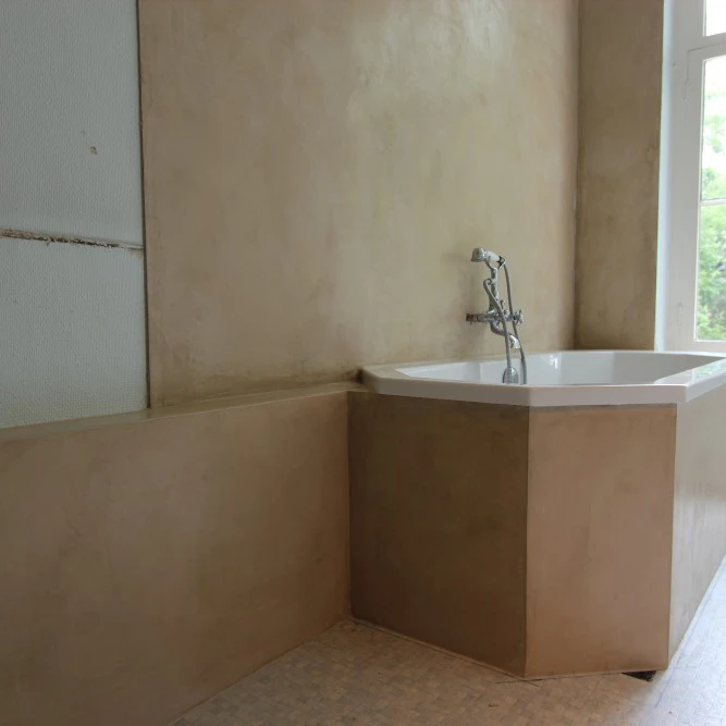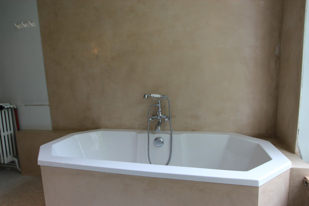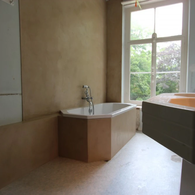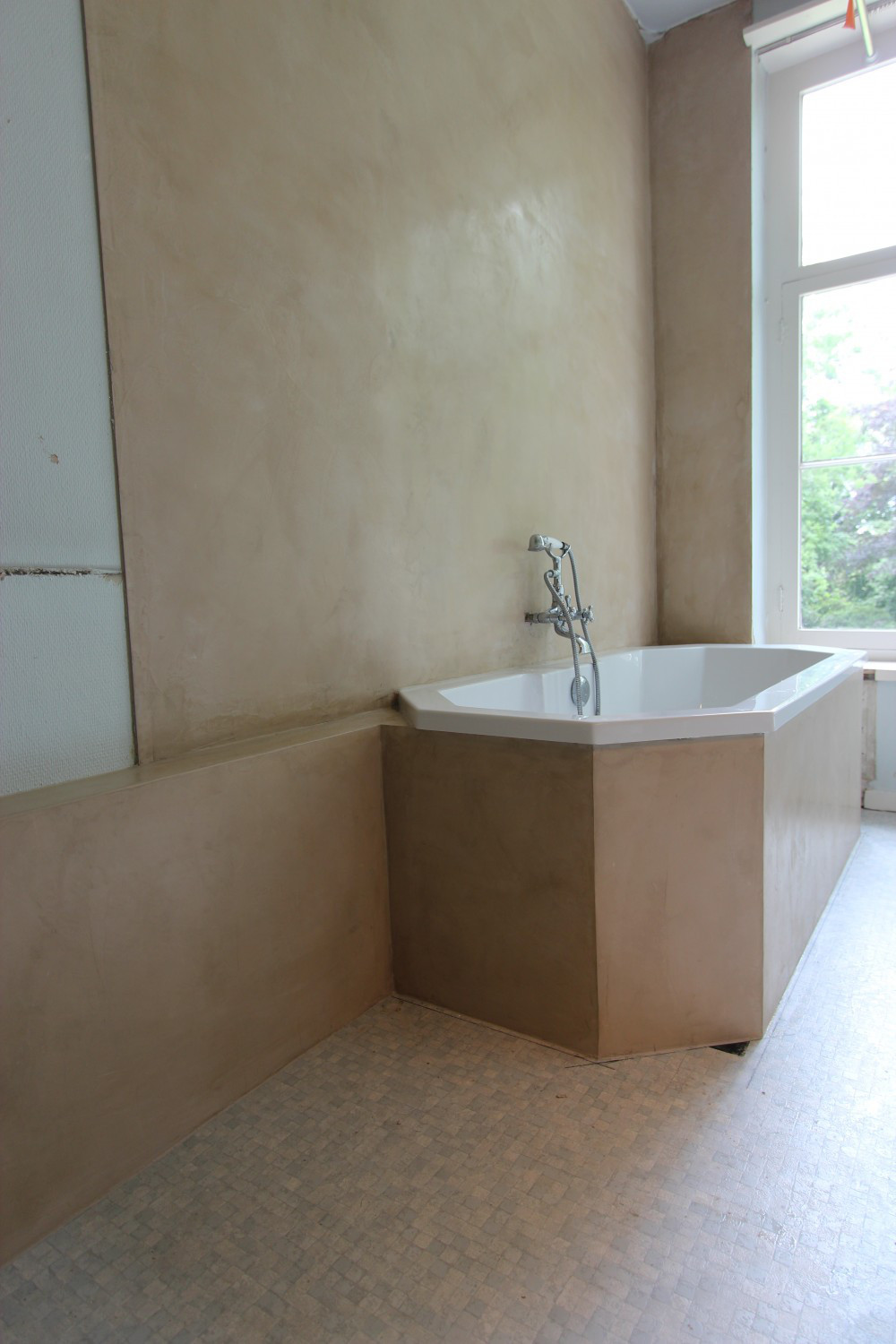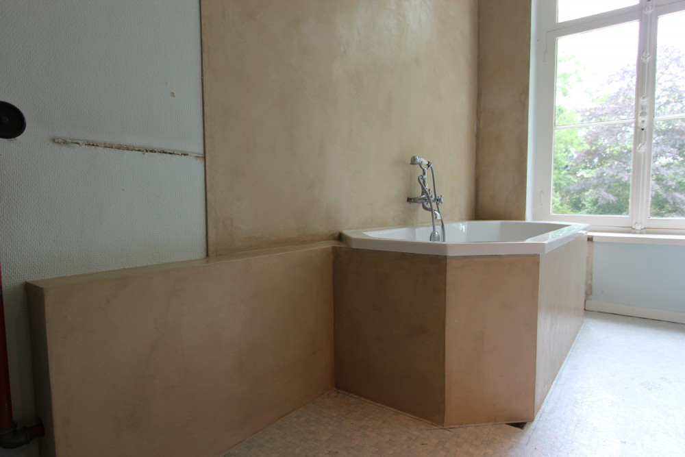 Rond het trapeziumvormige bad werd een badomkasting gemaakt.Zowel badomkasting als badwand werden afgewerkt met Mortex.