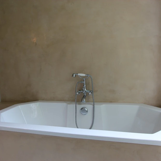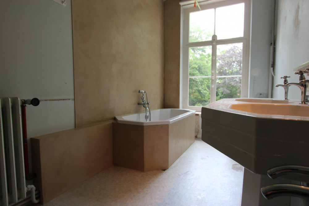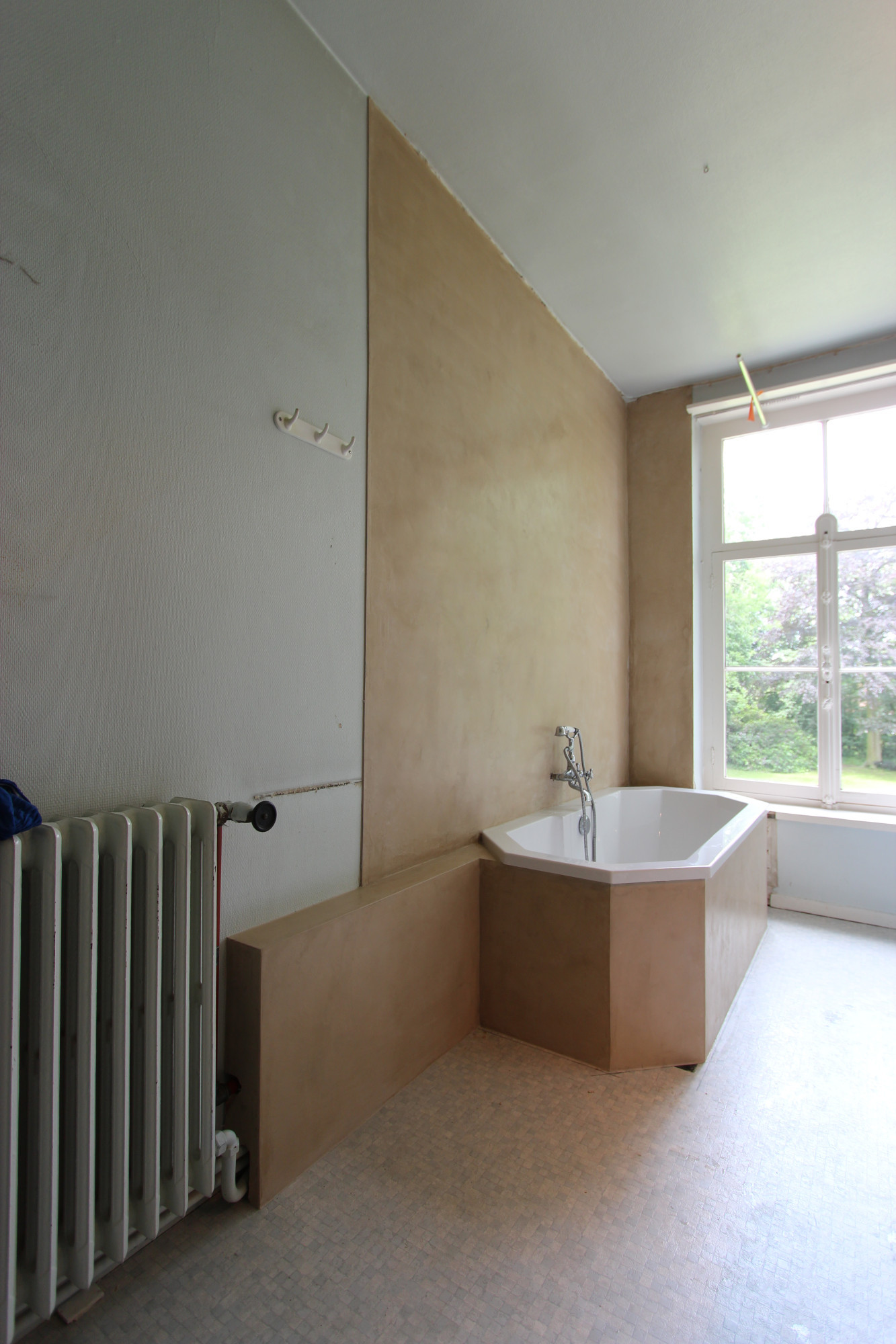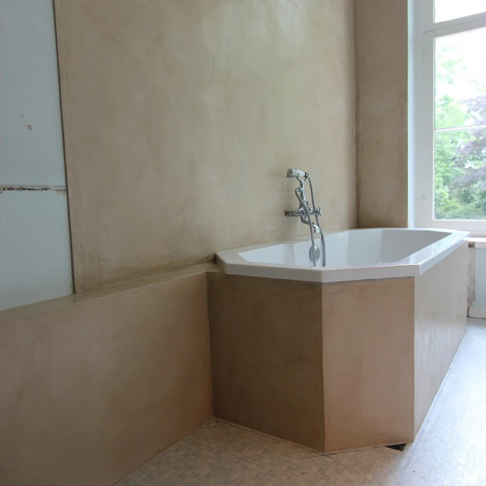 Rond het trapeziumvormige bad werd een badomkasting gemaakt.Zowel badomkasting als badwand werden afgewerkt met Mortex.