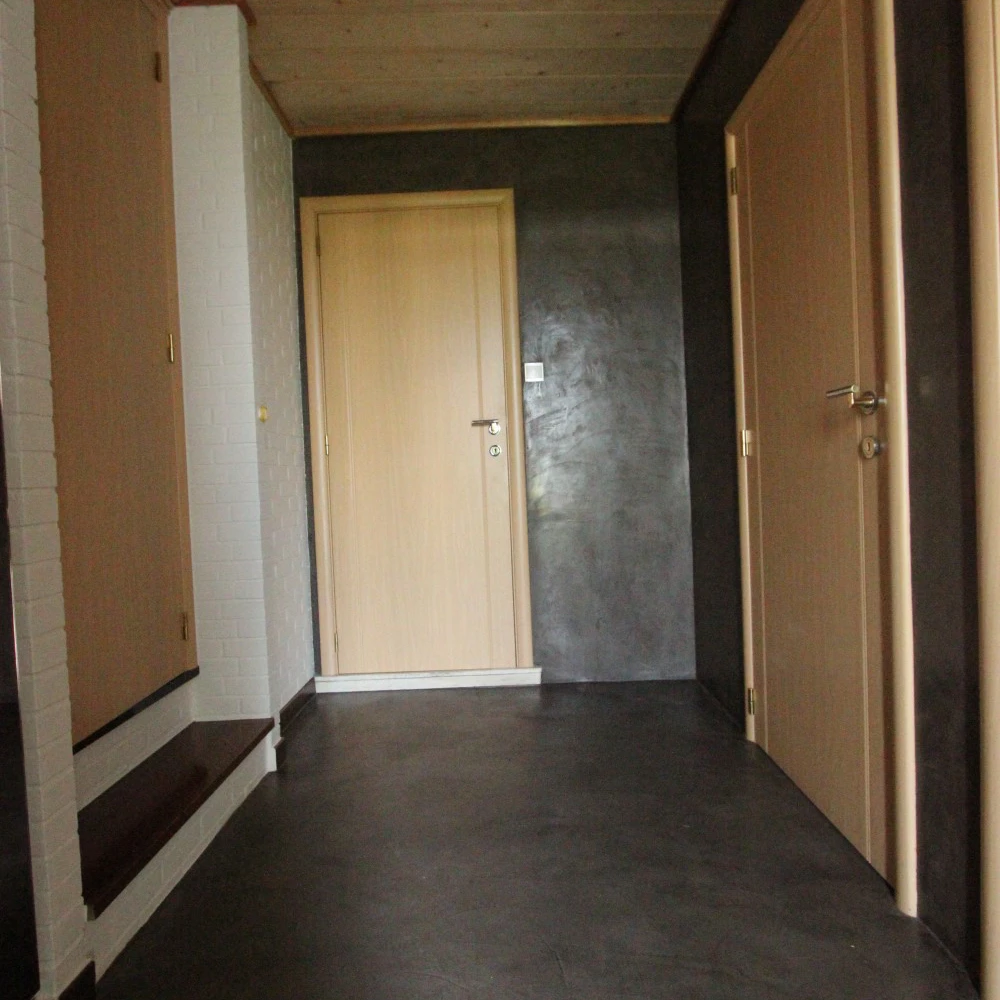 In de inkomhal werden 2 wanden en de vloer uitgewerkt in Mortex.