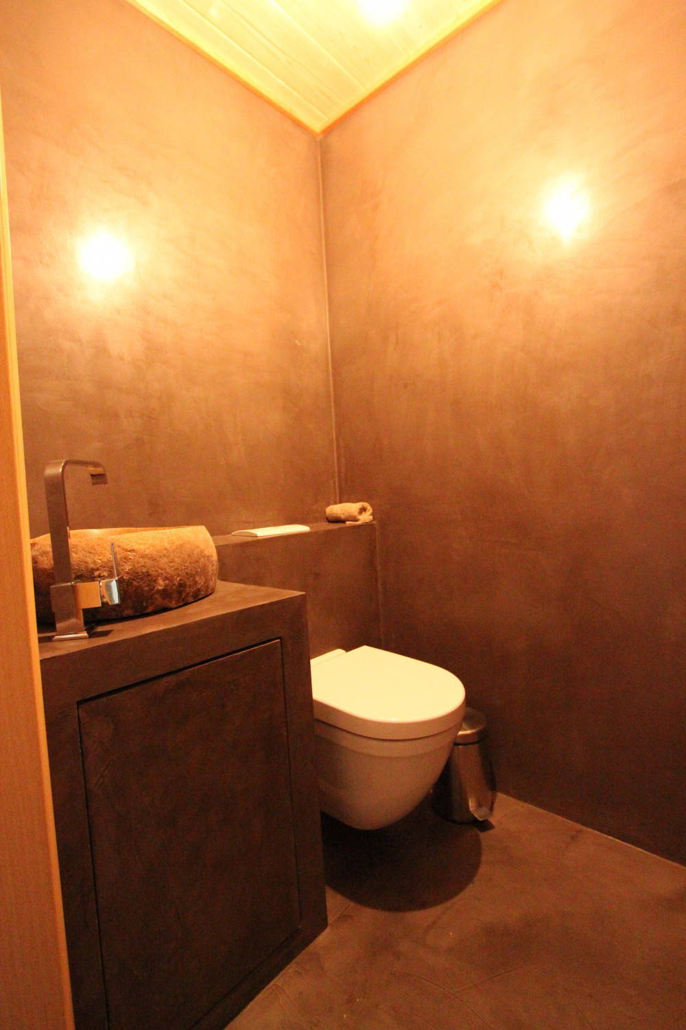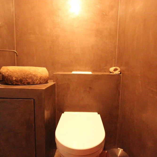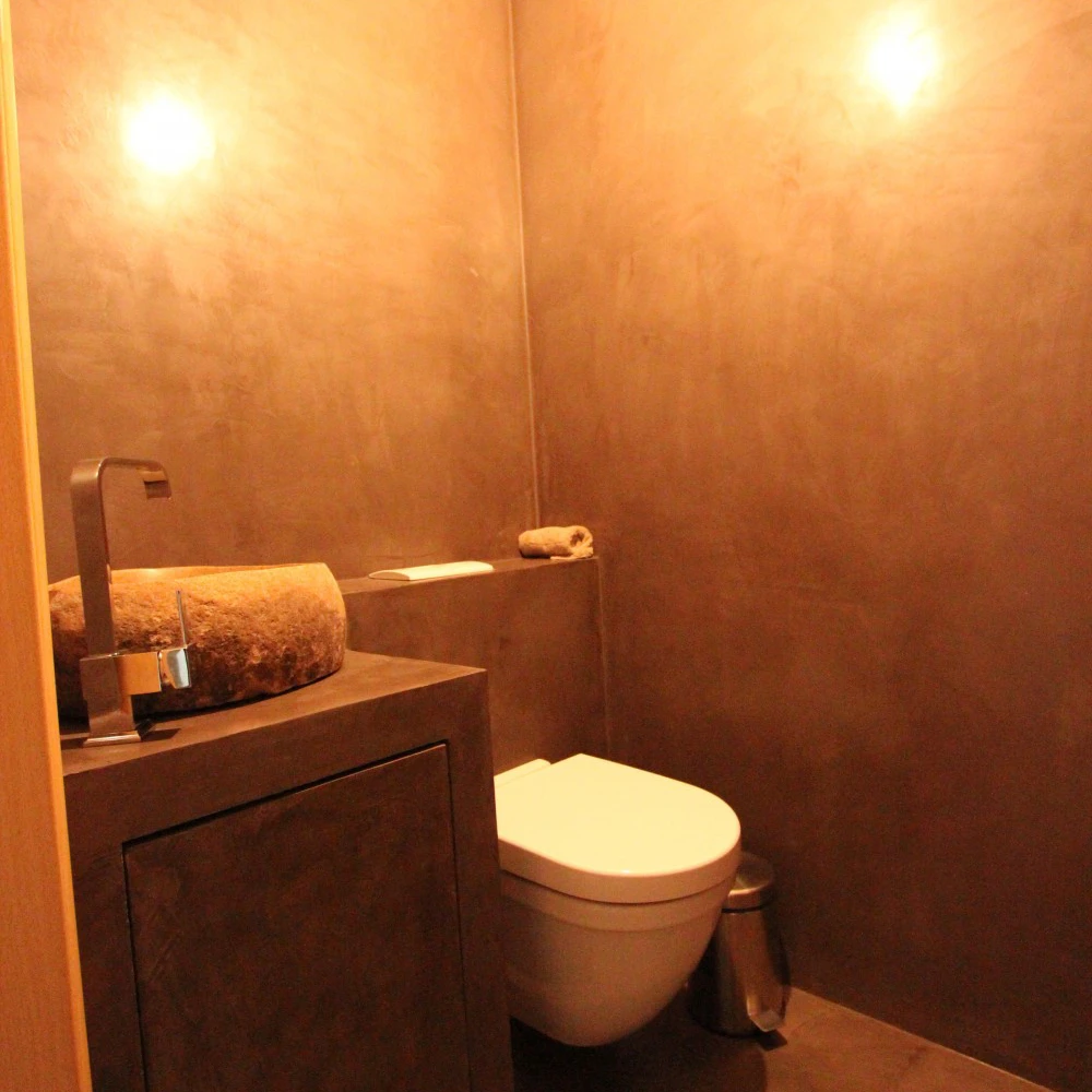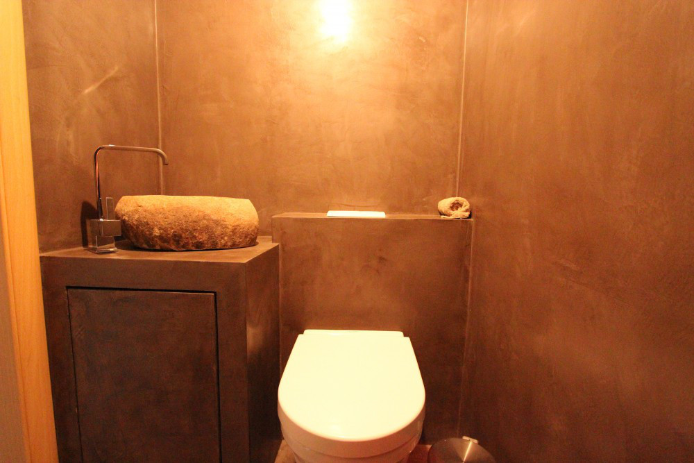 In de toiletruimte werden zowel vloer als wanden uitgewerkt in Mortex.