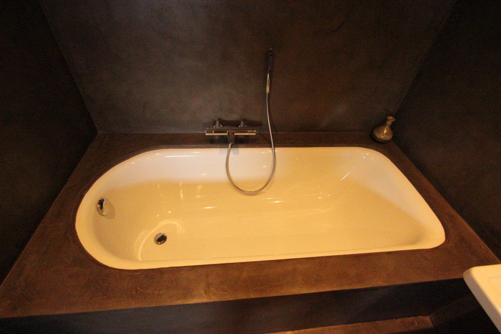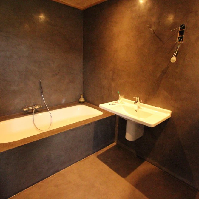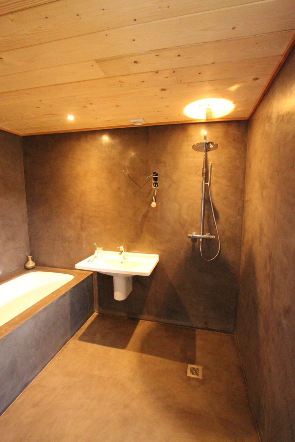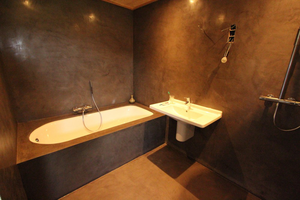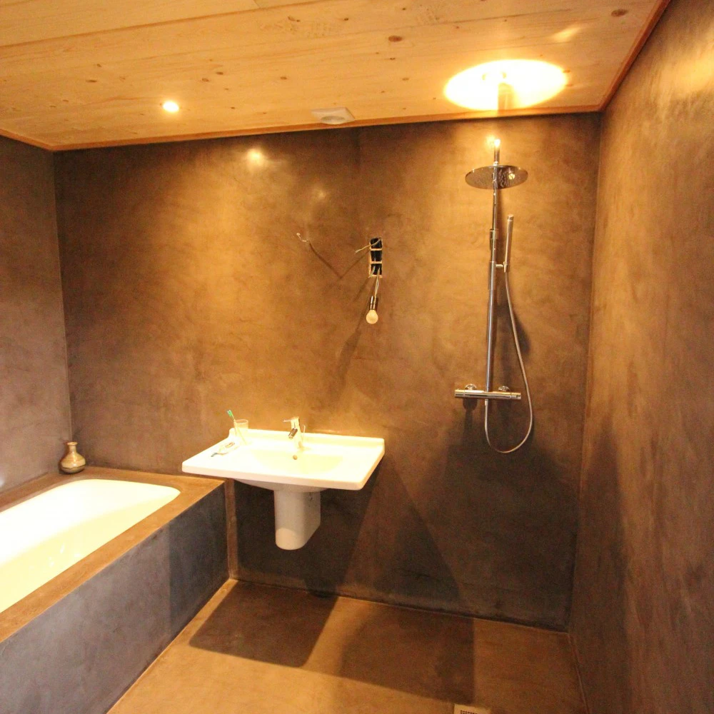 In de badkamer werden een deel van de wanden en de vloer afgewerkt met Mortex.