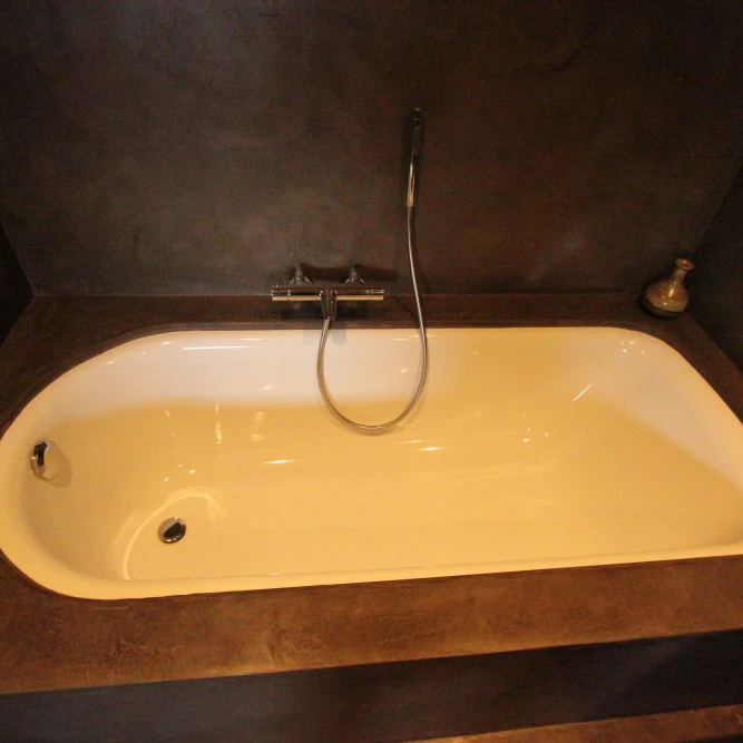 Wij hebben de omkadering rond het toilet en het lavabokastje uitgewerkt in MDF, daarna afgewerkt met Mortex.